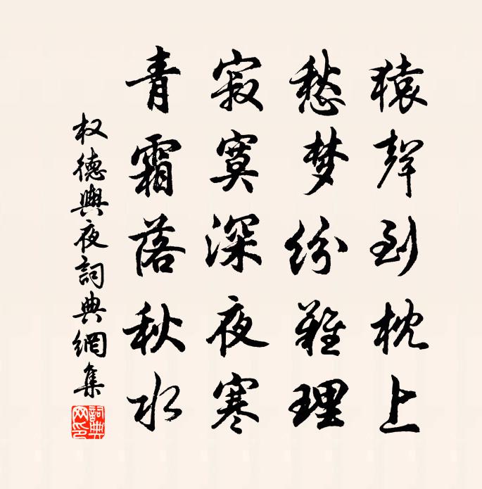 詩詞名句歷史字典書法欣賞書法字典國語詞典說文解字康熙字典古漢語字典標 題 作 者 詩 句 夜作者:權德輿 朝代:唐代夜原文猿聲到枕上,愁夢紛難理。寂寞深夜寒,青霜落秋水。詩詞問答問:夜的作者是誰?答:權德輿問:夜寫於哪個朝代?答:唐代問:夜是什麼體裁?答:五古權德輿夜書法欣賞夜書法作品注釋全唐詩:卷325-43詩詞推薦好事近黃公度〔宋代〕公嘗貽書台官,欲著私史以謗時政。蓋公之在泉幕也,嘗有啟賀李侍御文會云:“雖莫陪賓客後塵,為大廈之賀,贈庾十二朱版李商隱〔唐代〕固漆投膠不可開,贈君珍重抵瓊瑰。君王曉坐金鑾殿,只待相如草詔來。村居(四首選二)王冕〔元代〕其 一英雄在何處?氣概屬山家。蟻布出入陣,蜂排早晚衙;野花團部伍,溪村擁旗牙。抱膝長吟罷,天邊日又斜鳳簫吟(郊祀慶成)曹勛〔宋代〕列旂常。中宵天淨,郊丘展采圓蒼。肇禋三歲禮,聖天子為民,致福穰穰。凝旒親奠玉,粲珠聯、星斗垂芒。漸月偈頌七首釋亮〔宋代〕兩個屎橛,合作一團。熏天炙地誰能臭,千古叢林話端。游東林寺黃滔〔唐代〕平生愛山水,下馬虎溪時。已到終嫌晚,重遊預作期。寺寒三伏雨,松偃數朝枝。翻譯如曾見,白蓮開舊池。謝潘端叔惠紅梅樓鑰〔宋代〕殿後鞓紅色漫穠,絳桃空自笑春風。何人擊碎珊瑚樹,惱得瑤姬面發紅。偈頌一百二十三首釋普度〔宋代〕雨洗炎威,秋磨霄漢。風傳{左禾右罷}稏香,鼓腹寒岩畔。位轉功回木馬嘶,劫外不須重借伴。送人尉黔中周繇〔唐代〕盤山行幾驛,水路復通巴。峽漲三川雪,園開四季花。公庭飛白鳥,官俸請丹砂。知尉黔中後,高吟采物華。題曾運使水亭張明中〔宋代〕笥山之水磨銅綠,秀氣都在山之麓。就中卜築小仙居,面面軒亭看不足。主人倒屣浮春容,囊詩拶破古錦紅。書生夏日方回〔宋代〕多病情懷懶,新晴草木光。倦骸扶老瘦,幽徑息陰涼。家瘠盤餐儉,村荒糴價昂。豈無可憂者,得句暫能忘。題楚州聖井並贈主僧張耒〔宋代〕古佛勝妙力,一泓常湛然。禱祈供眾欲,守護賴師賢。清碧晨齋罷,秋登寶供前。自憐多病質,時許挹清泉。江城子張先〔宋代〕小圓珠串靜慵拈。夜厭厭。下重簾。曲屏斜燭,心事入眉尖。金字半開香穗小,愁不寐,恨西蟾。風入松(聞鄰女吹笛)高觀國〔宋代〕粉嬌曾隔翠簾看。橫玉聲寒。夜深不管柔荑冷,櫻朱度、香噴雲鬟。霜月搖搖吹落,梅花簌簌驚殘。蕭郎且放鳳簫奉和華清宮觀行香應制崔國輔〔唐代〕天子蕊珠宮,樓台碧落通。豫游皆汗漫,齋宮即崆峒。雲物三光里,君臣一氣中。道言何所說,寶曆自無窮。送舶使周申李昴英〔宋代〕堂堂山立舊朝簪,久屈清流督獻琛。風赴連艘出獅國,浪吹殘句到雞林。平生不隔同年面,中歲難禁惜別心。歸見題乾洞連文鳳〔宋代〕何人鑿破雲煙壑,百丈雲煙生節角。解衣盤礴坐山風,一片松花半空落。次韻戴成叔陳著〔宋代〕鑿池引山泉,泉脈來擾擾。池上有新亭,池下芰荷繞。色香兩超絕,天然本非矯。花開日開宴,醉里人世早。晚宿村居王洋〔宋代〕早趁林鴉泊,荒籬四面同。田夫留古意,野水識和風。倦仆欺予遠,疲輿念汝功。爾嫌冬日促,吾興在寒空。挽沈漕宜之父主管彭龜年〔宋代〕蟬蛻軒裳早,冰融義理深。但知捐世累,誰復識公心。宇宙終埋玉,哀榮有賜金。遙憐九原上,煙雨暗寒林。名句推薦天時懟兮威靈怒,嚴殺盡兮棄原野。屈原《國殤》 綠陰青子老溪橋。羞見東鄰嬌小。吳文英《西江月·賦瑤圃青梅枝上晚花》 當年得意如芳草。日日春風好。辛棄疾《虞美人·賦虞美人草》 母信者,其子必仁。劉向《列女傳·節義傳·楚昭越姬》 離情被橫笛,吹過亂山東。王安石《江上》 流星透疏木,走月逆行雲。賈島《宿山寺》 寬而栗,柔而立,愿而恭,亂而敬,擾而毅,直而溫,簡而廉,剛而塞,強而義。佚名《尚書·虞書·皋陶謨》 春風江上路,不覺到君家高啟《尋胡隱君》 漉我新熟酒,只雞招近局。陶淵明《歸園田居·其五》 茅檐人靜,蓬窗燈暗,春晚連江風雨。陸游《鵲橋仙·夜聞杜鵑》
