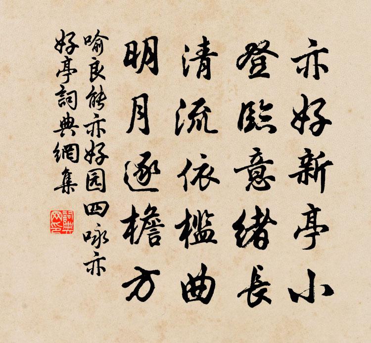 詩詞名句歷史字典書法欣賞書法字典國語詞典說文解字康熙字典古漢語字典標 題 作 者 詩 句 亦好園四詠亦好亭作者:喻良能 朝代:宋代亦好園四詠亦好亭原文亦好新亭小,登臨意緒長。清流依檻曲,明月逐檐方。詩詞問答問:亦好園四詠亦好亭的作者是誰?答:喻良能問:亦好園四詠亦好亭寫於哪個朝代?答:宋代喻良能亦好園四詠亦好亭書法欣賞亦好園四詠亦好亭書法作品詩詞推薦蜻蜓浦夜泊陸游〔宋代〕風雨忽如秋已深,短篷今夜系楓林。溪翁那問市朝事,蔬食不生杯炙心。橫截煙波飛健鶻,遠投沙渚落羈禽。斯游張宮苑拜嘉州刺史知恩州宋祁〔宋代〕二年同守夢刀城,遙節初為北道行。飛將負才曾捕虜,伏波見上數論兵。劍南剩臘梅迎使,塞下新春柳映營。貴寵頌古釋德淳〔宋代〕昨日定今日不定,正令已行皆逐正。卓下靈山皂纛旗,百萬麾軍皆乞命。冬日放言二十一首張耒〔宋代〕葛公蓋世才,功業亦云偶。世無左將軍,老作躬耕叟。皇天挺奇產,必使有所受。珠玉在山淵,終為王府有。中夜睡覺兩目每有光如初日曆歷照物晁文元公陸游〔宋代〕人情所願欲,莫若貴與富。是皆有命焉,非力可成就。予昔未有聞,無與發其覆。趑趄強幹祿,時命適大謬。方行弈棋二首呈任公漸黃庭堅〔宋代〕偶無公事負朝暄,三百枯棋共一樽。坐隱不知岩穴樂,手談勝與俗人言。簿書堆積塵生案,車馬淹留客在門。戰勝送蜀僧周賀〔唐代〕萬里獨行無弟子,惟齎筇竹與檀龕。看經更向吳中老,應是山川似劍南。景祐親郊三聖並侑二首仁宗〔宋代〕皇基締構,帝系靈長。躬度攀發,子孫保昌。題湖上僧房釋智圓〔宋代〕深隱遠城郭,平湖景色閒。苦吟終夜月,清夢徹寒山。徑冷秋苔合,庭幽岳鳥還。紅塵趨競者,誰得扣松關。觀闍梨庵高樹梅花盛發一首蘇籀〔宋代〕臞儒花裓戒,疇昔井眉箴。危綠擅丘壑,攢叢薌弁簪。殷勤蒔芳墢,浪莽縱疏森。迥映晴空馥,乘凌陰霰任。狂儔訴衷情侯善淵〔元代〕眾生薄福樂真聞。精進謹持功。修齋坐禪禮念,終久落頑空。真實相,有無中。好家風。玄元宗祖,太始門開,體松聲楊萬里〔宋代〕喔詩口角恰微鳴,喚得風從月脅生。端為先生醒醉耳,繞山搜出萬松聲。賢侍者號木翁釋智愚〔宋代〕錄曲輪囷兒似痴,春風化鳥自忘機。年來老大混無用,一任叢林鼓是非。寄弟會等石介〔宋代〕吾門何所喜,子衿青青多。豹常志古道,佩服卿與軻。平淑號能賦,其氣典以和。樞從吾日久,道德能切磋。澤也和魯如晦七夕王之道〔宋代〕乞巧誰家綺席開,夜闌簫鼓趁虛催。啟明不為牽牛計,又放朝陽送曙來。琴調相思引(越上賞花)汪元量〔宋代〕曉拂菱花巧畫眉。猩羅新翦作春衣。恐春歸去,無處看花枝。已恨東風成去客,更教飛燕舞些時。惜花人醉,頭上頌古三十一首釋玿〔宋代〕北禪夜分歲,特地巧安排。維那出只手,線去又絲來。田郎催拍板,鮑老舞三台。若教行正令,活作一坑埋。壽馬裕齋觀文右東山,二章,章四句陳著〔宋代〕我徂東山,以敖以游。彼采葛兮,謂我何求。再用舊韻寄孔毅甫黃庭堅〔宋代〕鑒中之發蒲柳望秋衰,眼中之人風雨俱星散。往者托禮同青山,健者漂零不相見。庾公樓上有詩人,平生落筆瀉河雨夜陸游〔宋代〕斷岸輕煙著柳條,孤村小雨夜蕭蕭。荒雞隔浦聲相續,短燭無風焰自搖。樸學元知縻歲月,殘生竟是老漁樵。最憐名句推薦人面不知何處去,桃花依舊笑春風。崔護《題都城南莊》 壯歲從戎,曾是氣吞殘虜。陸游《謝池春·壯歲從戎》 不勁直,不能矯奸。韓非及後人《韓非子·孤憤》 一身報國有萬死,雙鬢向人無再青。陸游《夜泊水村》 易醉扶頭酒,難逢敵手棋。賀鑄《南歌子·疏雨池塘見》 秋送新鴻哀破國,晝行飢虎齧空林。鄭思肖《二礪》 今日獨來香徑里,更無人跡有苔錢。韓偓《寒食日重遊李氏園亭有懷》 望千門如晝,嬉笑遊冶。周邦彥《解語花·上元》 柳下桃蹊,亂分春色到人家。秦觀《望海潮·洛陽懷古》 愛之如父母, 仰之如日月,敬之如鬼神,畏之如雷霆姚察、姚思廉《梁書·列傳·卷三十八》