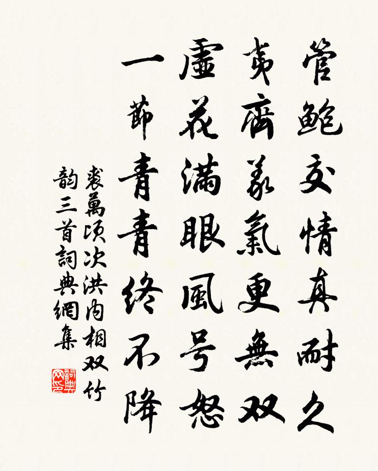 詩詞名句歷史字典書法欣賞書法字典國語詞典說文解字康熙字典古漢語字典標 題 作 者 詩 句 次洪內相雙竹韻三首作者:裘萬頃 朝代:宋代次洪內相雙竹韻三首原文管鮑交情真耐久,夷齊義氣更無雙。虛花滿眼風號怒,一節青青終不降。詩詞問答問:次洪內相雙竹韻三首的作者是誰?答:裘萬頃問:次洪內相雙竹韻三首寫於哪個朝代?答:宋代裘萬頃次洪內相雙竹韻三首書法欣賞次洪內相雙竹韻三首書法作品詩詞推薦奉和嚴司空重陽日同崔常侍崔郎及諸公登龍山落帽台佳宴令狐楚〔唐代〕謝公秋思渺天涯,蠟屐登高為菊花。貴重近臣光綺席,笑憐從事落烏紗。萸房暗綻紅珠朵,茗碗寒供白露芽。詠碎氏州第一鄭熏初〔宋代〕開遍來禽,春事過也,江南倦客心苦。料理花愁,銷磨酒病,還是年時意緒。寒淺香輕,早一霎、朝來微雨。柳曲贈無咎以既見君子云胡不喜為韻八首張耒〔宋代〕文風還正始,磊落有諸君。長者進後生,亦使我有聞。譬如狸與虎,偶使並稱文。終然不可及,困我力空勤。陪致政開府太師留守相公致內翰燕集輒歌盛美司馬光〔宋代〕眉似高僧秀,顏如童子紅。忠純汲長孺,高潔夏黃公。矯矯遼東鶴,冥冥塞北鴻。自誇新酒量,豫想百分空。送從子令憲西歸魏了翁〔宋代〕茆檐竹几對床頭,晨暮參商未渠休。寧用停雲乙親友,是身安健復何憂。陳彌高惠詩次韻言謝一首王阮〔宋代〕南來日日訪人才,始得清詩副所懷。我計已成桴入浮,君行初似橘逾淮。十年旅夢思乘興,千里征塵忽及階。見說別吳衛道胡宏〔宋代〕學業應須見本根,語言無用苦評論。醇醪自昔懷公瑾,藥石誰今識孟孫。憑仗嬉遊試功力,堤防色厲卻淫昏。臨岐贈韓定辭馬彧〔唐代〕燧林芳草綿綿思,盡日相攜陟麗譙。別後巏嵍山上望,羨君時復見王喬。新添聲楊柳枝詞裴諴〔唐代〕思量大是惡姻緣,只得相看不得憐。願作琵琶槽那畔,得他長抱在胸前。獨房蓮子沒有看,偷折蓮時命也拌。若有題愚齋楊時〔宋代〕結廬依林丘,回峰爭盤紆。下闞清池淵,憑軒數游魚。飛閣出雲表,浮煙襲簪裾。中有傲世士,脫略自謂愚。高義過臨江史彌寧〔宋代〕嘉定有八禩,三月哉生明。史子說吏鞅,超然若登瀛。釃酒渡清江,風帆引歸程。僮奴忽報我,重客來相迎。推篷居擬蘇武四首汪元量〔宋代〕皎皎雲間月,灼灼我室閭。酣歌美長夜,清輝麗高隅。征夫許報國,將使萬里途。是時吹寒風,晨起驅行車。仰視驀山溪(甲辰生日)張綱〔宋代〕小窗開宴,草草杯盤具。歡喜走兒童,慶生朝、一年一度。風光好處,恰是小春時,香泛泛,酒醺醺,一曲歌金縷秋蕊香趙希〔宋代〕髻穩冠宜翡翠。壓鬢彩絲金蕊。遠山碧淺蘸秋水。香暖榴裙襯地。亭亭二八餘年紀。惱春意。玉雲凝重步塵細。獨寄徐季純於去非兼屬梁和仲曾元之吳仲權趙蕃〔宋代〕西來政爾嘆離居,數士英英端起予。情話不遺親且故,高交寧有數能疏。詩章許和平反暇,尊酒仍饕簿領余。幕府癸丑生朝舟行有感楊冠卿〔宋代〕懸弧初度日,鞠育念劬勞。未了詩書債,見輕兒女曹。爭知兩蝸角,等是一鴻毛。所貴盡忠考,結交英與豪。下仙看梅葉適〔宋代〕背人遠住奚師塢,何意追尋特特來。更要明年此時節,溪翁相喚不相猜。送邵子文李新〔宋代〕柳映平橋路帶沙,行人歸思浩無涯。臨岐蕭寺瑣蒼竹,催客杜鵑啼落花。千里亂山雲自暗,一豀流水日空斜。伊予時齋新植葛紹體〔宋代〕紅欄一帶樹青青,簾幙風輕颺曉晴。日轉花陰燕飛去,堂中惟有讀書聲。宮詞張公庠〔宋代〕牡丹尊貴出群芳,銷得宸游奉玉觴。侍宴佳人相與語,姚黃爭及御袍黃。名句推薦月華如練,長是人千里。范仲淹《御街行·秋日懷舊》 凡大事皆起於小事,小事不論,大事又將不可救吳兢《貞觀政要·卷一·論政體》 兒童強不睡,相守夜歡嘩。蘇軾《守歲》 方慚不耕者,祿食出閭里。韋應物《觀田家》 性靜情逸,心動神疲。周興嗣《千字文·全文》 把酒祝東風,且莫恁、匆匆去。王安石《傷春怨·雨打江南樹》 柳絲長,春雨細,花外漏聲迢遞。溫庭筠《更漏子·柳絲長》 公乎躍馬揚玉鞭,滅沒高蹄日千里。溫庭筠《拂舞詞 / 公無渡河》 欲將心事付瑤琴。岳飛《小重山·昨夜寒蛩不住鳴》 智者畏禍,愚者懼刑;言以誅人,刑之極也。來俊臣《羅織經·刑罰卷第十一》