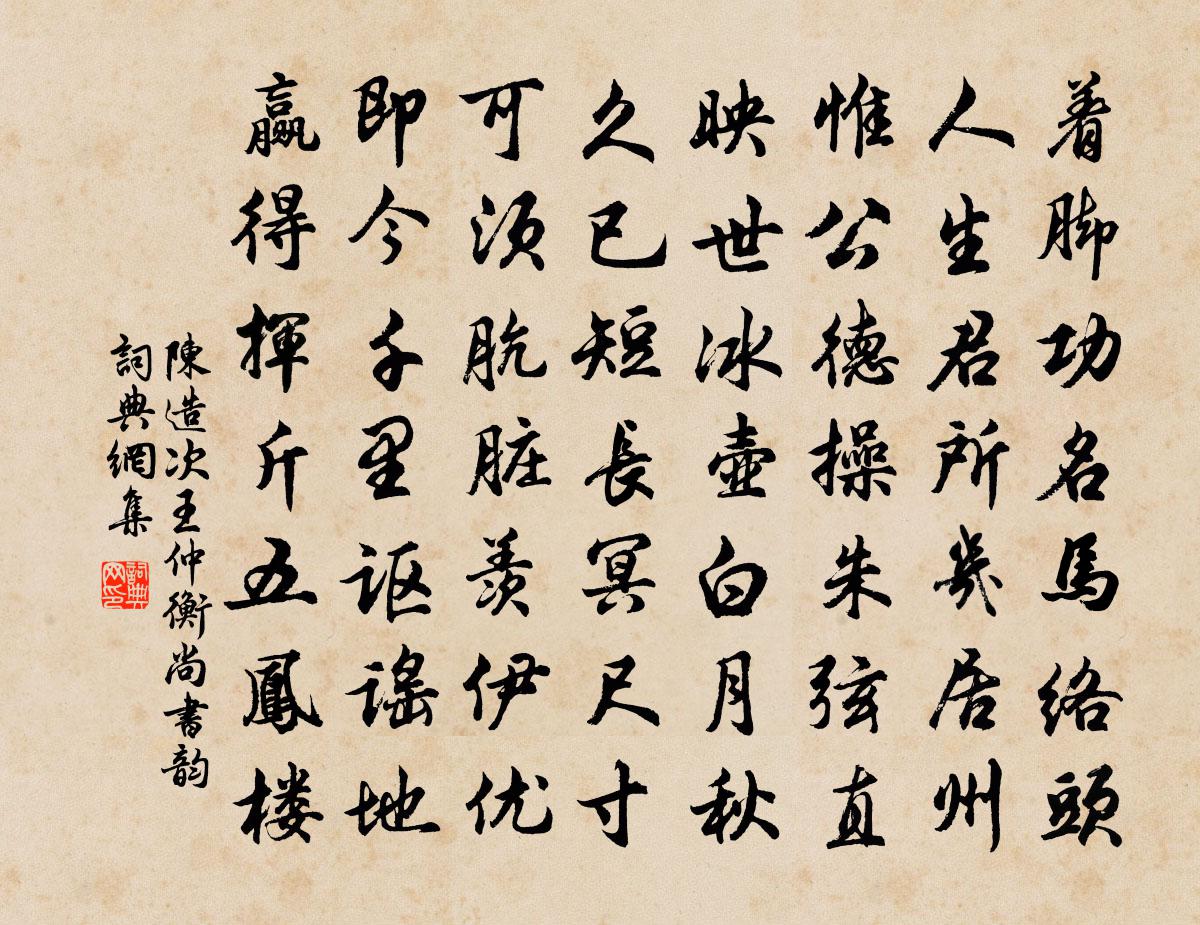 詩詞名句歷史字典書法欣賞書法字典國語詞典說文解字康熙字典古漢語字典標 題 作 者 詩 句 次王仲衡尚書韻作者:陳造 朝代:宋代次王仲衡尚書韻原文著腳功名馬絡頭,人生君所幾居州。惟公德操朱弦直,映世冰壺白月秋。久已短長冥尺寸,可須骯髒羨伊優。即今千里謳謠地,贏得揮斤五鳳樓。詩詞問答問:次王仲衡尚書韻的作者是誰?答:陳造問:次王仲衡尚書韻寫於哪個朝代?答:宋代陳造次王仲衡尚書韻書法欣賞次王仲衡尚書韻書法作品詩詞推薦山居漫興吳端〔宋代〕莫笑山莊小,偏於隱者宜。門當八字路,園葺五經籬。地暖花開早,天寒酒熟遲。不須雞報曉,已得數聯詩。題樟源嶺下老嫗井欄嫗百五歲胡寅〔宋代〕嘻嘻呀呀三伏中,投鞭拭汗一畝宮。銅瓶擊深響鞺鞳,翠綆引重聲璫東。雪花下咽肌骨醒,風腋泛駕仙靈通。百年挽鄭永福劉克莊〔宋代〕竹間梧畔故應佳,非但才高詩亦葩。世胄蚤通樞相譜,里人知是大魁家。誰言陶令才為米,不遣潘郎再種花。□□祭果南澗南叔凱釋善珍〔宋代〕我憩閩北,叔凱枉顧。出南澗書,劇談至暮。言昔之夜,得夢怪奇。當與藏叟,會阿耨池。想耶因耶,一笑眇邈。縣齋秋懷程公許〔宋代〕雲濤扶胥口,煙雨匯澤涯。知心隔湖海,悠悠我之思。玉堂真學士,衡門且棲遲。那知古渠陽,無地逃駭機。昔在訪僧不遇徐集孫〔宋代〕特地尋君先佛場,行行踏遍古苔荒。不因坐石貪搜句,何事抽單輟赴堂。空榻日移懸錫影,別寮風過煮茶香。忙中偈頌一百五十首釋心月〔宋代〕晝見日,夜見星,妙高山色青又青。便與麽去,不惟打失鼻孔,亦乃失卻眼睛。且過在於何,黃河從源濁。紅梅 其一王冕〔元代〕夢回詩思不可遏,赤腳溪頭夜踏冰。忽地風來明月動,彩鸞飛出碧雲層。省試風光草際浮劉禹錫〔唐代〕熙熙春景霽,草綠春光麗。的歷亂相鮮,葳蕤互虧蔽。乍疑芊綿里,稍動丰茸際。影碎翻崇蘭,浮香轉叢蕙。含煙哭川無竭禪師二首方回〔宋代〕幾登瀟灑閣,共坐聽松風。異骨癯僧健,多魔老守窮。是身終有死,何物不成空。豈料龍鍾老,題詩先哭公。滿庭芳葛立方〔宋代〕江國麾幢,邊城鼓角,湓川幾報嚴更。笑談油幕,英傑為時生。腹貯六韜三略,新詩就、矛槊頻橫。功名事,他年聞五月八日宸翰口號十首劉克莊〔宋代〕叩墀還笏今三閏,誓墓垂車又五春。賴有兩 * 圓鏡,當空照見戴盆人。水龍吟 已未春三月,同柔克濟河,中流風雨王惲〔元代〕賦此花詞,且以花經事之後花,重有所花惜雲春流兩岸桃花,驚濤極目吞天去。孤舟纜解,棹歌聲沸,漁*掀舞。游彌牟菩提院庭下有凌霄藤附古楠其高數丈花陸游〔宋代〕絳英翠蔓亦佳哉!零亂空庭碼瑙杯。遍雨新花天有意,定知閒客欲閒來。再和圓機喜雪之作晁說之〔宋代〕十遇荒飢一遇豐,人間不見壁間龍。既慳雨澤空倉厄,仍廣車輿小子封。俗吏教條徒自媿,滮池雲物幸相容。怪來偶作楊簡〔宋代〕夫子文章不可為,從心到口沒參差。咄哉韓子休污我,卻道詩葩與易奇。王正卿何道夫和嘉字韻詩至數十道夫贈予數篇李流謙〔宋代〕從君未省涉津涯,白璧明珠屢拜嘉。一吸湖江真大國,僅除風雨亦寒家。簿書笑我忙官事,筆硯饒君管物華。世味即事陸游〔宋代〕歸臥已如狐首丘,不妨解劍換吳牛。掃空身外閒榮辱,閱盡樽前舊輩流。學道漫希僧坐夏,憂時常媿士防秋。一年油口夜飲醉臥一室及寬三鼓矣秋夜新冷雨濕蟲黃大受〔宋代〕一榻悠然著醉儂,沉沉清夜大槐宮。夢回作惡酒氣重,枕上不眠歸興濃。點滴落添悶雨點,清哀繞壁訴寒蟲。計行贈施仙姑施肩吾〔唐代〕縹緲吾家一女仙,冰容雖小不知年。有時頻夜看明月,心在嫦娥几案邊。名句推薦多謝浣紗人未折,雨中留得蓋鴛鴦。鄭谷《蓮葉》 眺聽良多感,徙倚獨沾襟。李密《淮陽感秋》 白梅懶賦賦紅梅,逞艷先迎醉眼開。曹雪芹《詠紅梅花得“梅”字》 知恩不報,非為人也。施耐庵《水滸傳·第二十回》 兩句三年得,一吟雙淚流。賈島《題詩後》 請君看取東流水,方識人間別意長。嚴仁《鷓鴣天·惜別》 葉落風不起,山空花自紅。陳師道《妾薄命·為曾南豐作》 天長雁影稀,月落山容瘦,冷清清暮秋時候。盧摯《沉醉東風·重九》 知有兒童挑促織,夜深籬落一燈明。葉紹翁《夜書所見》 近來攀折苦,應為別離多王之渙《送別》