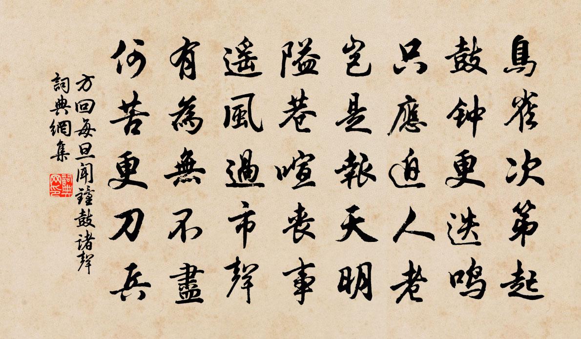 詩詞名句歷史字典書法欣賞書法字典國語詞典說文解字康熙字典古漢語字典標 題 作 者 詩 句 每旦聞鐘鼓諸聲作者:方回 朝代:宋代每旦聞鐘鼓諸聲原文鳥雀次第起,鼓鍾更迭鳴。只應迫人老,豈是報天明。隘巷喧喪事,遙風過市聲。有為無不盡,何苦更刀兵。詩詞問答問:每旦聞鐘鼓諸聲的作者是誰?答:方回問:每旦聞鐘鼓諸聲寫於哪個朝代?答:宋代方回每旦聞鐘鼓諸聲書法欣賞每旦聞鐘鼓諸聲書法作品詩詞推薦清平樂楊冠卿〔宋代〕翠團嘉樹。杜宇呼春去。簾卷金泥凝望處。幾點紅薇香雨。等閒過了花時。殷勤來問酴醿。恰有一枝春在,畫樓紅春社日寄李學士李濤〔唐代〕社翁今日沒心情,為乞治聾酒一瓶。惱亂玉堂將欲遍,依稀巡到第三廳。別思吳靜婉〔明代〕西崦雨未收,東崦風又作。留住綠蓑衣,莫與篙師著。宿東林寺(一作雲門雪夜)靈澈〔唐代〕天寒猛虎叫岩雪,林下無人空有月。千年像教今不聞,焚香獨為鬼神說。閱武堂曾鞏〔宋代〕五朝壞冶歸皇極,萬里車書共太平。胡馬一闚光祿塞,漢家常疑羽林兵。柳間自詫投營業樂,桑下方安佩犢行。高秋題薛能〔唐代〕獨坐東南見曉星,白雲微透泬寥清。磷磷甃石堪僧坐,一葉梧桐落半庭。輞川集二十首。漆園裴迪〔唐代〕好閒早成性,果此諧宿諾。今日漆園游,還同莊叟樂。送劉坰登第赴調二首項安世〔宋代〕昔在中朝日,長懷隻影傷。逢人盡吳蜀,無伴說荊襄。千古卿材地,多年世論忘。因君到雲路,江漢不淒涼。到城南園瞻南軒先生遺像王炎〔宋代〕入門荷香淨,步屧柳陰濕。欲寫情鬱陶,翻引興蕭瑟。瞻望堂中人,玉色而山立。六學妙經綸,未試百之一。身存和陶雜詩十一首蘇軾〔宋代〕南榮晚聞道,未肯化庚桑。陶頑鑄強獷,枉費塵與糠。越子古成之,韓生教休糧。參同得靈鑰,九鎖啟伯陽。鵝城秋日懷松溪趙宰經父章粲〔宋代〕晴窗靜繙書,凝塵掩行跡。花影晝簾閒,苔痕秋徑寂。憑高招遠風,緣流弄寒碧。緘情寄天涯,杳杳江閩隔。相和歌辭祠神歌送神王睿〔唐代〕棖棖山響答琵琶,酒濕青莎肉飼鴉。樹葉無聲神去後,紙錢灰出木綿花。宿徐元達小樓楊萬里〔宋代〕樓迥眠曾著,秋寒夜更加。市聲先曉動,窗月傍人斜。役役名和利,憧憧馬又車。如何泉石耳,禁得許誼嘩?移居洞庭麴信陵〔唐代〕重林將疊嶂,此處可逃秦。水隔人間世,花開洞裡春。荷鋤分地利,縱酒樂天真。萬事更何有,吾今已外身。題陳德秀畫四季枕屏圖五首潘大臨〔宋代〕茅瞻竹閣枕回溪,柳外平橋拍水低。在藻白魚知鷺下,穿林黃雀覺蟬嘶。蔡州道中劉奉世〔宋代〕黃河西渡出平沙,汝潁東流千里遐。給餉當年秦令史,封侯不種青門瓜。曹參王安石〔宋代〕束髮河山百戰功,白頭富貴亦成空。華堂不著新歌舞,卻要區區一老翁。雜賦陸游〔宋代〕養疾清溪曲,風林幾著霜。細書如助嬾,薄酒不成狂。老嘆朋儕盡,閒知歲月長。柴門偶一出,倚杖立斜陽。雪招招象之韓維〔宋代〕愁雲合無跡,密雪集冬仲。狂翻寒空來,微泛與風弄。打窗驚暮急,壓竹愛宵重。明缸照狹室,簾押寂不動。環爐失調名佚名〔宋代〕況今宵好景,金吾不禁,玉漏休催。名句推薦形相雖惡而心術善,無害為君子也。荀子《荀子·非相》 情之所鍾,雖醜不嫌。沈復《浮生六記·閨房記樂》 空獨倚東風,芳思誰寄。周密《繡鸞鳳花犯·賦水仙》 愁顏與衰鬢,明日又逢春。戴叔倫《除夜宿石頭驛》 四月十七,正是去年今日,別君時。韋莊《女冠子·四月十七》 社下燒錢鼓似雷,日斜扶得醉翁回。范成大《春日田園雜興》 人世幾回傷往事,山形依舊枕寒流。劉禹錫《西塞山懷古》 香臉半開嬌旖旎。當庭際。玉人浴出新妝洗。李清照《漁家傲·雪裡已知春信至》 行人悵望蘇台柳,曾與吳王掃落花。姜夔《姑蘇懷古》 天不老,情難絕。張先《千秋歲·數聲鶗鴂》