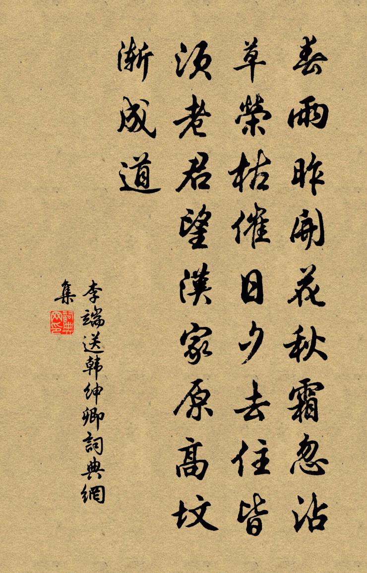 詩詞名句歷史字典書法欣賞書法字典國語詞典說文解字康熙字典古漢語字典標 題 作 者 詩 句 送韓紳卿作者:李端 朝代:唐代送韓紳卿原文春雨昨開花,秋霜忽沾草。榮枯催日夕,去住皆須老。君望漢家原,高墳漸成道。詩詞問答問:送韓紳卿的作者是誰?答:李端問:送韓紳卿寫於哪個朝代?答:唐代問:送韓紳卿是什麼體裁?答:五古李端送韓紳卿書法欣賞送韓紳卿書法作品注釋全唐詩:卷284_27詩詞推薦立秋日作乾隆〔清代〕已識山中早晚涼,今朝況復立秋當。如何午熱為孤注,疑是金官讓末光。桐葉庭邊想影落,草蟲砌下覺聲楊。農占送文鑄師游襄陽鹿門文同〔宋代〕師今鹿門去,正此冒炎曦。野店乞晨饌,亂山吟古詩。問程行幾日,覽景立多時。我有懷賢意,憑看墮淚碑。同德麟仲寶過謝公定酌酒賞菊以悲哉秋之為氣李廌〔宋代〕青松多陳根,女桑漫柔枝。虛心任寒暑,寧與鐵炭期。旨酒有妙致,青山多令姿。醉游臥丘壑,於予復何為。踏莎行劉秉忠〔元代〕碧水東流,白雲西去。旌旗卷盡西山雨。淡煙寒露黃昏,傷懷又是別來處。雙眼增明,青山如故。故人怪我來何暮偈頌一百零二首釋紹曇〔宋代〕一塊松根石,頑然自古來。更無人覷著,歲歲長莓苔。過蒙古諸部落乾隆〔清代〕獵罷歸來父子圍,露沾秋草鹿初肥,折楊共炙傾渾脫,醉趁孤鴻馬上飛。歲暮白居易〔唐代〕窮陰急景坐相催,壯齒韶顏去不回。舊病重因年老發,新愁多是夜長來。膏明自爇源多事,雁默先烹為不才。禍福石佛谷皇甫湜〔唐代〕澶漫花太行北,花千里一塊花石。平腹有壑谷,深廣數百尺。土僧何為者,老草花發白。寢處容身龕,足膝隱成跡挾文薛君自賦五首克己讀書安貧擇交訓子為題程公許〔宋代〕士能知尚友,豈必盡同時。雜鮑蘭胥化,亡羊路或岐。醴甘知易絕,絲素亦奚悲。可以交難擇,而忘伐木詩。夏日對雨宋庠〔宋代〕岑寂省廬幽,諸曹吏始休。空煙催樹晚,急雨借庭秋。暮影層波動,簷聲萬綆流。縹牆明疊蘚,坳徑聚浮漚。亂濕送謝學賓葉適〔宋代〕衰年懶看客,十臥適一起。謝子何許來,我屐屢折齒。貌閒神又肅,論事靜而理。紛然嘲{左口右哲}際,莞爾諧宿白鷺洲寄楊江寧李白〔唐代〕朝別朱雀門,暮棲白鷺洲。波光搖海月,星影入城樓。望美金陵宰,如思瓊樹憂。徒令魂入夢,翻覺夜成秋。綠水卻歸舊山望月有寄徐凝〔唐代〕年年明月總相似,大抵人情自不同。今夜故山依舊見,班家扇樣碧峰東。送李承知京兆司錄祖無擇〔宋代〕才從知已薦,又應辟書行。廷尉官聯重,軍謀職任清。會嚴東野秀,紫閣晚峰橫。儘是供吟處,歸應新築成。餈韻楊公濟奉議梅花十首蘇軾〔宋代〕縞裙練帨玉川家,肝膽清新冷不邪。穠李爭春猶辦此,更教踏雪看梅花。聞崔十二侍御灌口夜宿報恩寺岑參〔唐代〕聞君尋野寺,便宿支公房。溪月冷深殿,江雲擁迴廊。然燈松林靜,煮茗柴門香。勝事不可接,相思幽興長。酬馮絳州早秋絳台感懷見寄權德輿〔唐代〕良牧閒無事,層台思眇然。七條縈印綬,三晉辨山川。洗嫧謳謠合,開襟眺聽偏。秋光連大鹵,霽景下新田。葉落舊愛靈溪渡風物之美歸途由浙而江即目成詠陳杰〔宋代〕黃竹弄口雨初晴,靈溪渡頭水漸生。兩岸桑麻人著本,一川鷗鷺我同盟。風環搖日浣紗影,雲杵打波舂稻聲。少日玉樓春 贈磻溪張先生馬鈺〔元代〕元陽烹鍊金光闕。不使暗魔來盜竊。常持清淨有功能,永結神丹無漏泄。閒心一片如冰雪。自有長生無夜月。蓋因送丕上人南遊魏野〔宋代〕江山獨去游,游遍始應休。雲外敲清磬,船中剃白頭。阻風孤島晚,聽雨二林秋。南國多嘉境,詩牌幾處留。名句推薦桃花水到報平渠,喜動新流見躍魚。黃圖安《閒詠二絕》 青山隱隱水迢迢,秋盡江南草未凋。杜牧《寄揚州韓綽判官》 高館張燈酒復清,夜鍾殘月雁歸聲。高適《夜別韋司士》 槐柳野橋邊,行塵暗馬前。齊己《送人游塞》 佳期悵何許,淚下如流霰謝朓《晚登三山還望京邑》 誠者,天之道也。誠之者,人之道也。誠者,不勉而中不思而得:從容中道,聖人也。誠之者,擇善而固執之者也子思《中庸·第二十章》 佇倚危樓風細細。望極春愁,黯黯生天際。柳永《蝶戀花·佇倚危樓風細細》 吳興才人怨春風,桃花滿陌千里紅。李賀《送沈亞之歌·並序》 眇能視,不足以有明也。跛能履,不足以與行也。佚名《易傳·象傳上·履》 下謀上以術,術有窮者以力。來俊臣《羅織經·謀劃卷第九》