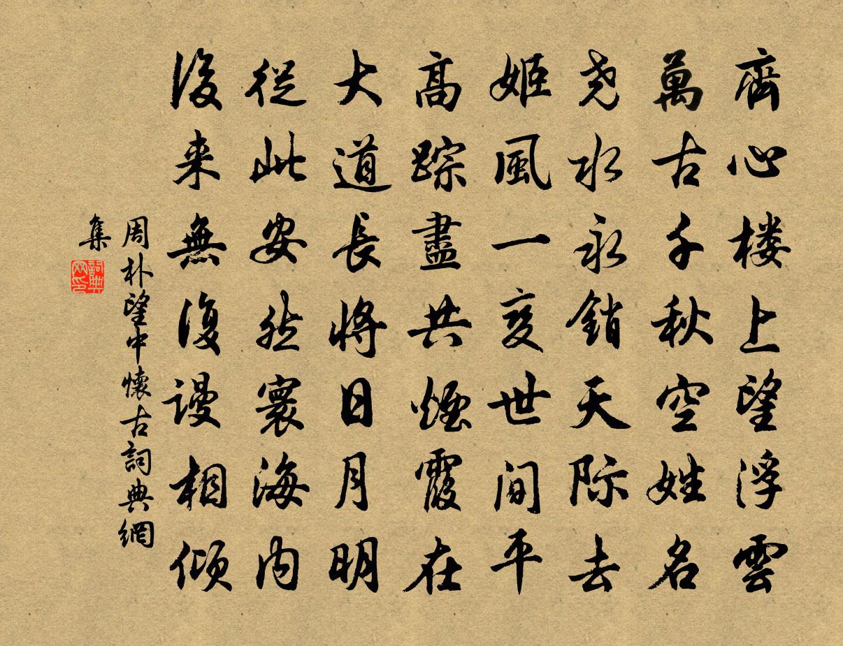 詩詞名句歷史字典書法欣賞書法字典國語詞典說文解字康熙字典古漢語字典標 題 作 者 詩 句 望中懷古作者:周朴 朝代:唐代望中懷古原文齊心樓上望浮雲,萬古千秋空姓名。堯水永銷天際去,姬風一變世間平。高蹤盡共煙霞在,大道長將日月明。從此安然寰海內,後來無復謾相傾。詩詞問答問:望中懷古的作者是誰?答:周朴問:望中懷古寫於哪個朝代?答:唐代問:望中懷古是什麼體裁?答:七律周朴望中懷古書法欣賞望中懷古書法作品注釋全唐詩:卷673_27詩詞推薦放歌行孟雲卿〔唐代〕吾觀天地圖,世界亦可小。落落大海中,飄浮數洲島。賢愚與蟻虱,一種同草草。地脈日夜流,天衣有時掃。東山詠梅王安石〔宋代〕頗怪梅花不肯開,豈知有意待春來。燈前玉面披香出,雪後春容取勝回。觸撥清詩成走筆,淋漓紅袖趣傳杯。望塵題四皓廟四首邵雍〔宋代〕漢皇傲物終難屈,太子卑辭方肯出。難老猶能成大功,至今高義如星日。七夕亞之置酒再用前韻韓元吉〔宋代〕烏鵲無聲夜向闌,空庭插竹巧誰看。長生殿里金釵暖,百子池邊五縷寒。夢破清風吹雨腳,醉余新月上林端。閒來山水卷揭傒斯〔元代〕稍稍雲木動,藹藹煙峰亂。遠浦引歸橈,雙崖臨絕岸。方思隱淪客,欲結漁樵伴。水闊山更遙,幽期空汗漫。八冬苦雨禱晴幸應劉若訥惠詩為賀因次其韻韓元吉〔宋代〕燈花作喜夜來占,樓角初晴月似鐮。便說市亭新酒美,好風寒日舞青簾。和孔純老按屬邑六首王之道〔宋代〕行並焦湖試問塗,何如震澤占姑蘇。提壺聒聒勸誰飲,我不知君渠自呼。秋感毛直方〔宋代〕宇宙百年身,江湖萬里心。世情高枕遠,詩味閉門深。白髮銷窮達,青山傲豐今。情知秋亦客,何事感秋吟。頌古九十八首釋印肅〔宋代〕飛空著地情依識,大地山河情識磨。色空明暗無相似,挑起蛇時會也麽。楊謹仲和頃者三詩見貽複次韻六首趙蕃〔宋代〕去年才一識,何意復茲行。隱墅全依郭,幽居亦占名。萬金真國士,十室漫鄉評。漢制誰綿蕝,且徵齊魯生。熊主簿示梅花十絕詩至梅花已過因觀海棠輒次劉克莊〔宋代〕梅太酸寒蘭太清,海棠方可入丹青。趙昌骨朽徐熙死,誰寫春風上錦屏。赬桐花方岳〔宋代〕厥草惟夭簇絳繒,猩紅初滴尚火蒸。西風坐閱芙蓉老,合是藥中耐久朋。絳都春吳則禮〔宋代〕韶華漸好。報錦里又是,春風來早。昴宿降蕭,崧岳生申符英表。三朝倖望人傾禱。壽與長城俱老。碧油紅旆,高和晚菊三首廖行之〔宋代〕何事秋光老更清,故應有菊占秋榮。後來漢陛知薪積,晚出商山嘆翼成。三徑惟將松比操,東籬那為酒含英。紛紛一榻陳起〔宋代〕一榻世緣輕,毋將事物縈。昔人言豈誤,慧自靜中生。句釋惠崇〔宋代〕行縣山迎舸,論兵雲繞旗。折桂令·擬張鳴善倪瓚〔元代〕草茫茫秦漢陵闕,世代興亡,卻便似月影圓缺。山人家堆案圖書,當窗松桂,滿地薇蕨。侯門深何須刺謁?白雲自春日即事二首蔡沆〔宋代〕人生何事最為親,不看春容不識真。岸柳細搖多意思,野花初破足精神。精神識後施為別,意思到時言語新。為報辛丑九日五首方回〔宋代〕何事清秋已衣綿,微寒最怯倚樓天。江南今歲黃花早,醉嚼重陽半月前。金門寺中見李西台與二錢唱和四絕句,戲用其蘇軾〔宋代〕西台妙跡繼楊風,無限龍蛇洛寺中。一紙清詩吊興廢,塵埃零落梵王宮。名句推薦青綾被,莫憶金閨故步晁補之《摸魚兒·東皋寓居》 首夏猶清和,芳草亦未歇。謝靈運《游赤石進帆海》 禍難生於邪心,邪心誘於可欲。韓非及後人《韓非子·解老》 林臥愁春盡,開軒覽物華。孟浩然《清明日宴梅道士房 / 宴梅道士山房》 曉看紅濕處,花重錦官城。杜甫《春夜喜雨》 虢國夫人承主恩,平明騎馬入宮門。張祜《集靈台·其二》 怒髮衝冠,憑欄處、瀟瀟雨歇。岳飛《滿江紅·寫懷》 夢裡不知身是客,一晌貪歡。李煜《浪淘沙令·簾外雨潺潺》 朝辭白帝彩雲間,千里江陵一日還。李白《早發白帝城 / 白帝下江陵》 天與三台座,人當萬里城。張九齡《奉和聖制送尚書燕國公赴朔方》