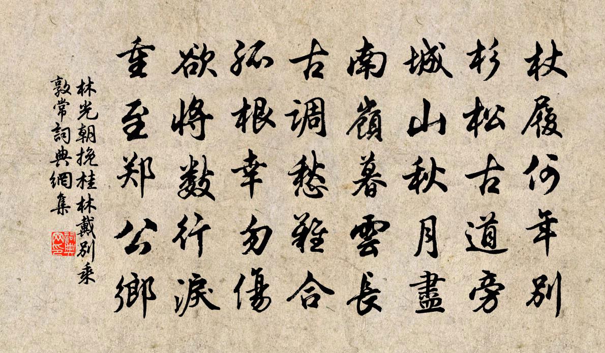 詩詞名句歷史字典書法欣賞書法字典國語詞典說文解字康熙字典古漢語字典標 題 作 者 詩 句 挽桂林戴別乘敦常作者:林光朝 朝代:宋代挽桂林戴別乘敦常原文杖履何年別,杉松古道旁。城山秋月盡,南嶺暮雲長。古調愁難合,孤根幸勿傷。欲將數行淚,重至鄭公鄉。詩詞問答問:挽桂林戴別乘敦常的作者是誰?答:林光朝問:挽桂林戴別乘敦常寫於哪個朝代?答:宋代林光朝挽桂林戴別乘敦常書法欣賞挽桂林戴別乘敦常書法作品詩詞推薦暮春釋行海〔宋代〕老盡春風蝶未知,綠陰深處囀黃鸝。如今不作看花念,空對垂楊惜別離。送子威史歸邵怒曹勛〔宋代〕閩浙相望一寸心,鴒原落寞嘆孤音。五年情話空相憶,千里閒門肯見尋。只擬連床常對語,豈堪垂老更分襟。它時誚王安石乞分司西京避讒而去因以述懷祖無擇〔宋代〕割斷攀緣宰相權,憂危爭似我身全。試觀竿上拋生體,且擬波中戲釣船。名利不求還獨樂,是非莫辯祗高眠。何當戴縣丞輓詞樓鑰〔宋代〕小戴久仙去,何堪更哭君。舊遊驚昨夢,陳跡愴遺文。晚暮期相與,死生俄遽分。銘成愧潛德,揮涕望新墳。瑞鷓鴣葛立方〔宋代〕榴花庭院戲氍毹。水剪雙眸畫不如。莫恨未能通瑟僩,只今先已辯之無。虎晴淺綴新花帽,龍腦濃熏小繡襦。乃祖晚行後園見菊戲宜莆司馬光〔宋代〕野菊荒無數,班班初見花。徑須求一醉,度遣問東家。初夏幽居雜賦陸游〔宋代〕水際閒將鶴,林間獨擁琴。披叢采香草,映樹看珍禽。正使居無屋,猶勝突不黔。過春差覺健,處處得幽尋。六州歌頭(送王玉良)劉過〔宋代〕萬里湖南,江山歷歷,皆吾舊遊。看飛鳧仙子,張帆直上,周郎赤壁,鸚鵡汀洲。吸盡西江,醉中橫笛,人在岳陽醉桃源(會飲豐樂樓)吳文英〔宋代〕翠陰濃合曉鶯堤。春如日墜西。畫圖新展遠山齊。花深十二梯。風絮晚,醉魂迷。隔城聞馬嘶。落紅微沁繡鴛泥。沁園春汪莘〔宋代〕家在柳塘,榜掛方壺,圖掛黃山。覺仙峰六六,滿堂峭峻,仙溪六六,繞屋潺湲。行到水窮,坐看雲起,只在吾廬清平樂(私情)黃庭堅〔宋代〕銀燭生花如紅豆。占好事、而今有。人醉曲屏深,借寶瑟、輕招手。一陣白苹風,故滅燭、教相就。花帶雨、冰肌送文總管朝燕四首劉應鳳〔宋代〕喚得嵐鄉昨夢回,東風萬里上金台。出關曾解婆娑否,枝北枝南一種梅。劉弟示詩一軸走筆答之梅堯臣〔宋代〕昔與伯氏吟,青銅照人發。今又讀君讀,寒冰徹人骨。時時探古趣,往往到月窟。清濟流不休,終期至溟渤。偈頌一百二十三首釋崇岳〔宋代〕開爐開爐,柴炭全無。星兒火種,照徹十虛。九日贈僧唐介〔宋代〕今日是重陽,勞師訪野堂。相逢又無語,籬下菊花黃。惜分飛(桂花)沈端節〔宋代〕喜人眉心黃點瑩。珠佩玲瓏透影。風露蕭蕭冷。夢回月窟香成陣。秋後情懷君莫問。拚了因他瘦損。不似尋常韻。壽周樞使楊炎正〔宋代〕璧月秋光滿,爭河夜色開。嘗從北辰所,飛墮一星來。許國身為棟,居庭面對槐。黃封天上酒,歲歲酌金罍。桃源憶故人(閨情)李漳〔宋代〕小樓簾卷欄乾外。花下朱門半啟。中有傾城佳麗。一笑西風裡。盈盈臨水情難致。盡日相看如醉。乾鵲不知人意。寄題南昌尉廳思賢亭楊萬里〔宋代〕有客棲霞外,無名涴黨中。南州一高士,東漢獨清風。舊國已禾女,荒阡猶石翁。更煩吹笛魄,端為洗榛叢。同顏使君清明日游,因送蕭主簿皎然〔唐代〕誰知賞嘉節,別意忽相和。暮色汀洲遍,春情楊柳多。高城戀旌旆,極浦宿風波。惆悵支山月,今宵不再過。名句推薦今朝有酒今朝醉,明日愁來明日憂。佚名《增廣賢文·上集》 邊月隨弓影,胡霜拂劍花。李白《塞下曲六首》 飄零疏酒盞,離別寬衣帶。秦觀《千秋歲·水邊沙外》 落花飛絮蒙蒙,長憶著、灞橋別後。毛滂《上林春令·十一月三十日見雪》 我愛山中夏,空冥花雨下。元鵬《山中四詠》 老去悲秋強自寬,興來今日盡君歡。杜甫《九日藍田崔氏莊》 靜勝躁,寒勝熱。清靜為天下正。老子《老子·德經·第四十五章》 玉漏銀壺且莫催,鐵關金鎖徹明開。崔液《上元夜六首·其一》 桑野就耕父,荷鋤隨牧童。孟浩然《田家元日》 不務天時,則財不生;不務地利,則倉廩不盈管仲《管子·牧民》