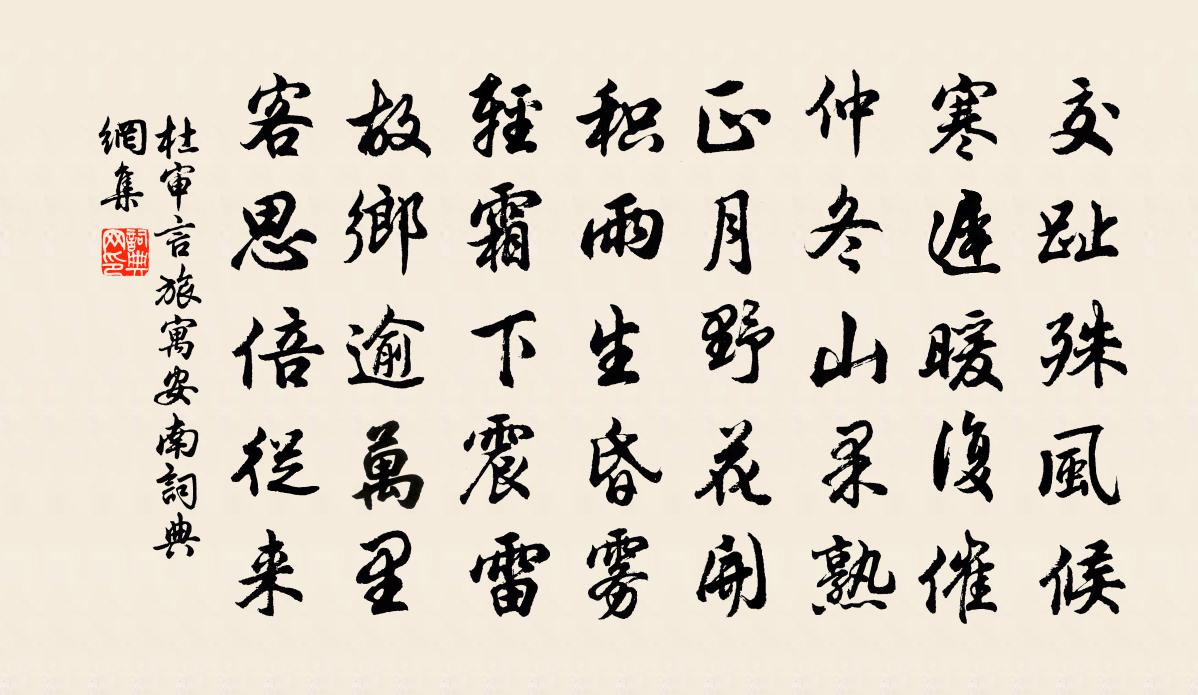 詩人在這兩聯詩里,描繪了山果、野花、積雨、昏霧、震雷,都是人們日常生活中常見的平凡事物,僅用了仲冬、正月、熟、開、生、下等幾個時令詞和動詞,加以精巧的組合,就造成了奇妙的意境,表現了四時不同的景色和氣象,把交趾的“殊風候”畢現在筆端。這是詩人近一年來流寓安南生 * 驗的形象總結和意緒的流露,有驚奇、有興奮、有讚美、有惆悵。面對這一派十足的異域風光,詩人自然又會觸目傷懷,尾聯照應題目直抒羈旅之情,“家鄉逾萬里,客思倍從來。”“逾萬里”是渲染其遠,並非指實寫。