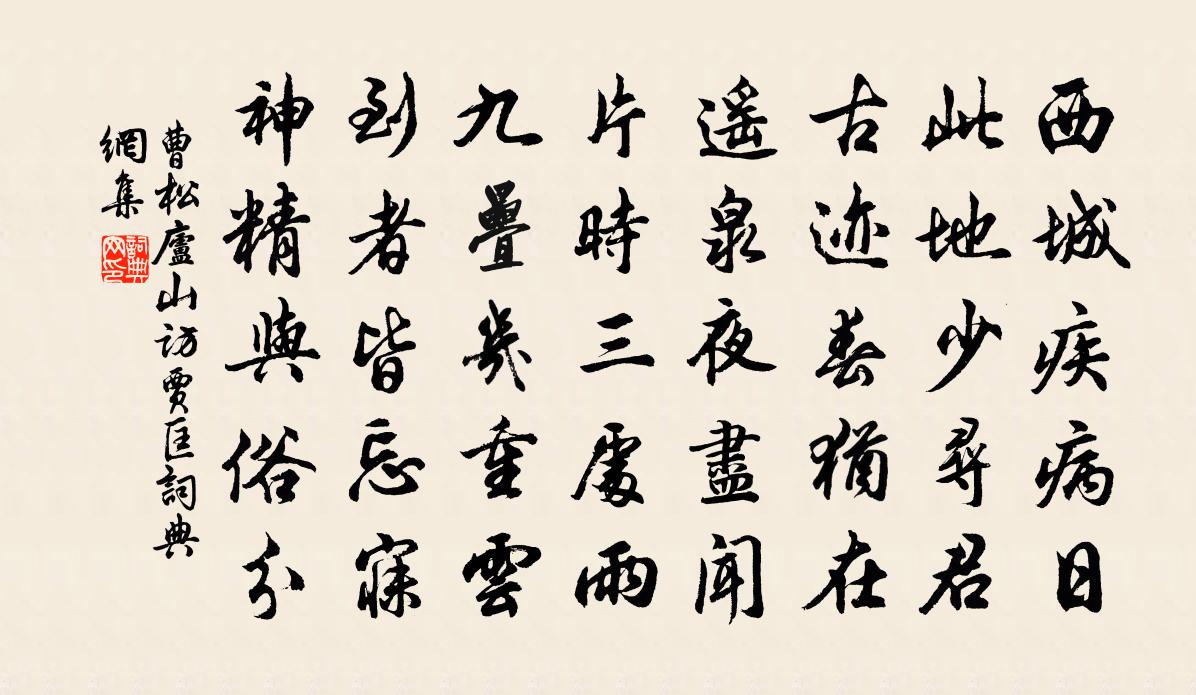 詩詞名句歷史字典書法欣賞書法字典國語詞典說文解字康熙字典古漢語字典標 題 作 者 詩 句 廬山訪賈匡作者:曹松 朝代:唐代廬山訪賈匡原文西城疾病日,此地少尋君。古蹟春猶在,遙泉夜盡聞。片時三處雨,九疊幾重雲。到者皆忘寐,神精與俗分。詩詞問答問:廬山訪賈匡的作者是誰?答:曹松問:廬山訪賈匡寫於哪個朝代?答:唐代問:廬山訪賈匡是什麼體裁?答:五律曹松廬山訪賈匡書法欣賞廬山訪賈匡書法作品注釋全唐詩:卷717-2詩詞推薦夏日四絕潘良貴〔宋代〕錯落星河天未明,太虛涵露氣全清。東方隱約生光耀,便覺林間宿鳥驚。勝因寺陳天麟〔宋代〕山行詰曲到禪林,台殿丹青歲月深。薄晚春寒生幾席,逼人空翠撲衣襟。客塵冉冉凌清思,俗狀紛紛費苦吟。若得奉和御製幸金明池夏竦〔宋代〕朱輅乘時兮出曉煙,飛梁承幸兮斗城邊。幔省蔭堤兮楊葉闇,星旄藻岸兮物華妍。珠網金鋪兮豫章館,風檣桂楫兮春詞毛滂〔宋代〕春逐東風行地上,德隨和氣散寰區。聖人中正觀天下,道本無言教已孚。山居雜詩九十首曹勛〔宋代〕飯了縱閒適,杖屨涉晴晝。時物破百感,環山獻明秀。承宇茂芳桂,追涼風細逗。摘果靡憚勞,聊用引稚幼。觀儺劉鏜〔宋代〕寒雲岑岑天四陰。畫堂燭影紅簾深。鼓聲淵淵管聲脆,鬼神變化供劇戲。金窪玉注始淙潺,眼前倏已非人間。夜叉過秦樓陳允平〔宋代〕穀雨收寒,茶煙揚曉,又是牡丹時候。浮龜碧水,聽鶴丹山,彩屋幔亭依舊。和氣縹緲人間,滿谷紅雲,德星呈秀偈頌一百二十三首釋崇岳〔宋代〕今朝五月五,粗言及細語。會得也尋常,不會超佛祖。雜詩二十七首曹勛〔宋代〕景陽未下水雲鄉,梅影搖寒月一處。欹枕夢能歸故隱,滿帆煙雨渡濤江。二十四日文天祥〔宋代〕壯心負光岳,病質落幽燕。春節前三日,江鄉正小年。歲時如有水,風欲不同天。家廟荒苔滑。答徐秀才韋應物〔唐代〕鉛鈍謝貞器,時秀猥見稱。豈如白玉仙,方與紫霞升。清詩舞艷雪,孤抱瑩玄冰。一枝非所貴,懷書思武陵。南明道中釋行海〔宋代〕酒旗猶寫天台紅,小白花繁綠刺叢。蜂蝶不來春意靜,日斜桐角奏東風。夏日西湖閒居十首汪莘〔宋代〕藕蔕嚼來殊解渴,荷香聞得亦忘飢。幽人不趁槐花課,收得西湖幾句詩。鏵嘴范成大〔宋代〕導江自海陽,至縣乃彌迤。狂瀾既奔傾,中流遇鏵嘴。分為兩道開,南漓北湘水。至今舟楫利,楚粵徑萬里。人謀句宋庠〔宋代〕冰萼瓊華次第開。滿江紅(壽小叔母)陳著〔宋代〕修茂堂深,芳塵滿、沈煙一朵。簾半卷,好風催曉,晴光才破。新潤頓教萱草鬯,輕寒未放酴醿過。稱魚軒、容與二神峰陳岩〔宋代〕伯仲怡然意甚真,齊肩握手笑相親。雲陰解駮排空立,秀出人間棣萼春。謝人惠詩二首姜特立〔宋代〕爐鎚鍛鍊不遺力,造化窮皺無遁情。每對時人思杜老,不知能事屬先生。抄戊辰十月近稿七首劉克莊〔宋代〕識之無字憶髫年,霍地紅顏變雪顛。求狗監人難復得,如雞林相豈非賢。鯉庭聞處才三百,蚓竅吟來忽五千。寄語食菜作二首廖行之〔宋代〕吾儒不羨能方丈,彼相胡為食萬錢。誰識春來有珍味,樂如疏食曲肱眠。園中菜把勤能致,曹掾蓴羹美未專。便作名句推薦國亡身殞今何有,只留離騷在世間。張耒《和端午》 送君歸去愁不盡,又惜空度涼風天。王昌齡《送狄宗亨》 出其東門,有女如雲。佚名《出其東門》 滿街楊柳綠絲煙,畫出清明二月天。韋莊《丙辰年鄜州遇寒食城外醉吟五首》 相見情已深,未語可知心。李白《相逢行二首》 獨夜憶秦關,聽鍾未眠客。韋應物《夕次盱眙縣》 送君如昨日,檐前露已團。江淹《古離別》 桃花落後蠶齊浴,竹筍抽時燕便來。朱彝尊《鴛鴦湖棹歌·一百首選二》 小快害義,小慧害道,小辨害治,苟心傷德。劉向《說苑·談叢》 昨夜雨疏風驟,濃睡不消殘酒。李清照《如夢令·昨夜雨疏風驟》