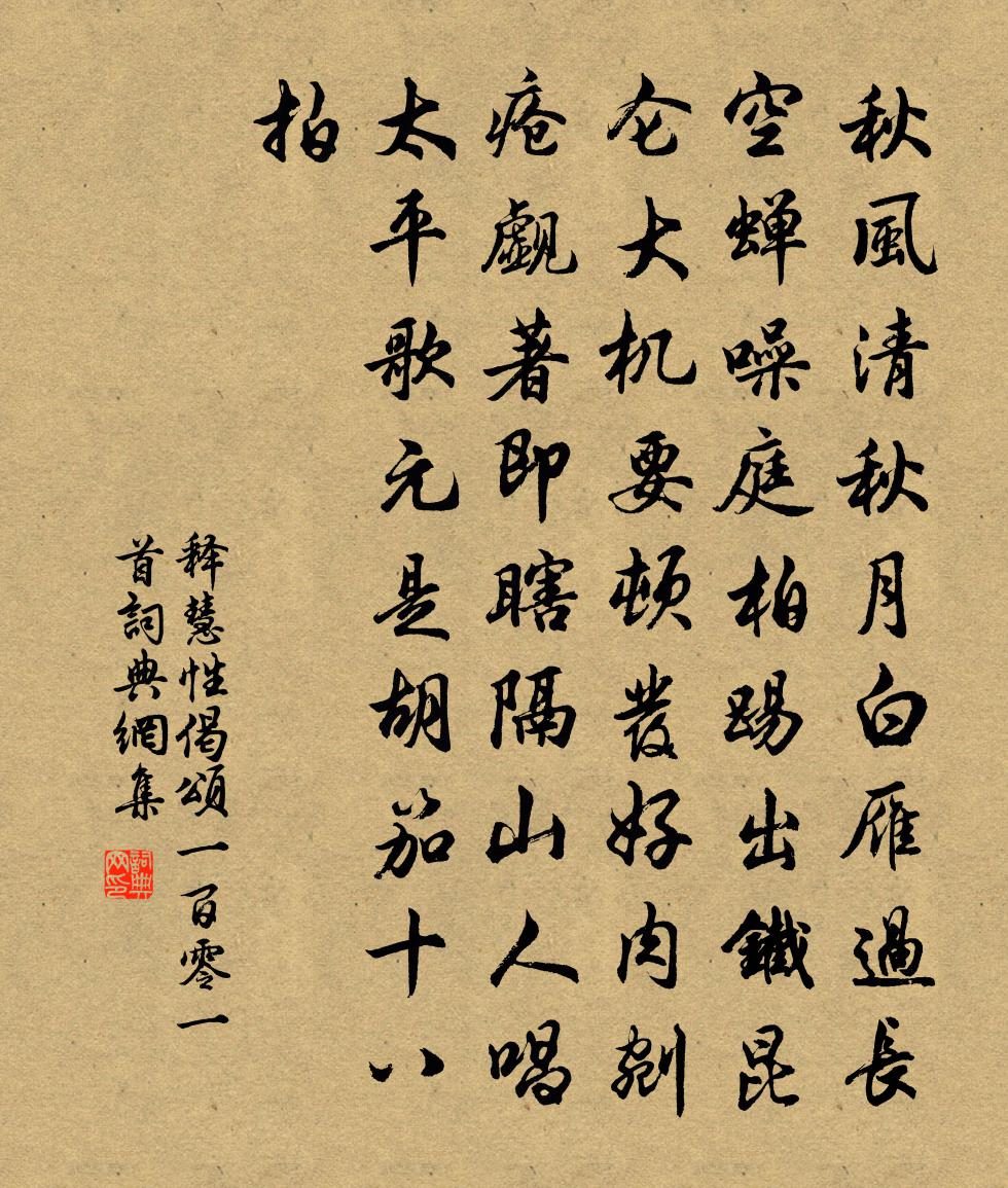 詩詞名句歷史字典書法欣賞書法字典國語詞典說文解字康熙字典古漢語字典標 題 作 者 詩 句 偈頌一百零一首作者:釋慧性 朝代:宋代偈頌一百零一首原文秋風清,秋月白。雁過長空,蟬噪庭柏。踢出鐵崑崙,大機要頓發。好肉剜瘡,覷著即瞎。隔山人唱太平歌,元是胡笳十八拍。詩詞問答問:偈頌一百零一首的作者是誰?答:釋慧性問:偈頌一百零一首寫於哪個朝代?答:宋代釋慧性偈頌一百零一首書法欣賞偈頌一百零一首書法作品詩詞推薦望淮口王安石〔宋代〕白煙瀰漫接天涯,黯黯長空一道斜。有似錢塘江上望,晚潮初落見平沙。郊廟歌辭。釋奠武成王樂章。迎神於邵〔唐代〕卜畋不從,兆發非熊。乃傾荒政,爰佐一戎。盛烈載垂,命祀維崇。日練上戊,宿嚴閟宮。迎奏嘉至,感而遂通。懷忠堂辭王炎〔宋代〕跂逸駕兮前修,佩武符兮典州。跡已陳兮德新,可敬而慕兮幾春復秋。意其存兮閟千萬年之原,謂其逝兮乃在浮羅送周知監二首韓絳〔宋代〕唐家諭巴蜀,通道至邛僰。列郡徼西南,夷居半岩壁。和堯夫見寄司馬光〔宋代〕志趣苦難合,倀倀何所依。逢君始相照,知我信為稀。忽報除書下,徒瞻征蓋飛。相思千里遠,洛浦又春歸。答朝士賀知章〔唐代〕鈒鏤銀盤盛蛤蜊,鏡湖蓴菜亂如絲。鄉曲近來佳此味,遮渠不道是吳兒。黃鶴樓 / 登黃鶴樓崔顥〔唐代〕昔人已乘黃鶴去,此地空餘黃鶴樓。黃鶴一去不復返,白雲千載空悠悠。晴川歷歷漢陽樹,芳草萋萋鸚鵡洲。日暮偈頌七十六首釋子益〔宋代〕時節既至,其理自彰。井井秧浮綠,村村麥弄黃。半窗山月白,一枕竹風涼,笑倒山前前鄧八郎。天目禪師歸梁渚舊隱釋文珦〔宋代〕聞師歸渚上,欲盡百年間。獨鶴知難侶,孤雲不易攀。龍盂經幾綴,虎錫上重環。禪子多求法,玄門為啟關。建鄴懷古楊乘〔唐代〕故城故壘滿江濆,儘是干戈舊苦辛。見此即須知帝力,生來便作太平人。酬包評事壁畫山水見寄皇甫冉〔唐代〕一官知所傲,本意在雲泉。濡翰生新興,群峰忽眼前。黛中分遠近,筆下起風煙。岩翠深樵路,湖光出釣船。寒侵身里出門釋正覺〔宋代〕放曠還來荊棘林,倒騎牛自醉吟吟。誰嫌煙雨鬧蓑笠,只個虛空不掛針。望海潮(四之四)秦觀〔宋代〕奴如飛絮,郎如流水,相沾便肯相隨。微月戶庭,殘燈簾幕,匆匆共惜佳期。才話暫分攜。早抱人嬌咽,雙淚紅垂立春日小集呈李端叔蘇軾〔宋代〕白髮已十載,青春無一堪。不驚新歲換,聊與故人談。牛健民聲喜,鴉嬌雪意酣。霏微不到地,和暖要宜蠶。歲月觀音贊釋可湘〔宋代〕觀以耳觀,聽以眼聽。道不虛行,谷不虛應。施無畏之力,滅煩惱之病。與諸佛同一慈心,與群生共一悲命。若非樓上曲王令〔宋代〕逆口不唱當時歌,當時笑聲與曲和。忍目不視當時字,當時字寫當時意。當時意斷字空存,縱有前歌不忍聞。樓憑十二月二十六夜聽雨陸游〔宋代〕新春尚七日,小雨暗江城。茆檐夜點滴,已作春雨聲。輕黃上柳枝,嬾綠抽菊萌;造物本何心,誰主此發生?頗疑行夫寄黃山榧子有詩因同來韻劉子翬〔宋代〕老坡文中哮闞聲,凜凜常如對英峙。琅然諷詠興凌雲,瞠若追攀顙流泚。玉山妙唱久寂寥,可與言計有之子。裁箋永樂道中徐僑〔宋代〕夫物有奇觀,而於天地間。月中浮白水,雨後對青山。雲巘泉千尺,雪天梅一班。有時逢此景,清興頗相關。虛堂宋高宗〔宋代〕虛堂燕坐悄無言,欲斷殘香冷自煙。秋色滿山林桂靜,一輪霜月瀉寒泉。名句推薦是節東籬菊,紛披為誰秀。杜甫《九日寄岑參》 紅顏未老恩先斷,斜倚薰籠坐到明。白居易《後宮詞》 春風一夜吹鄉夢,又逐春風到洛城。武元衡《春興》 講性命之學者,不可無經濟之才。王永彬《圍爐夜話·第二六則》 雨窗和淚搖湘管。意長箋短。許棐《後庭花·一春不識西湖面》 千年史冊恥無名,一片丹心報天子。陸游《金錯刀行》 仁人之事者,必務求興天下之利,除天下之害。墨子《墨子·16章 兼愛(下)》 遙看孟津河,楊柳郁婆娑。佚名《折楊柳歌辭五首》 千尋鐵鎖沉江底,一片降幡出石頭。劉禹錫《西塞山懷古》 微微風簇浪,散作滿河星。查慎行《舟夜書所見》