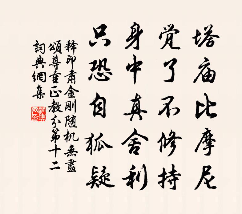 詩詞名句歷史字典書法欣賞書法字典國語詞典說文解字康熙字典古漢語字典標 題 作 者 詩 句 金剛隨機無盡頌尊重正教分第十二作者:釋印肅 朝代:宋代原文塔廟比摩尼,覺了不修持。身中真舍利,只恐自狐疑。詩詞問答問:《金剛隨機無盡頌尊重正教分第十二》的作者是誰?答:釋印肅問:該詩寫於哪個朝代?答:宋代書法欣賞金剛隨機無盡頌尊重正教分第十二書法作品詩詞推薦剃剪林榮釋智愚〔宋代〕眾枝爾為得,養生何所親。篋中三雨鐵,雲外一閒身。黑白已無幾,修治轉失真。畏寒宜少伐,未愧舀溪人。紹興祀大火十二首佚名〔宋代〕登降上下,奠壁獻斝。音送粥粥,禮無達者。已虞至旦,神其將歸。顧我國家,遺以繁釐。投謁齊己乾康〔唐代〕隔岸紅塵忙似火,當軒青嶂冷如冰。烹茶童子休相問,報導門前是衲僧。東庵與道者語有感張蘊〔宋代〕瘦策松間日又斜,更過東崦吃僧茶。丹青嶺樹膽寒葉,水墨江天噪亂鴉。付酒一杯真樂事,讀書萬卷是愁涯。更嘗讀杜詩史彌寧〔宋代〕滿地干戈老厭逢,酒杯詩卷吒孤忠。自人風雅離騷後,數到而今無此翁。題汪水雲詩卷十首胡斗南〔宋代〕十里鶯花處處嬌,南新橋過北新橋。船來船去東風裡,何處佳人弄玉蕭。偈十三首釋法泰〔宋代〕咄咄,何似生,穿雲俊鶻摩青天。抬眸一顧十萬里,林間鈍羽空忙然。求解會,著言詮,還同日午打三更。爭如一寄意三絕胡仲弓〔宋代〕共底銀瓶事已非,鴛鴦打散鴨驚飛。千金莫試秋胡婦,持向青樓買笑歸。鱉山王應麟〔宋代〕天柱不可折,柱折不可撐。九鼎不可覆,鼎覆人莫扛。袁公烈丈夫,獨立東南方。欲以一己力,代國相頡頏。適遭孝宗明堂前朝獻景靈宮八首真宗〔宋代〕歲逢有年,月旅無射。我將我鄉,如幾如式。肅爾臣工,諧爾金石。本原休功,垂裕罔極。之靈岩三首韓維〔宋代〕山高景逾變,所覽今非昨。雲覆嵩頂寒,河傾灘面□。□中塔廟涌,日暮鐘磬作。延首望洛城,氣象□□□。宴駙馬宅張蠙〔唐代〕牙香禁樂鎮相攜,日日君恩降紫泥。紅藥院深人半醉,綠楊門掩馬頻嘶。座中古物多仙意,壁上新詩有御題。別向雨夜書感陸游〔宋代〕宦遊四十年,歸逐桑榆暖;皇恩念黎老,一官猶置散。春殘桃李盡,風雨閉空館,有懷無與陳,萬事付酒碗。近代自鹹平至太康鞍馬間得十小詩寄懷晏叔原並問黃庭堅〔宋代〕紅梅定自開,有酒無人對。歸時應好在,常恐風雨晦。和何元清韻九絕王炎〔宋代〕一洗平生箏笛耳,極知綠綺有遺音。君臣慶會休三弄,泉石膏肓不可針。九日三首蘇轍〔宋代〕 * 與秋競,白須隨日添。時人知不憙,野老未相嫌。但酌清樽盡,猶存薄俸沾。日西聞客至,更問酒家簾。念奴嬌(冬日賞菊次前韻)姚述堯〔宋代〕霜風初過,正仙吏微吟,詩喉清咽。靜對南山真賞處,秋後一亭花月。翠簇香裀,光搖今勝,玉女肌凝雪。寒城無戲贈叔嘉陳藻〔宋代〕七夕劉郎開小筵,細君重九病方痊。如何依舊煩縴手,伏枕呻吟到冬首。乃知貴骨真柔弱,老夫此語非諧謔。劉郎琵琶亭董嗣杲〔宋代〕艱難罹歉歲,寂寞向他州。分絕青雲上,家遙滄海頭。空江盪寒月,枯葦積荒洲。不奈譙城角,嗚嗚吹亂愁。倚柴關韋莊〔唐代〕杖策無言獨倚關,如痴如醉又如閒。孤吟盡日何人會,依約前山似故山。名句推薦登高望蓬流,想像金銀台。李白《游泰山六首》 貴富而不知道,適足以為患,不如貧賤。呂不韋《呂氏春秋·紀·孟春紀》 理貴有中,不必過厚李大師、李延壽《南史·列傳·卷十八》 得成比目何辭死,願作鴛鴦不羨仙。盧照鄰《長安古意》 問姓驚初見,稱名憶舊容。李益《喜見外弟又言別》 埋骨何須桑梓地,人生無處不青山。 * 《七絕·改西鄉隆盛詩贈父親》 黃鸝驚夢破,青鳥喚春還。張弘范《臨江仙·憶舊》 白雪關山遠,黃雲海戍迷。李白《紫騮馬》 毀譽從來不可聽,是非終久自分明。馮夢龍《警世通言·卷四》 翻空白鳥時時見,照水紅蕖細細香。蘇軾《鷓鴣天·林斷山明竹隱牆》