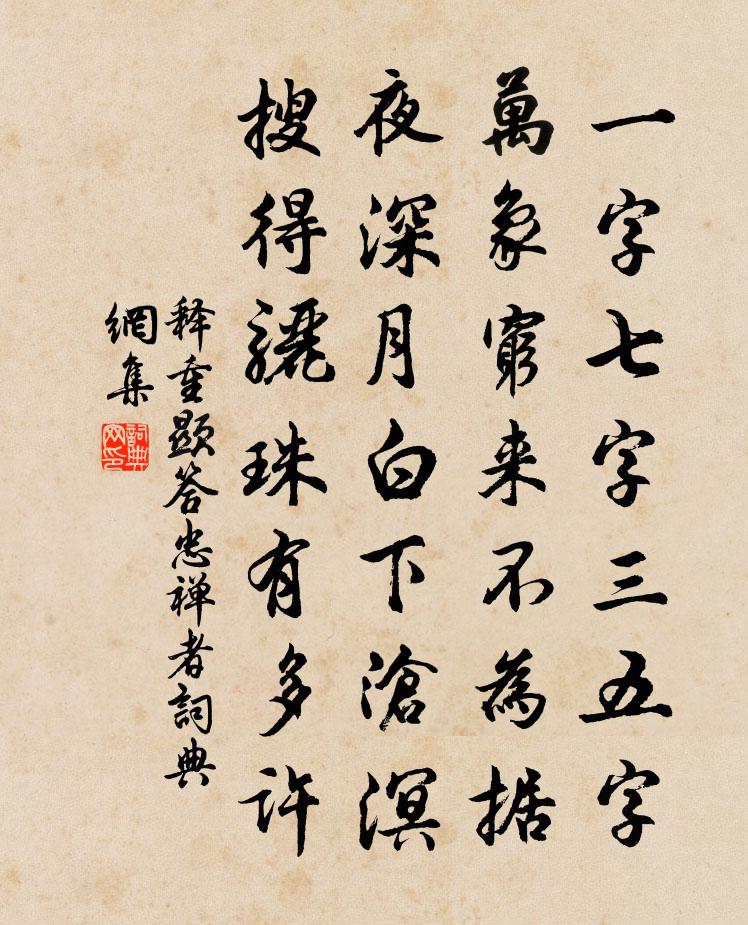 詩詞名句歷史字典書法欣賞書法字典國語詞典說文解字康熙字典古漢語字典標 題 作 者 詩 句 答忠禪者作者:釋重顯 朝代:宋代答忠禪者原文一字七字三五字,萬象窮來不為據。夜深月白下滄溟,搜得驪珠有多許。詩詞問答問:答忠禪者的作者是誰?答:釋重顯問:答忠禪者寫於哪個朝代?答:宋代釋重顯答忠禪者書法欣賞答忠禪者書法作品詩詞推薦擬九頌通德門程公許〔宋代〕馳余馬兮南北,慨永懷兮故國。豈喬木兮吾名,繄世臣兮取則。許史兮金張,煜煜兮煌煌。薰天兮富貴,達觀兮秕隨鳧岩瀑布孫應時〔宋代〕高山流水去沉沉,並落長屏百仞深。暗有衝風起崖腹,散成飛雨到潭心。梯空直下知無計,攀木旁窺戰不禁。好著春日曲徐照〔宋代〕中婦掃蠶蟻,挈籃桑樹間。小姑摘新茶,日斜下前山。示寶覺二首王安石〔宋代〕火暖窗明粥一盂,晨興相對寂無魚。超然聖寺山林外,別有禪天好淨居。天津橋劉叉〔唐代〕洛陽宮闕照天地,四面山川無毒氣。誰令漢祖都秦關,從此奸雄轉相熾。寒食二首劉克莊〔宋代〕歷歷曉風傳廟鼓,曈曈霽日上窗紗。孫同魚隊忙觀社,翁入雞窠且守家。已是濕灰並槁木,不知榆火與楊花。燔山過丫頭岩楊萬里〔宋代〕告老身心日互催,又將烏帽點黃埃。丫頭岩下來仍往,四十三年十二回。雜詠一百首維摩劉克莊〔宋代〕面色削瓜黃,眉毫覆雪長。安知四天下,只在一禪床。挽處士吳德載二首陳棣〔宋代〕范蠡操贏日,相如病渴時。瓶罌雖屢罄,砭劑已難施。薤露鴒原慘,松塋雁序悲。更嗟垂白叟,泣送寧馨兒。偈頌八十七首釋慧開〔宋代〕爛柴頭,火一團。急著眼,莫顢頇,星在枰兮不在盤。黃鶴洞中仙 本名卜運算元 示眾王丹桂〔元代〕奉勸修仙客,各要常寧耐。萬難千魔志轉堅,休把初心改。渾似蟾光大,瑩靜長天外。斡運無私滿大千,信使浮雲奉酬辛大夫喜湖南臘月連日降雪見示之作劉長卿〔唐代〕長沙耆舊拜旌麾,喜見江潭積雪時。柳絮三冬先北地,梅花一夜遍南枝。初開窗閣寒光滿,欲掩軍城暮色遲。閭里雜言寇準〔宋代〕我徒曠達由胸臆,恥學鯫生事文墨。蛟龍長欲趁風雷,騏驥焉能制銜勒。鏘金佩玉良有時,丐色諛言盡虛飾。功名導引佚名〔宋代〕天儀安豫洽無為。九域被雍熙。鸞刀親割升圭瓚,清廟展孝思。簫韶九變皇靈格,嘏告顯深慈。精誠動感歸能饗,送饒司理端學劉克莊〔宋代〕一郡夸饒掾,才名果不虛。忽聞歸去勇,極恨往還疏。囚戴公平德,奴擔性理書。京華逢友舊,為說閉門居。令既有高邸之行而束孝先兄弟索余詩云王令〔宋代〕擾擾利學者,久不可與謀。讀書乃何為,老不知軻丘。弗恤義所在,務期高爵收。嘗聞失則嗟,不聞得之羞。知誰和學士秋懷一十五首李彌遜〔宋代〕十年行地一虛舟,過眼風煙幾度秋。華發半從身外老,故山時得夢中游,曉發秀州城南方回〔宋代〕較似蘇湖郡,無山四渺然。近城先見塔,出戶即乘船。曉澤升紅日,秋光際碧天。稻粱無不足,最憶舊豐年。吳種柳枉教輒復奉答艾性夫〔宋代〕天地窮東野,江湖困子長。逢人雙白眼,炫俗小紅裳。舊句傳楓冷,新吟帶柳香。還能相料理,亦足慰淒涼。再游上方范成大〔宋代〕僧共老花俱在,客將春鴈同回。范叔一寒如此,劉剆前度曾來。名句推薦草色全經細雨濕,花枝欲動春風寒。王維《酌酒與裴迪》 映階碧草自春色,隔葉黃鸝空好音。杜甫《蜀相》 臣敢竭股肱之力,效忠貞之節,繼之以死!陳壽《三國志·蜀書·諸葛亮傳》 昔時人已沒,今日水猶寒。駱賓王《於易水送人 / 於易水送別》 念歸林葉換,愁坐露華生。張九齡《西江夜行》 秋色到空閨,夜掃梧桐葉。夏完淳《卜運算元·秋色到空閨》 千人同心則得千人力,萬人異心則無一人之用。劉安及其門客《淮南子·兵略訓》 三思而後行。孔子弟子《論語·公冶長篇》 上交不諂,下交不瀆佚名《易傳·繫辭傳下·第五章》 有情風、萬里卷潮來,無情送潮歸。蘇軾《八聲甘州·寄參寥子》