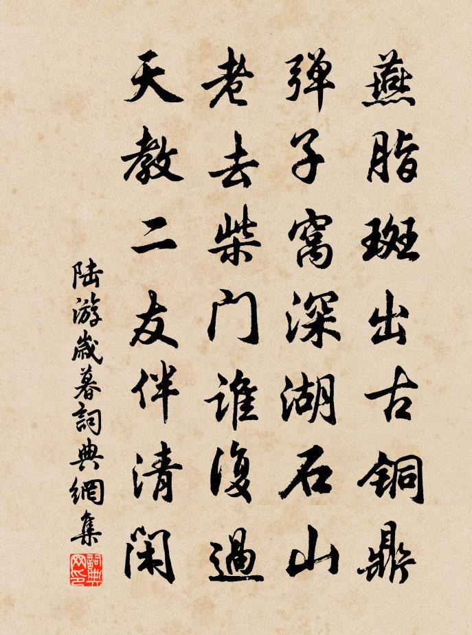 詩詞名句歷史字典書法欣賞書法字典國語詞典說文解字康熙字典古漢語字典標 題 作 者 詩 句 歲暮作者:陸游 朝代:宋代歲暮原文燕脂斑出古銅鼎,彈子窩深湖石山。老去柴門誰復過,天教二友伴清閒。詩詞問答問:歲暮的作者是誰?答:陸游問:歲暮寫於哪個朝代?答:宋代問:陸游的名句有哪些?答:陸游名句大全陸游歲暮書法欣賞歲暮書法作品詩詞推薦史德夫作渚雲亭蘇養直有詩餘初未識蘇次共韻李彌遜〔宋代〕新亭花木低几杖,葉幄已成藏遠山。小渚雲生夜深月,十分秋思五湖間。百寶妝長筌子〔元代〕一點靈光,輪迴萬劫,胎卵濕化無歇。苦海無涯,生滅甚時徹。無根四大非堅固,戀此個形骸何太拙。把浮沉世夢次黃仲甄峽中韻李流謙〔宋代〕九江度盡惡風波,峽口窺天一握多。亦愛吾廬覺歸好,數乘此險奈觀何。響迎濤瀨將愁上,青惜峰巒等夢過。不管古別離陸游〔宋代〕孤城窮巷秋寂寂,美人停梭夜嘆息。空園露濕荊棘枝,荒蹊月照狐狸跡。憶君去時兒在腹,走如黃犢爺未識。紫姑懹昔陸游〔宋代〕奮跡窮閻本甚微,刺天何敢慕群飛。業文僅與驢書券,學射才因鼠發機。罟擭縱橫真脫命,風波澒洞尚餘威。朝冠游武夷葉樞〔宋代〕孤台起天半,群峰羅崔巍。大王挺其間,玉女相因依。上攀牛半墟,下窺鷗鷺磯。神仙遙可接,靈草正秋肥。念此秋庭午吏散王安石〔宋代〕秋庭午吏散,予亦歸息偃。豈無嘉賓客,欲往心獨懶。北窗古人篇,一讀三四反。悲哉不蚤計,失道行晼晼。重陽喻良能〔宋代〕一年秋節重陽濃,園林上下皆清風。遠山百里削寒玉,平湖十畝磨青銅。亦好茂樹蓊西北,露枝霜葉紛青紅。枝頭逍遙詠宋太宗〔宋代〕照然明道德,萬象有其端。變化疑誰信,超凡入聖看。幽玄深自在,眇邈就中難。但味風塵里,方知宇宙寬。賀新郎 題西湖官驛水閣 松江府志卷十九,注佚名〔宋代〕倩來管鸞傳語。管問陸家兄管弟翩翩,今歸何處。留下管藏萬壑,時作雲煙吞吐。謾徙倚、朱蘭凝佇。蘭外瑁湖誰訴衷情張掄〔宋代〕閒中一首醉時歌。此樂信無過。陽春自來寡和,誰與樂和。言不盡,意何多。且蹉跎。功名莫問,富貴休言,到底永福寺黃甲〔宋代〕永福叢林古道場,煙霞深處白雲堂。木魚堂下常虛設,擊動龍王無處藏。送夤上人歸道場山釋智圓〔宋代〕行行攜錫別,幽景到山分。殘雪經春在,疏鍾度水聞。松深生晚吹,潭靜照閒雲。岩閣重開講,清香入夜焚。夜泊彭蠡風大作黎廷瑞〔宋代〕卸帆月欲墮,泊岸風轉急。驚砂傳鐵箭,飛霰散瓊粒。重湖太古水,帝遣龍下吸。潛鱗失故穴,蒼黃望舟入。寧知送李明府去官錢起〔唐代〕謗言三至後,直道嘆何如。今日藍溪水,無人不夜魚。贈惠崇上人魏野〔宋代〕張籍眼昏心不昧,崇師耳聵性還聰。是非言語徒喧世,贏得長如在定中。水龍吟(江樓席上,歌姬盼盼翠鬢侑樽,酒行彈琵琶曲,舞梁州,醉語贈之)趙長卿〔宋代〕酒潮勻頰雙眸溜。美映遠山橫秀。風流俊雅,嬌痴體態,眼前稀有。蓮步彎彎,移歸拍里,凌波難偶。對仙源醉眼晚春偶題呈正甫先生釋斯植〔宋代〕老來春去怯憑欄,今古興亡一笑間。滿徑落紅人不到,杜鵑啼雨入空山。失題四首曾國藩〔清代〕蜒雨蠻煙日日催,側身周望重低徊。海濱膏血深無極,帳下笠歌自莫哀。安得賈生時痛哭,可憐楊仆本庸才。投章題李上謨壁李商隱〔唐代〕舊著思玄賦,新編雜擬詩。江庭猶近別,山捨得幽期。嫩割周顒韭,肥烹鮑照葵。飽聞南燭酒,仍及撥醅時。名句推薦且夫義者,政也。無從下之政上,必從上之政下。墨子《墨子·26章 天志(上)》 君子之道,暗然而日章;小人之道,的然而日亡。子思《中庸·第三十三章》 人情反覆,世路崎嶇。洪應明《菜根譚·概論》 時靸雙鴛響,廊葉秋聲。吳文英《八聲甘州·靈岩陪庾幕諸公游》 人生易老天難老,歲歲重陽。 * 《採桑子·重陽》 子胥既棄吳江上,屈原終投湘水濱。李白《行路難三首》 林壑斂暝色,雲霞收夕霏。謝靈運《石壁精舍還湖中作》 苜蓿闌乾滿上林,西風殘秣獨沉吟。王鵬運《浣溪沙·題丁兵備丈畫馬》 為有雲屏無限嬌,鳳城寒盡怕春宵。李商隱《為有》 可憐日暮嫣香落,嫁與春風不用媒。李賀《南園十三首》