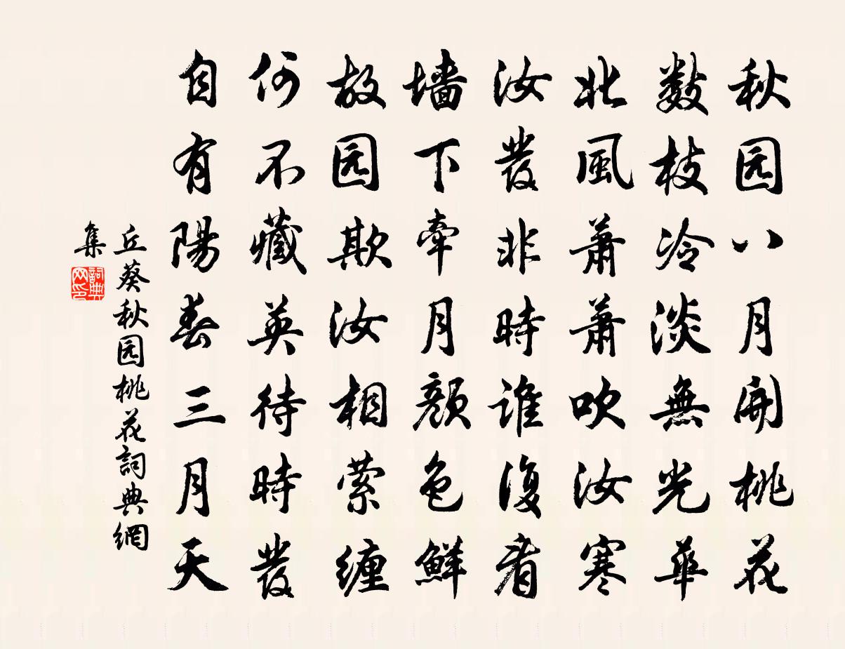 詩詞名句歷史字典書法欣賞書法字典國語詞典說文解字康熙字典古漢語字典標 題 作 者 詩 句 秋園桃花作者:丘葵 朝代:宋代秋園桃花原文秋園八月開桃花,數枝冷淡無光華。北風蕭蕭吹汝寒,汝發非時誰復看。牆下牽月顏色鮮,故園欺汝相縈纏。何不藏英待時發,自有陽春三月天。詩詞問答問:秋園桃花的作者是誰?答:丘葵問:秋園桃花寫於哪個朝代?答:宋代丘葵秋園桃花書法欣賞秋園桃花書法作品詩詞推薦初夏客懷釋行海〔宋代〕綠樹成陰四月天,紫桐花放石池邊。風光暗換人雙鬢,一別江南二十年。送韓山人文同〔宋代〕昌黎山人抱藜杖,三度訪我於三隅。端然入座更誰顧,談辯袞袞如流珠。靈丹嘗凝日月鼎,至寶自產乾刊爐。要行挽王季海丞相孫應時〔宋代〕聖世持盈計,慈皇閱士多。十年深注倚,一德妙中和。日月長循軌,邊疆竟息戈。到今清淨化,仿佛漢民歌。偈頌十三首釋智遇〔宋代〕遠之莫及故日短,蹤之不即故曰蓬。波波浪浪,西西東東。直鉤已掛雙峨碧,一橈香散蘆花風。與郛郎作骨董羹四首釋慧空〔宋代〕詩人例窮無可佳,借蔬貸粟東西家。胸中一字不療餒,奈此滿篋皆雲霞。郛郎之貧亦相似,眼高視世如空花。兩翁和用明梅十三絕胡寅〔宋代〕醉把天葩嚼蕊香,筆端翻水趁詩狂。結成卻薦和羹鼎,妙手先從錡釜湘。和竹溪懷樗庵二首劉克莊〔宋代〕偶賦東風御柳詩,流傳誤柬九重知。昔曾苑內借全樹,今向林間巢一枝。已買十牛耕笠澤,難陪八駿宴瑤池。鬳翁菊王之道〔宋代〕千林搖落見孤芳,色映青松破嫩黃。玉露淒涼三逕晚,金英芬馥幾叢香。賀新郎(京學類申時作)姚勉〔宋代〕劍吼蛟龍怒。問蒼天、功名兩字,幾時分付。生個英雄為世用,須早青雲得路。卻底事、知音未遇。兩度入天飛折廢寺胡仲弓〔宋代〕鐘鼓蕭條久,誰從此地來。僧房無戶牖,佛面有塵埃。碑斷眠荒草,廓空長綠苔。鵂鶹並蝙蝠,時或此徘徊。和陳蹇叔郎中乙已上元晴和楊萬里〔宋代〕御柳梢頭晚不風,官梅面上雪都融。如何閶闔新春夜,頓有芙蕖滿眼紅。十里沙河人最鬧,三千世界月方中。買燈四友相陪亭馬廷鸞〔宋代〕誰伴幽人飽歲寒,霜葩雪乾翠琅玕。眼前交道如渠少,好作長年耐久看。琴二首王令〔宋代〕古風寥落欲何尋,常記南風素意深。聞說五弦弦不斷,欲於何處借人琴。西江月尹志平〔元代〕我愛西岩秀麗,仙園地發三陽。山形曲屈臥龍岡。只此人間天上。雲舍茅庵掩映,仙花異果馨香。市朝客到見清涼秋陰宋祁〔宋代〕擁棟溪雲暝夕霏,蕭辰寥落意多違。寒蟬自為齊王怨,歸燕長逢阿母飛。杜若汀洲殘綠暗,芙蓉池沼墜紅稀。流塵次周尚書八首許月卿〔宋代〕詩律無寒□鄴州,家風洗耳□□侯。□傳以酒為真印,萬法惟梅不共流。倖免五經嘲笥腹,可無百尺進竿頭。從來偈頌一百三十六首釋惟一〔宋代〕夏令更新,春歸奏動。秧田鋪翠,麥隴翻雲。日猶舒暖,風已來熏。目擊道存如不委,更饒一喝主賓分。感事三十四韻(丁卯已後)韓偓〔唐代〕紫殿承恩歲,金鑾入直年。人歸三島路,日過八花磚。鴛鷺皆回席,皋夔亦慕膻。慶霄舒羽翼,塵世有神仙。雖遇樗蒲行楊維楨〔元代〕七十說不合,片談立封侯。百哉失飛臂,斗酒得涼州。人言遇不遇,不系人劣憂。亡羊與得鹿,等付盧雉投。獨不謝壽安縣惠神林山牒邵雍〔宋代〕西南有山高崔嵬,亂峰圍繞如蓬萊。中間有地可容足,泉甘木茂無塵埃。諸君之意一何厚,協謀判給如風雷。天津名句推薦雪似梅花,梅花似雪。呂本中《踏莎行·雪似梅花》 鴻雁不堪愁里聽,雲山況是客中過。李頎《送魏萬之京》 泠泠七弦上,靜聽松風寒。劉長卿《聽彈琴》 靈山多秀色,空水共氤氳。張九齡《湖口望廬山瀑布泉 / 湖口望廬山瀑布水》 聚散匆匆,雲邊孤雁,水上浮萍。劉過《柳梢青·送盧梅坡》 松竹翠蘿寒,遲日江山暮。曹組《卜運算元·蘭》 棹動芙蓉落,船移白鷺飛。蕭綱《採蓮曲》 重陽過後,西風漸緊,庭樹葉紛紛。晏殊《少年游·重陽過後》 典盡客衣三尺雪,煉精詩句一頭霜。王建《維揚冬末寄幕中二從事》 五原春色舊來遲,二月垂楊未掛絲。張敬忠《邊詞》
