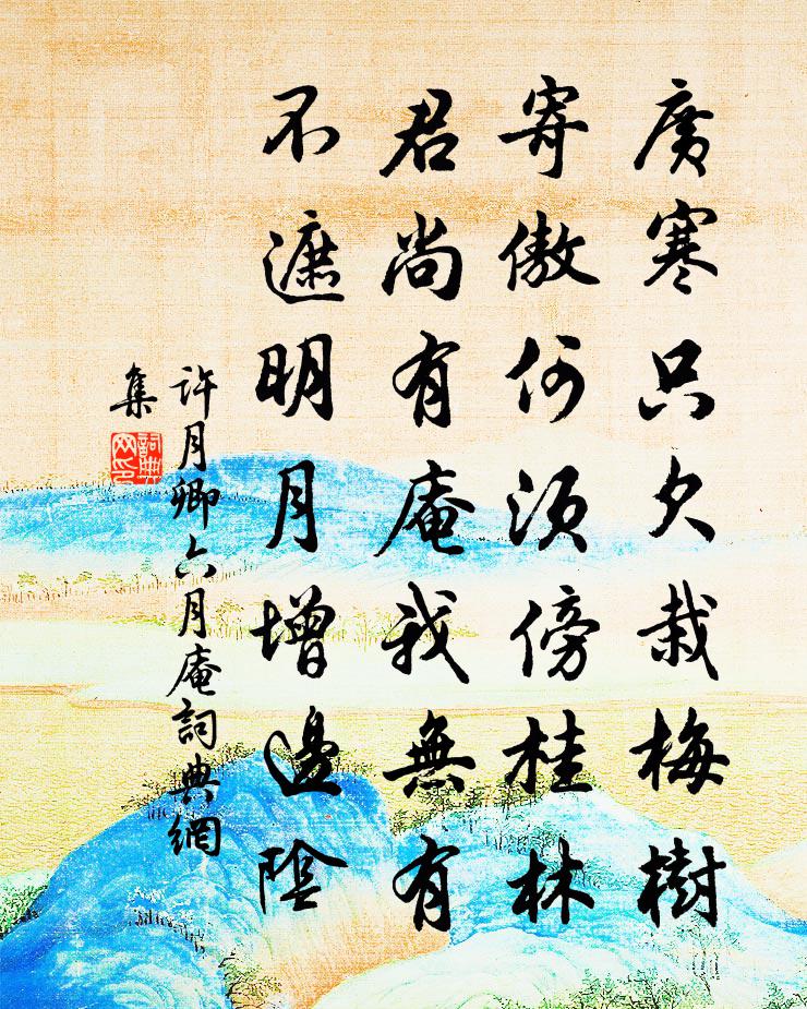 詩詞名句歷史字典書法欣賞書法字典國語詞典說文解字康熙字典古漢語字典標 題 作 者 詩 句 月庵作者:許月卿六 朝代:宋代月庵原文廣寒只欠栽梅樹,寄傲何須傍桂林。君尚有庵我無有,不遮明月增邊陰。詩詞問答問:月庵的作者是誰?答:許月卿六問:月庵寫於哪個朝代?答:宋代許月卿六月庵書法欣賞月庵書法作品詩詞推薦酬陳翃郎中冬至攜柳郎竇郎歸河中舊居見寄盧綸〔唐代〕三旬一休沐,清景滿林廬。南郭群儒從,東床兩客居。燒煙浮雪野,麥隴潤冰渠。班白皆持酒,蓬茅盡有書。終期劉季澄投贈新詩,次韻為謝楊萬里〔宋代〕君操筆耒啟新畲,耕遍西溪萬卷余。藜杖芒鞋來得得,柳風花雨政疏疏。是家人物孫如祖,驚代詩文我愛渠。努力天光觀句士良〔宋代〕古殿千年屋,高松百尺陰。真人不可問,時有鶴遺音。相見歡·花前顧影粼毛奇齡〔清代〕花前顧影粼粼。水中人。水面殘花片片繞人身。 私自整,紅斜領,茜兒巾。卻訝領間巾里刺花新。演雅十章張至龍〔宋代〕犬眠蒼玉地,貓臥香綺叢。徜無鼠與盜,貓犬命亦窮。次韻楊宰食蓮戲作陳造〔宋代〕詩到衰翁耐病時,辟渠三舍更何疑。才高王儉幕中雋,氣懾孫郎帳下兒。向我論交得無意,他時懷舊更長思。蓮莖如夢令蔡伸〔宋代〕人靜重門深亞。朱閣畫簾高掛。人與月俱圓,月色波光相射。瀟灑。瀟灑。人月長長今夜。贈鐵面王說易馬廷鸞〔宋代〕春風吹袂過溪塘,有客來稱鐵面郎。今代貴人甘軟媚,可能骯髒倚門牆。和早春層樓趙希逢〔宋代〕誰架齊雲百尺樓,舞衫歌扇貯風流。可憐腳力衰多矣,身未上時心已愁。蘇幕遮宋先生〔宋代〕氣隨神,神隨氣。神氣相隨,透入泥丸里。長把金關牢鎖閉。捉得金晶,暗地添歡喜。下辛勤,鬚髮志。十二時中楚江懷古殷堯藩〔唐代〕騷靈不可見,楚些竟誰聞。欲采蘋花去,滄州隔暮雲。楊柳枝葛長庚〔宋代〕挼碎梅花一斷腸。送斜陽。風煙縹緲月微茫。又昏黃。平野寒蕪何處斷,接天長。短籬淺水橘青黃。度清香。偈頌九十三首釋梵琮〔宋代〕忻逢四老,頭白如新。喙長百尺,鼻重千年。眼隨青嶂合,眉帶野花顰。迎來送去,以表殷勤。為何如此,遠親不多病李呂〔宋代〕守靜偏多病,爭先素不能。材非經世具,分合出家僧。利路防深穽,窮居任曲肱。息交休擾擾,藏拙要儚儚。送樓大防粹丹丘喻良能〔宋代〕我以疏慵丐外遷,公乎何事亦翩然。兩家俱有親庭樂,且結斑衣自在緣。青雲亭李壁〔宋代〕平林野水帶孤城,倦客登臨太瘦生。過眼千花競紅紫,可憐霜鬢轉分明。秋旱李呂〔宋代〕天公作意雨垂垂,風伯顛狂散萬絲。執法若能誅首惡,更將京觀築鯨鯢。紹興祀神州地祗十六首佚名〔宋代〕崇崇其壇,屹矣屢級。佩約步趙,降登中節。左瞻右睨,祥風藹集。斿斾羽紛,昭鑒翊翊。暮春道中聞蟬張嵲〔宋代〕西山日落東山明,長風吹花客心驚。房州氣候不可解,嫩葉暗中蟬亂鳴。菩薩蠻(回文)程垓〔宋代〕暑庭消盡風鳴樹。樹鳴風盡消庭暑。橫枕一聲鶯。鶯聲一枕橫。扇紈低粉面。麵粉低紈扇。涼月淡侵床。床侵淡月名句推薦大丈夫當橫屍戰場,奈何狼藉都市。李大師、李延壽《南史·列傳·卷十九》 至樂無樂,至譽無譽。莊子《莊子·外篇·至樂》 小舟橫截春江,臥看翠壁紅樓起。蘇軾《水龍吟·閭丘大夫孝終公顯嘗守黃州》 朝真暮偽何人辨,古往今來底事無。白居易《放言五首·其一》 無限河山淚,誰言天地寬夏完淳《別雲間》 耐寒唯有東籬菊,金粟初開曉更清。白居易《詠菊》 中夜四五嘆,常為大國憂。李白《經亂離後天恩流夜郎憶舊遊書懷贈江夏韋太守良宰》 世事短如春夢,人情薄似秋雲。朱敦儒《西江月·世事短如春夢》 繁枝容易紛紛落,嫩葉商量細細開。杜甫《江畔獨步尋花七絕句》 三日柴門擁不開,階平庭滿白皚皚。柳宗元《酬王二十舍人雪中見寄》
