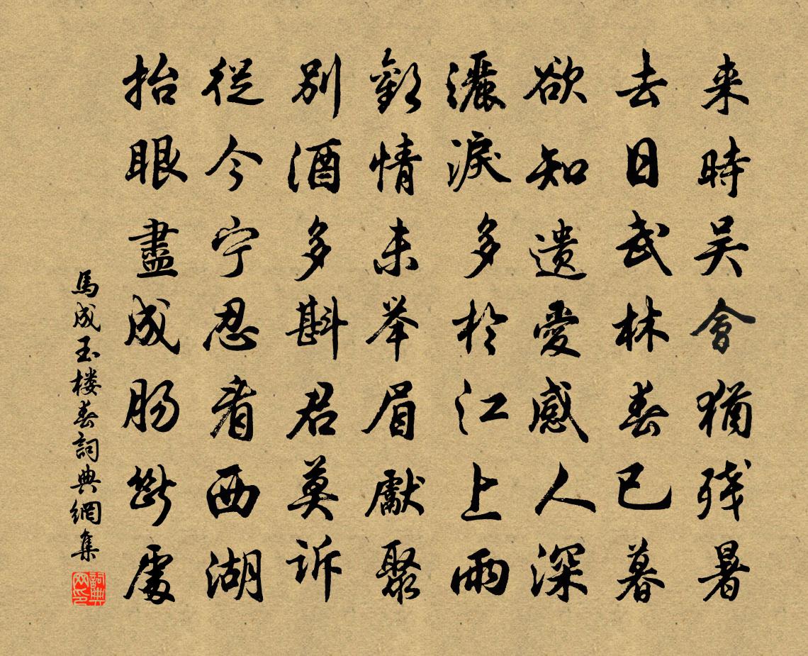 詩詞名句歷史字典書法欣賞書法字典國語詞典說文解字康熙字典古漢語字典標 題 作 者 詩 句 玉樓春作者:馬成 朝代:宋代玉樓春原文來時吳會猶殘暑。去日武林春已暮。欲知遺愛感人深,灑淚多於江上雨。歡情未舉眉先聚。別酒多斟君莫訴。從今寧忍看西湖,抬眼盡成腸斷處。詩詞問答問:玉樓春的作者是誰?答:馬成問:玉樓春寫於哪個朝代?答:宋代問:玉樓春是什麼體裁?答:詞馬成玉樓春書法欣賞玉樓春書法作品詩詞推薦射梅李龍高〔宋代〕由基去後揮瞻來,不慣穿楊慣射梅。寄語東居莫塗抹,犧樽自是木之災。失調名佚名〔宋代〕細雨亂如毛。句李如箎〔宋代〕繅車籬落桑陰盡,土鼓鄉亭稻葉青。偈頌三十首釋印肅〔宋代〕失卻本來面目,個個日南長至。先祖時節苦臨,處處笙歌樂醉。也參禪,亦詳義,也貧窮,亦富貴。蒙頭塞耳有誰哀傳馬韓維〔宋代〕喧呼國西門,驛使通萬里。十亭傳一馬,日夜不得止。枯腸嗛芻豆,瘦骨擊轡箠。力盡求未息,忽已仆泥滓。死者問養生於曾端伯郭印〔宋代〕平生慕道心,荏苒歲月永。尠福未逢人,桑榆驚短景。使君蓬萊仙,天遣下塵境。訟簡刑獄清,吏退文書省。詩鋒雪峰空長老求贊釋宗杲〔宋代〕慧空抓著吾癢處,吾嘗劄著伊痛處。痛處癢,癢處痛,不與千聖同途,豈與衲僧共用。莫言掃帚竹時無錢筒,蒿枝刑部尚書致仕白居易〔唐代〕十五年來洛下居,道緣俗累兩何如?迷路心回因向佛,宦途事了是懸車。全家遁世曾無悶,半俸資身亦有餘。唯是器孀嫂王洋〔宋代〕雙眼失明二十載,一身病臣四周年。俱生孤女眼前死,諸御四兒姑幸全。偏歷人間真苦惱,略無身後好因緣。靜思柳慕幽〔唐代〕今古憑君一贈行,幾回折盡復重生。五株斜傍淵明宅,千樹低垂太尉營。臨水帶煙藏翡翠,倚風兼雨宿流鶯。隋皇賦殘雪釋乾康〔宋代〕六出奇花已住開,君城相次見樓台。時人莫馬和泥看,一片飛從天上來。挽林紹伊二首吳芾〔宋代〕早負經綸志,居然欲起家。持身惟孝友,告後盡忠嘉。位望隆青瑣,文章在白麻。忍聞埋玉樹,四海共驚嗟。憶昔韋莊〔唐代〕昔年曾向五陵游,子夜歌清月滿樓。銀燭樹前長似晝,露桃華里不知秋。西園公子名無忌,南國佳人號莫愁。今日龍圖閣會宴應製楊億〔宋代〕冊府藏書在紫微,退朝稽古助論思。中天召宴衢樽滿,乙夜觀文列象垂。綵鳯翩翻巢綺閣,靈龜夭矯冠金碑。大風再用前韻哭德久張元乾〔宋代〕女無美惡妬深宮,盛德如公果不容。何遽蓋棺臨禹穴,未應藏骨在秦峰。論文平日樽中酒,掛劍它年冢上松。點檢托宿方山余庵邵棠〔宋代〕世上飛塵不到山,蕭蕭佛屋兩三間。老僧飽玩松花月,春去春來意自閒。蓮峰前軒司空圖〔唐代〕人間上壽若能添,只向人間也不嫌。看著四鄰花競發,高樓從此莫垂簾。戲答朝士李都〔唐代〕華緘千里到荊門,章草縱橫任意論。應笑鍾張虛用力,卻教羲獻枉勞魂。惟堪愛惜為珍寶,不敢傳留誤子孫。深荷花月吟效連珠體十一首 6唐寅〔明代〕高台明月照花枝, 對月看花有所思。 今夜月圓花好處, 去年花病月昏時。 飲杯酬月澆花酒, 做首評花詠晚望貫休〔唐代〕曠望危橋上,微吟落照前。煙霞濃浸海,川岳闊連天。白鳥格不俗,孤雲態可憐。終期將爾輩,歸去舊江邊。名句推薦行水得其理,漂石折舟;用民得其性,則令行如流。孫臏《孫臏兵法·奇正》 秋氣堪悲未必然,輕寒正是可人天。楊萬里《秋涼晚步》 強欲登高去,無人送酒來。岑參《行軍九日思長安故園》 卻下水晶簾,玲瓏望秋月。李白《玉階怨》 且就洞庭賒月色,將船買酒白雲邊。李白《游洞庭湖五首·其二》 姑蘇城外寒山寺,夜半鐘聲到客船張繼《楓橋夜泊》 民之無良,相怨一方,受爵不讓,至於己斯亡。荀子《荀子·儒效》 春酒香熟鱸魚美,誰同醉?纜卻扁舟篷底睡。李珣《南鄉子·雲帶雨》 春思亂,芳心碎。惠洪《千秋歲·半身屏外》 自笑好山如好色,只今懷樹更懷人。閒愁閒恨一番新。辛棄疾《浣溪沙·偕叔高子似宿山寺戲作》