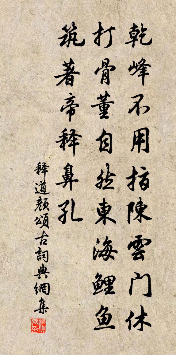 詩詞名句歷史字典書法欣賞書法字典國語詞典說文解字康熙字典古漢語字典標 題 作 者 詩 句 頌古作者:釋道顏 朝代:宋代頌古原文乾峰不用指陳,雲門休打骨董。自然東海鯉魚,築著帝釋鼻孔。詩詞問答問:頌古的作者是誰?答:釋道顏問:頌古寫於哪個朝代?答:宋代釋道顏頌古書法欣賞頌古書法作品詩詞推薦我愛淳安好陳曄〔宋代〕我愛淳安好,於民兩盡誠。明倫喜知勸,有社敬皆生。開學群材進,繙經眾說平。嗟予不如昔,徒爾景恢宏。早春招張賓客白居易〔唐代〕久雨初晴天氣新,風菸草樹盡欣欣。雖當冷落衰殘日,還有陽和暖活身。池色溶溶藍染水,花光焰焰火燒春。商山食飽白居易〔唐代〕食飽拂枕臥,睡足起閒吟。淺酌一杯酒,緩彈數弄琴。既可暢情性,亦足傲光陰。誰知利名盡,無復長安心。有感楊公遠〔宋代〕勘破浮生且任真,底須苦苦役精神。靜觀歷代千張紙,細數英才幾掬塵。朝市只尊黃閣貴,山林誰念素衣貧。如何張明遠自持其所居萃勝亭記來求詩為賦三篇馮時行〔宋代〕文章蓋代手,千載柳柳州。落筆記山水,奇香撼琳球。開卷一再續,宛若從之游。歷歷爽心目,毛髮為颼颼。若人贈無咎以既見君子云胡不喜為韻八首八張耒〔宋代〕南山縛虎師,肯顧世書字。揚眉喔楚喉,鼎畔倒侯喜。詩聲一蒼蠅,下到霹靂耳。庸庸老尋常,物外有奇偉。游張公洞黃庭堅〔宋代〕古洞深沉白晝間,煙霞出沒絕塵寰。落紅滿地花初歇,啼鳥一聲春自閒。丹灶苔荒仙去遠,松壇月冷鶴飛還。我來詠史伏生張玉孃〔宋代〕楚炬秦坑六籍埃,芳心爭忍不同灰。若非斯道終難隨,雪發應消異世才。蕭宅二三子贈答詩二十首客請蝦蟆盧仝〔唐代〕蝦蟆蟆,叩頭莫語人聞聲。揚州蝦蜆忽得便,腥臊臭穢逐我行。我身化作青泥坑。頌古十一首釋普濟〔宋代〕奴見婢殷勤,瞥喜瞥然嗔。瀟湘圖上看,分外好精神。如夢令許有壬〔元代〕老子風神清灑。好句自然傳寫。立雪賦梅花,更折綠條成把。閒雅。閒雅。莫道吉人辭寡。第一山閻蒼舒〔宋代〕極目平淮渺莽間,翠巒特地起煙鬟。要渠天下無雙手,題作東南第一山。徑山傾蓋亭范成大〔宋代〕萬杉離立翠雲幢,嫋嫋稀聞晚吹香。山下行人塵撲面,誰知世界有清涼?唐虞門再吟周曇〔唐代〕瀟湘何代泣幽魂,骨化重泉志尚存。若道地中休下淚,不應新竹有啼痕。和浙西李大夫晚下北固山喜徑松成陰悵然懷古…和依本韻劉禹錫〔唐代〕一辭溫室樹,幾見武昌柳。荀謝年何少,韋平望已久。種松夾石道,紆組臨沙阜。目覽帝王州,心存股肱守。葉動烏夜啼朱敦儒〔宋代〕翦勝迎春後,和風入律頻催。前回下葉飛霜處,紅綻一枝梅。正遇時調玉燭,須添酒滿金杯。尋芳伴侶休閒過,排送侍讀常尚書絕句六首劉克莊〔宋代〕制酒何曾把巨觥,拋書不復對寒檠。老儒願忍須臾死,要看諸賢起太平。次韻劉希顏李泰發龍井壽聖請獻辨才詩王洋〔宋代〕古人重好古,今人徒賞今。賞今拘近俗,何以勞寸心。昔者臞面仙,分符此來臨。邦君舍華軒,老人獨散襟。從容題濠州鍾離寺張祜〔唐代〕遙遙東郭寺,數里占原田。遠岫碧光合,長淮清派連。院藏歸鳥樹,鍾到落帆船。唯羨空門叟,棲心盡百年。感遇之廿六陳子昂〔唐代〕荒哉穆天子。好與白雲期。宮女多怨曠。層城閉蛾眉。日耽瑤池樂。豈傷桃李時。青苔空萎絕。白髮生羅帷。名句推薦善惡到頭終有報,只盼來早與來遲。佚名《增廣賢文·上集》 愁一箭風快,半篙波暖,回頭迢遞便數驛周邦彥《蘭陵王·柳》 日射人間五色芝,鴛鴦宮瓦碧參差。元好問《浣溪沙·日射人間五色芝》 日暮征帆何處泊,天涯一望斷人腸。孟浩然《送杜十四之江南 / 送杜晃進士之東吳》 福輕乎羽,莫之知載;禍重乎地,莫之知避。莊子《莊子·內篇·人間世》 中年親友難別,絲竹緩離愁。蘇軾《水調歌頭·安石在東海》 愛故不二,威故不犯。 故善將者,愛與威而已。尉繚《尉繚子·攻權》 想邊鴻孤唳,砌蛩私語。王沂孫《掃花游·秋聲》 穿花蛺蝶深深見,點水蜻蜓款款飛杜甫《曲江二首》 漳水出焉,東流注於河。佚名《精衛填海》