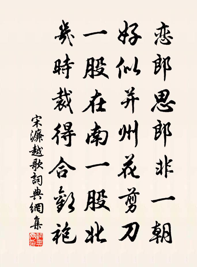 詩詞名句歷史字典書法欣賞書法字典國語詞典說文解字康熙字典古漢語字典標 題 作 者 詩 句 越歌作者:宋濂 朝代:明代越歌原文戀郎思郎非一朝,好似并州花剪刀。一股在南一股北,幾時裁得合歡袍? 詩詞問答問:越歌的作者是誰?答:宋濂問:越歌寫於哪個朝代?答:明代宋濂越歌書法欣賞越歌書法作品詩文賞析這首詩採用浙江地區民歌形式,用誇張手法,寫出封建社會中婦女嚮往婚姻自由的心情。 【解釋】①并州--今山西省太原市一帶,古代以產刀剪著名。②合歡袍--指婚服,袍上繡有成雙配對的花鳥魚蟲圖案,象徵美滿婚姻。這兩句是錯問剪刀何時裁成合歡袍,表示久戀的婦女渴望早日成婚。 詩詞推薦和詹守二首吳芾〔宋代〕一日相逢喜有餘,對談勝讀十年書。歡聲已溢枌榆社,和氣還蒸蓬蓽居。敢道主標攀靖節,或疑勝致到華胥。願言題陳景說詩稿後陳鑒之〔宋代〕倚馬揮萬言,跨驢喔一字。遲速不須論,紉雲看奇思。句勾台符〔宋代〕松門開碧嶂,五甃銷清泉。晦跡自貽釋重顯〔宋代〕圖畫當年愛洞庭,波心七十二峰青。如今高臥思前事,添得盧公倚石屏。梅花羅鄴〔唐代〕繁如瑞雪壓枝開,越嶺吳溪免用栽。卻是五侯家未識,春風不放過江來。朱少章曝麥為雨所漂晃沖之〔宋代〕看書不覺雨如澠,稚子驚呼妻怒嗔。豈意持竿護雞者,翻同挾策牧羊人。【中呂】齊天樂過紅衫兒_隱居張可久〔元代〕隱居潛身且入無何,醉里乾坤大。蹉跎,和,鄰友相合。就山家酒嫩魚活,當歌,百無拘逍遙,千自在快活。日日游寺雲觀劉應龍〔宋代〕雨絕春風和,沉棲慕遐矚。野火開叢荊,遙岑路徑熟。極頂如掌平,群峰四環矗。人言古觀基,突兀此有屋。半嶺謝九峰升坐相留陳藻〔宋代〕重陽七日月當圓,高坐禪師祝萬年。夢裡五更聞齒錄,凡夫有非是貪眠。東軒小室即事五首曾幾〔宋代〕卷書坐東軒,有竹甚魁偉。清風過其間,戛戛鳴不已。寫之以素琴,音節淡如水。不惜為 * ,臨流須洗耳。留別蔡槃〔宋代〕欲去休雲易,相思恐弗禁。一床秋雨夢,千里暮雲心。每自悲行役,知誰識老吟。西風聞過雁,記取問佳音。游靈公觀駱賓王〔唐代〕靈峰標勝境,神府枕通川。玉殿斜連漢,金堂迥架煙。斷風疏晚竹,流水切危弦。別有青門外,空懷玄圃心。代升天行鮑照〔南北朝〕家世宅關輔。勝帶宦王城。備聞十帝事。委曲兩都情。倦見物興衰。驟覩俗屯平。翩翻若回掌。恍惚似朝榮。窮途追悼親哥王炎〔宋代〕昔在清華日,明珠掌上新。豈期吾薄福,不見汝成人。荒冢魂長夜,空山草自春。姜涼無限恨,獨坐一沾巾。宋頌九首聖神石介〔宋代〕聖機神謀,天秘地藏,風行雷動。旦秣我馬,夕取其疆。題新澗亭兼酬寄朝中親故見贈白居易〔唐代〕何處披襟風快哉,一亭臨澗四門開。金章紫綬辭腰去,白石清泉就眼來。自得所宜還獨樂,各行其志莫相咳。禽魚句釋曇穎〔宋代〕家裡已無回日信,路邊空有望鄉牌。山中寄友人李九齡〔唐代〕亂雲堆里結茅廬,已共紅塵跡漸疏。莫問野人生計事,窗前流水枕前書。紀行雜詩李洪〔宋代〕石罅飛泉鳴佩玉,灘頭怒石響驚雷。故人相見應相笑,愛底微官觸暑來。官務陳造〔宋代〕磨陁為官多,曉了未更歷。今世從仕者,萬口用一律。文桉日從事,雁鶩竅投隙。自謀脫悔吝,初肯計易劇。追逮名句推薦賢不肖不雜則英傑至,是非不亂則國家治荀子《荀子·王制》 前年過代北,今歲往遼西薛道衡《昔昔鹽》 長安大雪天,鳥雀難相覓。張孜《雪詩》 涕零雨面毀形顏,誰能懷憂獨不嘆。曹丕《燕歌行二首·其二》 雖然不如延年妹,亦是當時絕世人。李白《中山孺子妾歌》 開荒南野際,守拙歸園田。陶淵明《歸園田居·其一》 日高煙斂,更看今日晴未。李清照《念奴嬌·春情》 不知近水花先發,疑是經冬雪未銷。張謂《早梅》 重見金英人未見,相思一夜天涯遠晏幾道《蝶戀花· * 開時傷聚散》 翠輦不來金殿閉,宮鶯銜出上陽花雍陶《天津橋望春》