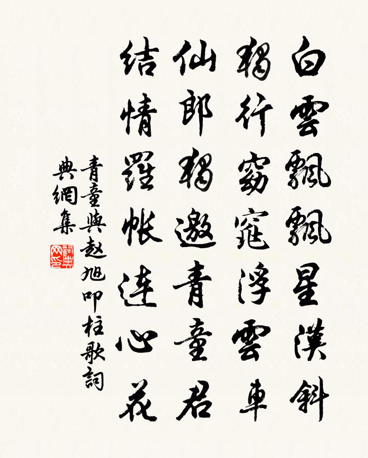 詩詞名句歷史字典書法欣賞書法字典國語詞典說文解字康熙字典古漢語字典標 題 作 者 詩 句 與趙旭叩柱歌作者:青童 朝代:唐代與趙旭叩柱歌原文白雲飄飄星漢斜,獨行窈窕浮雲車。仙郎獨邀青童君,結情羅帳連心花。詩詞問答問:與趙旭叩柱歌的作者是誰?答:青童問:與趙旭叩柱歌寫於哪個朝代?答:唐代問:與趙旭叩柱歌是什麼體裁?答:七古青童與趙旭叩柱歌書法欣賞與趙旭叩柱歌書法作品注釋全唐詩:卷863-34詩詞推薦和陶勸農六首蘇軾〔宋代〕天禍爾土,不麥不稷。民無用物,珍怪是直。播厥熏木,腐餘是穡。貪夫污吏,鷹摯狼食。峽中石介〔宋代〕路狹才容飛鳥過,山將生合柰山何。不知天外山長短,何事窺來一管多。村店劉過〔宋代〕溪邊猶棹酒船回,冷水灣頭雨意開。一路有詩吟不穩,當初悔不共君來。憶王孫汪元量〔宋代〕五陵無樹起秋風。千里黃雲與斷蓬。人物蕭條市井空。思無窮。惟有青山似洛中。病起窺園十絕劉克莊〔宋代〕雲里金烏瞥見些,屋山鵲語亦查查。侵晨掃徑開籬戶,童子知翁出看花。舍錢建閣深都寺釋了惠〔宋代〕非愚非賢,非親非冤。渠不在後,我不在先。共行難行道路,欲了未了因緣。以松為誓,後五百年。咄再來不直半謝韓秀才送松栽四首馮時行〔宋代〕餐松食柏老岩巒,藥餌從今可問端。發白顏蒼無復懼,骨青髓綠後來看。色隨春焙茶煙碧,涼入晨烹灶火殘。自是舟中和陳子東王柏〔宋代〕低垂紙帳絕纖埃,冷透孤衾夢易回。宿霧未收沙瀨黑,大江才近水程開。細搜景物歸詩句,盡逐羈愁入酒杯。最是奉和襲美謝友人惠人參陸龜蒙〔唐代〕五葉初成椵樹陰,紫團峰外即雞林。名參鬼蓋須難見,材似人形不可尋。品第已聞升碧簡,攜持應合重黃金。殷勤早起登覽有懷山居趙蕃〔宋代〕日出早煙消,舟行不待招。乍明村市塢,初露遠山椒。勝處宜規隱,浮生只浪飄。章泉在何許,繞塹碧蕭蕭。望月懷江上舊遊雍陶〔唐代〕往歲曾隨江客船,秋風明月洞庭邊。為看今夜天如水,憶得當時水似天。眼兒媚盧祖皋〔宋代〕玉鉤清曉上簾衣。香霧濕春枝。餘寒逗雨,羅裙無賴,重暖金猊。柳邊誰寄東風纜,流水只年時。無人為記,天涯城山松隱岩陳宓〔宋代〕谷城岩穴似飛來,十里湖光鏡面開。夜雨松窗僧榻靜,秋風柳岸釣船回。尋幽便扣生雲洞,乘興還登呼月台。每對橫溪堂春曉二首虞似良〔宋代〕田塍常滿雨常余,綠遍溪南我獨無。珍重天公不遺物,也分余潤到昌蒲。道旁騎楊維楨〔元代〕春風扇官道,官柳黃金條。道旁百金騎,俠氣爭春驍。竹間小桃花,嫣如董嬌嬈。下馬隔花語,疑是花中妖。二色桃易士達〔宋代〕兩色桃花相映開,武陵移就小園栽。玉環不奈蒲萄重,一半紅潮玉臉來。梅花喜神譜小蕊一十六枝宋伯仁〔宋代〕生長滄波中,收羅向書室。剡藤無不平,祗恐無椽筆。漢炳丹山晚進知學以來嘗於文字中敬識先生矣樊漢炳〔宋代〕披露已諧平日誌,開雲鬚信大賢能。只餘天道終堪倚,不問人間愛與憎。清書丘葵〔宋代〕誰信茅茨即玉堂,間來清書似宵長。二儀升降太虛內,一靜消磨萬意忙。忿欲俱空心自正,行持無力夢猶狂。可曾華亭吳江道中偶作十絕朱長文〔唐代〕吹散青雲見好峰,家林祗在此山東。寄聲猿鶴休悲怨,蕙帳今宵遂不空。名句推薦土花曾染湘娥黛,鉛淚難消。納蘭性德《採桑子·土花曾染湘娥黛》 春日載陽,有鳴倉庚。佚名《七月》 攀出牆朵朵花,折臨路枝枝柳。關漢卿《一枝花·不伏老》 人心惟危,道心惟微,惟精惟一,允執厥中。佚名《尚書·虞書·大禹謨》 玉人垂釣理纖鉤。月明池閣夜來秋。吳文英《浣溪沙·秋情》 茶性儉,不宜廣,廣則其味黯澹。陸羽《茶經·五之煮》 中年親友難別,絲竹緩離愁。蘇軾《水調歌頭·安石在東海》 世事洞明皆學問,人情練達即文章。曹雪芹《紅樓夢·第五回》 白梅懶賦賦紅梅,逞艷先迎醉眼開。曹雪芹《詠紅梅花得“梅”字》 遙想江口依然,鳥啼花謝,今日誰為主。王瀾《念奴嬌·避地溢江書於新亭》
