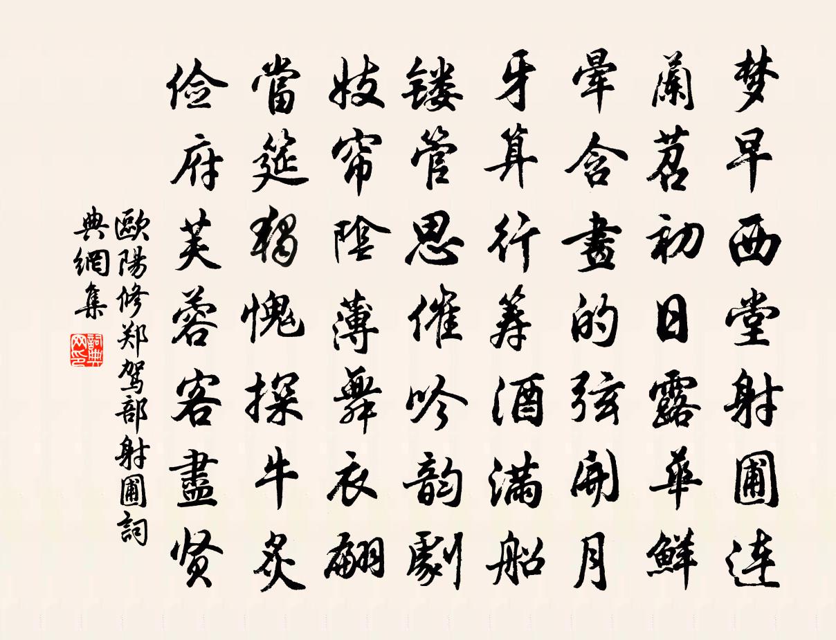 夢早西堂射圃連,蘭苕初日露華鮮。暈含畫的弦開月,牙算行籌酒滿船。