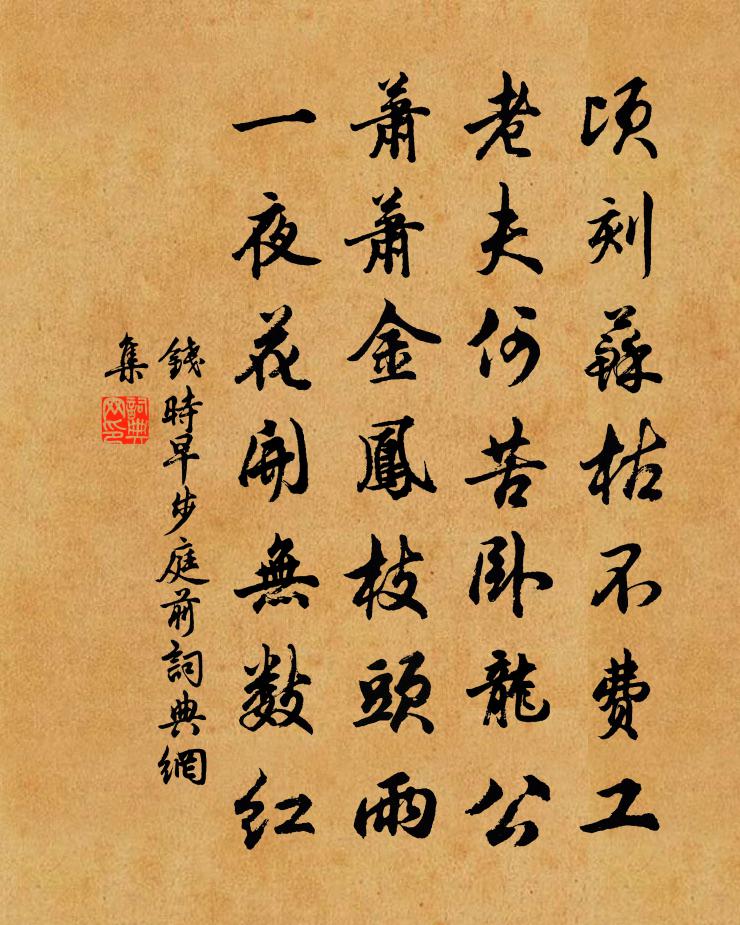 詩詞名句歷史字典書法欣賞書法字典國語詞典說文解字康熙字典古漢語字典標 題 作 者 詩 句 早步庭前作者:錢時 朝代:宋代早步庭前原文頃刻蘇枯不費工,老夫何苦臥龍公。蕭蕭金鳳枝頭雨,一夜花開無數紅。詩詞問答問:早步庭前的作者是誰?答:錢時問:早步庭前寫於哪個朝代?答:宋代錢時早步庭前書法欣賞早步庭前書法作品詩詞推薦秋日題汝陽潭壁劉希夷〔唐代〕獨坐秋陰生,悲來從所適。行見汝陽潭,飛蘿蒙水石。懸瓢木葉上,風吹何歷歷。幽人不耐煩,振衣步閒寂。回流送高仲遠赴滁倅樓鑰〔宋代〕高氏在四明,於今為清門。貳卿道素高,夫人德尤尊。子弟盡恂恂,夫君更春溫。昔年奉慈親,定省嚴晨昏。今日寒塘曲張籍〔唐代〕寒塘沉沉柳葉疏,水暗人語驚棲鳧。舟中少年醉不起,持燭照水射游魚。寄題杜拾遺錦江野亭嚴武〔唐代〕漫向江頭把釣竿,懶眠沙草愛風湍。莫倚善題鸚鵡賦,何須不著鵕鸃冠。腹中書籍幽時曬,肘後醫方靜處看。興發自嘲陸游〔宋代〕儒生窮事業,老去轉荒唐。長日中分睡,殘年有底忙?書常嬾終卷,詩亦少成章。忽棄蓬窗去,花前又一觴。三十二弟寺丞歸宣城因寄太守孫學士梅堯臣〔宋代〕謝公下車日,郡內一登望。昭亭山蒼蒼,寒溪水瀁瀁。句清宛微渾,三洲分細浪。小艇下灘來,群鷗舞潭上。借問贈莊賢良招隱樓三首項安世〔宋代〕樓居入闤闠,不受闠中塵。闠中豈無數,無此招隱人。昔者小山篇,非我招隱意。吾今已隱矣,更欲招同志。同志十一月二日與陸明府陳廣文黃使君吳都曹江廣喻良能〔宋代〕菊色猶黃處,梅花未發天。三山千里客,一笑六同年。公等多朱紱,予方乏坐氈。清談仍痛飲,應作畫圖傳。晚菊史鑄〔宋代〕青蕊重陽不堪摘,重陽已過菊方開。不將時節較早晚,且折霜蕤浸玉醅。又次韻帥初諸前七首陳著〔宋代〕荷衣蕭颯甘謀拙,氈笠崢嶸任命通。只為愛山忙入剡,不因思膾始歸東。送郭進之白玉蟾〔宋代〕避暑白雲鄉,茶甘齒頰香。海城悲暮角,煙樹淡斜陽。和花翁自詠杜范〔宋代〕愚拙天真未易全,如翁自許豈其然。剩將詩句酬花債,只把春衣辦酒錢。僅六尺床皆樂地,方千里旱自豐年。瞿曇阮郎歸歐陽修〔宋代〕劉郎何日是來時。無心雲勝伊。行雲猶解傍山飛。郎行去不歸。強勻畫,又芳菲。春深輕薄衣。桃花無語伴相思。和方簽判詩乞芭蕉於教官王洋〔宋代〕緗帙文書展,青衿懷抱空。花前添翠幕,句後卷詩筒。雲重能障暑,身輕不礙風。相期三伏日,藉此作寒聳。九月晦齋宿太一宮都監姚高士示劉長翁及沁仲程公許〔宋代〕孤雲縱跡混風塵,藹藹陽和滿一襟。招得鴛班同勝賞,肯教牛鐸嗣清音。庵當黛面雪霜峭,洞瑣玉台煙雨深。何日春盡偶書喻良能〔宋代〕溪流如帶碧縈紆,滿地閒花雜野蔬。濃淡柘陰三月暮,淺深山色晚晴初。頗驚井落家徒壁,卻喜盤餐食有魚。蜀魄家園即事十三首鄭清之〔宋代〕侏儒飽愧東方朔,嫗母呼回郭舍人。博局由來更勝負,雉盧那復較疏親。梅花釋擇璘〔宋代〕花老香微春始來,禁寒唯有雪相陪。無情誰為添愁怯,雨後風前亦可哀。鸕鶿諺佚名〔唐代〕鸕鶿不打腳下塘。次韻酬余彥翔陳舜俞〔宋代〕我慚希世就窮儒,甚矣謀身子更迂。不共梟狐倚城社,合隨魚鳥樂江湖。古來只有風猷重,事去情知氣味殊。髀肉名句推薦和平處事,勿矯俗為高;正直居心,勿設機以為智。王永彬《圍爐夜話·第六五則》 秋風夜渡河,吹卻雁門桑。王昌齡《塞下曲·秋風夜渡河》 貧者士之常也,死者人之終也,處常得終,當何憂哉?列子及其弟子《列子·天瑞》 當時輕別意中人,山長水遠知何處。晏殊《踏莎行·碧海無波》 天闕象緯逼,雲臥衣裳冷杜甫《游龍門奉先寺》 井灶有遺處,桑竹殘朽株。陶淵明《歸園田居·其四》 歲不寒無以知松柏,事不難無以知君子荀子《荀子·大略》 善惡同,則功臣倦。黃石公《三略·上略》 巧笑東鄰女伴,採桑徑里逢迎。晏殊《破陣子·春景》 同心一人去,坐覺長安空。白居易《別元九後詠所懷》