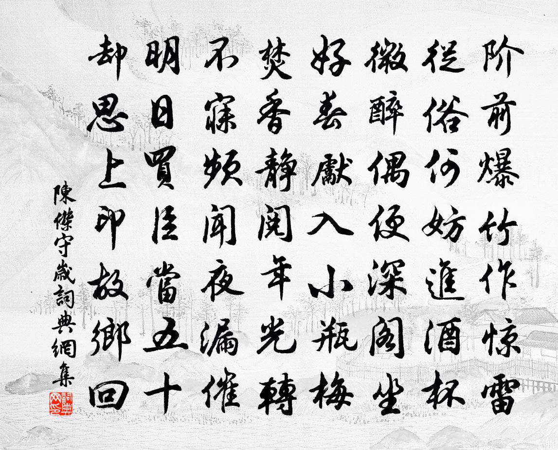 詩詞名句歷史字典書法欣賞書法字典國語詞典說文解字康熙字典古漢語字典標 題 作 者 詩 句 守歲作者:陳杰 朝代:宋代守歲原文階前爆竹作驚雷,從俗何妨進酒杯。微醉偶便深閣坐,好春先入小瓶梅。焚香靜閱年光轉,不寐頻聞夜漏催。明日買臣當五十,卻思上印故鄉回。詩詞問答問:守歲的作者是誰?答:陳杰問:守歲寫於哪個朝代?答:宋代陳杰守歲書法欣賞守歲書法作品詩詞推薦甲申歲解官歸故居有以書相問者周弼〔宋代〕近憑筇竹杖,歲歲作生涯。獨採傍溪藥,自看臨水花。愛雲因此望,對日任西斜。惟有雙蝴蝶,相隨直到家。范園避暑趙汝鐩〔宋代〕六月暑如炊,追涼此地宜。棹舟荷柄颭,坐石竹陰移。籌貫壺雙耳,鼎烹茶一旗。小童供筆硯,醉客競賡詩。賦得遊人久不歸(一作劉孝孫詩,又作賀朝清)賀朝〔唐代〕鄉關眇天末,引領悵懷歸。羈旅久淫滯,物色屢芳菲。稍覺出意盡,行看蓬鬢稀。如何千里外,佇立沾裳衣。喜雪朱翌〔宋代〕今年吉利好人逢,萬玉妃來各馭風。客從暖浮茶乳白,夜堂春動燭花紅。心存帝所元非夢,化出天城不用工。卻怪齊宮詞李商隱〔唐代〕永壽兵來夜不扃,金蓮無複印中庭。梁台歌管三更罷,猶自風搖九子鈴。宿白馬寺張繼〔唐代〕白馬馱經事已空,斷碑殘剎見遺蹤。蕭蕭茅屋秋風起,一夜雨聲羈思濃。贈蘭若僧於鵠〔唐代〕一身禪誦苦,灑掃古花宮。靜室門常閉,深蘿月不通。懸燈喬木上,鳴磬亂幡中。附入高僧傳,長稱二遠公。寄吳晞遠祖秀實〔宋代〕官路聲名二十年,江鄉舊仰貳車賢。推將事業歸塵外,收得功夫到酒邊。解榻幾聞招隱士,炷香終日對韋編。公朝送歐陽袞歸閩中項斯〔唐代〕秦城幾年住,猶著故鄉衣。失意時相識,成名後獨歸。海秋蠻樹黑,嶺夜瘴禽飛。為學心難滿,知君更掩扉。題亦好亭集句喻良能〔宋代〕從士力難任,何其掛懷抱。不及在家貧,在家貧亦好。冷泉林洪〔宋代〕一泓清可沁詩脾,冷暖年來只自知。流出西湖載歌舞,回頭不是在山時。清心院雙清軒黃庭堅〔宋代〕萬劫千峰繞座隅,一泓澄澈見游魚。誰家欄檻煙雲里,坐我瀟湘水墨圖。人物度橋疑海市,樓台拍水信蓬壼。潺湲卜居宋祁〔宋代〕自樂顏居陋,非論晏市囂。西山宜託疾,東路便歸樵。穴邃狐情樂,巢完鳥意遙。居然深隱去,寧待左生招。感事十詩上李侍郎陳造〔宋代〕枉尋固已污,索價則已欺。人生功名念,舒捲自一詩。榮辱取所適,窮達非敢知。及物儻在道,卑官亦可為。咄咄感古十首胡仲弓〔宋代〕四皓隱商山,子陵隱嚴瀨。隱身非隱名,清致一何在。羽翼若為成,狂奴滋故態。一出竟奚為,名被世人賣。所以浣溪沙李清照〔宋代〕髻子傷春慵更梳,晚風庭院落梅初,淡雲來往月疏疏,玉鴨薰爐閒瑞腦,朱櫻斗帳掩流蘇,通犀還解辟寒無。題宣州後堂壁四首張耒〔宋代〕我欲留春情不淺,青春別我苦無情。敬亭山下紅千樹,日日南風綠滿城。約客木犀下有賦魏了翁〔宋代〕茂樹幽花兀老蒼,不隨眾卉入詞場。虎頭點點開金粟,犀首累累佩印章。明月上時疑白傅,清風度處越黃金。人才和楊季恪景疏希白二首吳芾〔宋代〕二疏高躅聳簪紳,寂寞無人繼後塵。一代風流雖已遠,千年我德鎮如新。幸拋印綬歸空谷,得與湖山作好春。若較送陳天予大監同年使閩范成大〔宋代〕春關十載記英游,蚤喜時才近采旒。夷路著鞭方逸駕,急流回首忽扁舟。雲霄正穩君猶去,塵土無邊我合休。問訊名句推薦勸君終日酩酊醉,酒不到劉伶墳上土。李賀《將進酒》 君子之言寡而實,小人之言多而虛。劉向《說苑·談叢》 水激則悍,矢激則遠劉向《說苑·談叢》 美女渭橋東,春還事蠶作。李白《陌上桑》 花開不並百花叢,獨立疏籬趣未窮。鄭思肖《畫菊》 有個嬌嬈如玉,夜夜繡屏孤宿,閒抱琵琶尋舊曲,遠山眉黛綠。韋莊《謁金門·春漏促》 羅幕輕寒,燕子雙飛去。晏殊《蝶戀花·檻菊愁煙蘭泣露》 山河破碎風飄絮,身世浮沉雨打萍。文天祥《過零丁洋》 一春略無十日晴,處處浮雲將雨行。汪藻《春日·一春略無十日晴》 海燕歲微渺,乘春亦暫來。張九齡《歸燕詩》