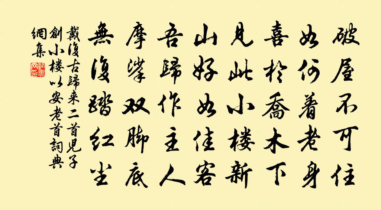 詩詞名句歷史字典書法欣賞書法字典國語詞典說文解字康熙字典古漢語字典標 題 作 者 詩 句 歸來二首兒子創小樓以安老首作者:戴復古 朝代:宋代原文破屋不可住,如何著老身。喜於喬木下,見此小樓新。山好如佳客,吾歸作主人。摩挲雙腳底,無復踏紅塵。詩詞問答問:《歸來二首兒子創小樓以安老首》的作者是誰?答:戴復古問:該詩寫於哪個朝代?答:宋代問:戴復古的名句有哪些?答:戴復古名句大全書法欣賞歸來二首兒子創小樓以安老首書法作品詩詞推薦呈季承趙蕃〔宋代〕發舒言笑非關酒,慰藉辛勤一以詩。往日追從雖舊矣,只今夷險更同之。真仙岩壑君行訪,快閣江山我亦披。但恐次人韻思弟姜特立〔宋代〕二陸雙飛共一班,士龍何事別長安。故園花鳥應無恙,勝日樽罍且自寬。春草夢回詩思好,暮荊風急客衣寒。苕溪別袁州司戶司馬行二首彭龜年〔宋代〕四海司馬氏,大州從事賢。剸裁無劇務,抑鬱已三年。人在甘棠里,夢回春草邊。知音有當路,何日踐英躔。橫舟弟相別年餘阻一江之水彼此皆病未有可會曹彥約〔宋代〕阻飢傳播骨先寒,愁把台評子細看。賴有重霉三日雨,向來枯涸已瀰漫。白露前一日已如深秋有感陸游〔宋代〕護塞寧須右北平,拂雲祠是受降城。誰知此志成虛語,白首燈前聽雁聲!過洛社望南湖暮景三首楊萬里〔宋代〕暮煙如雨雨如煙,一把珠簾隔遠山。簾影漸濃山漸淡,恍然移入畫屏間。破虜凱歌六首周麟之〔宋代〕捷書日日到甘泉,使者聯翩出勞旋。將士歡呼拜君賜,鵰銜寶帶鵠袍鮮。偈頌一百零二首釋紹曇〔宋代〕川僧素無頭號腦,步上學引人入草。忽驚野鴨群飛,便把鼻頭擔扭。哭不成哭,笑不成笑。只因家富小兒嬌,七世上元田太靖〔宋代〕元宵燈火照樓台,車馬駢駢去又來。田郎試向樓上望,燈前好個阿孩孩。自烏石渡湘思去歲與朱元晦林擇之偕行講論之張栻〔宋代〕朝來一舸渡湘水,山色橫秋真可憐。忽憶去年聯騎客,沙邊搔首意茫然。偈頌九十三首釋梵琮〔宋代〕白雲無定,明月有期。欲出未出,似歸不歸。秋山呈錦繡,紅葉滿林飛。瞥不瞥,知不知。鏡里無塵閒處照,柴頭留別樂和之梅堯臣〔宋代〕雪消潭水綠,輕舸下灘時。漸轉青山去,還將故國辭。野林看欲動,江燕欲逢遲。君語隨州體,余慚晚始知。玉爐三澗雪 勤勞丘處機〔元代〕物外雖明端的,天心未放玲瓏。區區陌上走西東。也學浮生作夢。夢寐更勞數載,岩龕復度三冬。待佗訊息顯真功謁金門翁元龍〔宋代〕鶯樹暖。弱絮欲成芳繭。流水惜花流不遠。小橋紅欲滿。原上草迷離苑。金勒晚風嘶斷。等得日長春又短。愁深山送嚴大夫赴桂州王建〔唐代〕嶺頭分界候,一半屬湘潭。水驛門旗出,山戀洞主參。辟邪犀角重,解酒荔枝甘。莫嘆京華遠,安南更有南。永遇樂 夢中有以王正之樂府相示者。予但記元好問〔金代〕中有利名千丈。先待明朝有酒如川,自歌自放。然正之未嘗有此作也,明日以示友人希顏欽叔,謂可作永遇樂補成胡元之提刑寺丞迂塗相過寵示二詩次韻為謝兼周必大〔宋代〕外計初馳傳,元戎久奏功。為牛非北海,雞犬是新豐。梅萼三冬綠,榴花四季紅。德星臨越分,桂海即吳中。鴛湖曲吳偉業〔清代〕駕鴦湖畔草粘天,二月春深好放船。柳葉亂飄千尺雨,桃花斜帶一路煙。煙雨迷離不知處,舊堤卻認門前樹。樹上子上持豫章畫扇,其上牡丹三株,黃白相間盛楊萬里〔宋代〕暄風暖景政春遲,開盡好花人未知。輪與狸奴得春色,牡丹香里弄雙兒。石榴蘇軾〔宋代〕風流意不盡,獨自送殘芳。色作裙腰染,名隨酒盞狂。名句推薦千點寒梅曉角中,一番春信畫樓東。楊慎《鷓鴣天·元宵後獨酌》 雪洗虜塵靜,風約楚雲留張孝祥《水調歌頭·和龐佑父》 故人書報,莫因循、忘卻蓴鱸。辛棄疾《漢宮春·會稽秋風亭觀雨》 無我原非你,從他不解伊。曹雪芹《紅樓夢·第二十二回》 輕陰池館水平橋,一番弄雨花梢。陳子龍《畫堂春·雨中杏花》 暗室虧心,神目如電。徐田臣《戲文·殺狗記》 松雪飄寒,嶺雲吹凍,紅破數椒春淺。周密《獻仙音·吊雪香亭梅》 王濬樓船下益州,金陵王氣黯然收。劉禹錫《西塞山懷古》 元嘉草草,封狼居胥,贏得倉皇北顧。辛棄疾《永遇樂·京口北固亭懷古》 明月何皎皎,照我羅床幃。佚名《明月何皎皎》