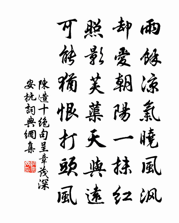 詩詞名句歷史字典書法欣賞書法字典國語詞典說文解字康熙字典古漢語字典標 題 作 者 詩 句 十絕句呈章茂深安撫作者:陳造 朝代:宋代十絕句呈章茂深安撫原文雨餘涼氣曉風渢,卻愛朝陽一抹紅。照影芙蕖天與遠,可能猶恨打頭風。詩詞問答問:十絕句呈章茂深安撫的作者是誰?答:陳造問:十絕句呈章茂深安撫寫於哪個朝代?答:宋代陳造十絕句呈章茂深安撫書法欣賞十絕句呈章茂深安撫書法作品詩詞推薦不肖吟邵雍〔宋代〕不肖之人,志在遊蕩。身在屋下,心在屋上。不肖之子,志在浮誇。身尚不保,焉能保家。句韓常侍〔唐代〕情多不似家山水,夜夜聲聲旁枕流。思高人張椿齡〔宋代〕仙人昔是瑤池客,佩玉鳴鑾生羽翮。騎鯨千載說白雲,弱水三萬那可隔。蓬瀛深處乃其家,無限真仙衣絳霞。相呼過高郵寄孫君孚蘇軾〔宋代〕過淮風氣清,一洗塵埃容。水木漸幽茂,菰蒲雜游龍。可憐夜合花,青枝散紅茸。美人游不歸,一笑當誰供。故園露韓琮〔唐代〕長隨聖澤墮堯天,濯遍幽蘭葉葉鮮。才喜輕塵銷陌上,已愁新月到階前。文騰要地成非久,珠綴秋荷偶得圓。幾處和禱富沙趙希逢〔宋代〕也知銅玉寧無璞,自是蒙金合以沙。挽首何辜聯盜械,脫身無路覓仙槎。懷珍空自經三獻,受用何嘗得五車。事業贈吏部尚書建安郡正肅吳公輓辭三首蘇頌〔宋代〕疇昔商楹夢,吁嗟魯鳳衰。清朝橈隆棟,多士失元龜。墳闕開京壤,帷旌出洛師。孤生懷舊感,西望涕交頤。歸自寸金堤繞城南轉至望涉樓下柳陰扶路草色項安世〔宋代〕十里河堤接郡城,城邊楊柳密於屏。行人盡日翠陰里,啼鳥數聲殘酒醒。七澤觀前無限草,高沙湖外一時青。斜陽法惠寺橫翠閣蘇軾〔宋代〕朝見吳山橫,暮見吳山縱。吳山故多態,轉側為君容。幽人起朱閣,空洞更無物。惟有千步岡,東西作簾額。春來句蔡雍〔宋代〕滿前青嶂千屏列,直下澄江一帶橫。女筵樂語姚勉〔宋代〕瑤姬來自狀元家,真是姚黃第一花。玳席艷開春富貴,魚軒榮駐遠光華。梅梢欲動朱檐雪,竹葉微潮玉臉霞。正好次韻汪庭芝投贈方回〔宋代〕魚龍仙派古來聞,南渡樞臣七世孫。幸不幸間身且隱,玄之玄處道常尊。惜閒剩讀真書傳,入靜時思舊戶門。送往西江月佚名〔宋代〕花下春光正好,柳邊春色才多。雨聲日夜長滄波。暗地芳心滴破。拍拍浪飛白雪,冥冥山點青螺。汀蘭岸芷有情麽即事張鎡〔宋代〕旋買花栽得野香,浴蘭天氣日偏長。槐龍或躍無人見,淨掃風塵置竹床。南谿書齋於鵠〔唐代〕茅屋往來久,山深不置門。草生垂井口,花落擁籬根。入院將雛鳥,尋蘿抱子猿。曾逢異人說,風景似桃源。聲聲慢(和韓竹閒韻,贈歌者關關,在兩水居)張炎〔宋代〕鬟絲濕霧,扇錦翻桃,尊前乍識歐蘇。賦筆吟箋,光動萬顆驪珠。英英歲華未老,怨歌長、空擊銅壺。細看取,有邵伯溫聞見錄載范忠宣帥慶陽時總管種詁無訟岳珂〔宋代〕君不見孫融昔日見李膺,百世尚以通家稱。又不見孔融後來薦鴻豫,卵翼方成比行路。北海平生開酒尊,未應賓客次韻回山人贈沈東老二首陳師道〔宋代〕一杯領意不須沽,六字持身已有餘。痴子未知天上樂,先生今解世間書。黑潭龍-疾貪吏也白居易〔唐代〕黑潭水深黑如墨,傳有神龍人不識。潭上駕屋官立祠,龍不能神人神之。豐凶水旱與疾疫,鄉里皆言龍所為。家家松門歐陽修〔宋代〕島嶼松門數里長,懸崖對起碧峰雙。可憐勝境當窮塞,翻使留人戀此邦。亂石驚灘喧醉枕,淺沙明月入船窗。因游名句推薦金風細細。葉葉梧桐墜。晏殊《清平樂·金風細細》 人無千日好,花無百日紅。馮夢龍《醒世恆言·卷一》 河海不擇細流,故能就其深;李斯《諫逐客書》 寥落古行宮,宮花寂寞紅。元稹《行宮》 守身不敢妄為,恐貽羞於父母王永彬《圍爐夜話·第三四則》 江豚吹浪立,沙鳥得魚閒。薛時雨《臨江仙·大風雨過馬當山》 台榭空濛煙柳暗,白鳥銜魚欲舞。納蘭性德《摸魚兒·午日雨眺》 寢興目存形,遺音猶在耳。潘安《悼亡詩三首》 感時花濺淚,恨別鳥驚心。杜甫《春望》 妙極生知,睿哲惟宰。精理為文,秀氣成采。劉勰《文心雕龍·徵聖》