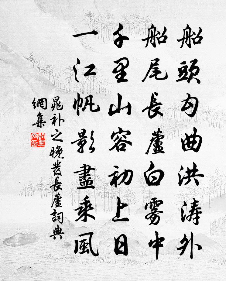 船頭勾曲洪濤外,船尾長蘆白霧中。千里山容初上日,一江帆影盡乘風。