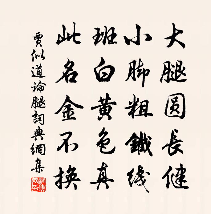 詩詞名句歷史字典書法欣賞書法字典國語詞典說文解字康熙字典古漢語字典標 題 作 者 詩 句 論腿作者:賈似道 朝代:宋代論腿原文大腿圓長健,小腳粗鐵線。班白黃色真,此名金不換。詩詞問答問:論腿的作者是誰?答:賈似道問:論腿寫於哪個朝代?答:宋代賈似道論腿書法欣賞論腿書法作品詩詞推薦早梅王炎〔宋代〕似無還有暗香來,知是春風到早梅。一歲一番花似玉,老人見得幾番開。雪後觀潩水韓維〔宋代〕微陽動泉脈,遠水來渙渙。斜日著底明,輕冰隨處斷。清函竹陰碎,綠與波紋亂。安得解扁舟,窮源事幽觀。東風朱元璋〔明代〕我愛東風從東來,花心與我一般開。花成子結因花盛,春滿乾坤始鳳台。寄淵仲深釋行海〔宋代〕一樹梅花獨對門,雪風吹雁沒寒雲。夢魂昨夜東南去,行盡江山不見君。和清江韓伯善王義山〔宋代〕文章於道未為尊,求道須教造大醇。理學一門要精密,時文大病在尖新。高談天下經綸易,誰療目前饑饉因。拚卻次韻季申樞宇萬象亭李彌遜〔宋代〕丈人手筆與仟通,點化虛無若轉蓬。妙寄七言千嶂外,全收萬象一檐中。深堂細篆觀澄水,落日危欄數去鴻。更壓恩賜魏文貞公諸孫舊第以導直臣陳彥博〔唐代〕阿衡隨逝水,池館主他人。天意能酬德,雲孫喜庇身。生前由直道,歿後振芳塵。雨露新恩日,芝蘭舊里春。勛庸次韻奉和蔡樞密南京種山藥法王安石〔宋代〕區種拋來六七年,春風條蔓想宛延。難追老圃莓苔徑,空對珍盤玳瑁筵。嘉種勿傳河右壤,靈苗更長闕西偏。故畦再用韻酬退庵侍郎方岳〔宋代〕飛蓋重臨霜葉老,江山吞暗吐煙帶。詩情不論隔千里,酒令何妨寬一分。到處經行多舊感,等閒談笑亦奇芬。平生九月二十日游桃源寺王洋〔宋代〕東溪繚繞黃花國,西崦縱橫白酒家。誰道桃源解迷路,與君平步到煙霞。送齊進士奉章闕下宋庠〔宋代〕傾坐仙姿掩石麟,奉章車府應觀賓。謝庭早占芝蘭族,禹會初陪玉帛臣。削牘西清催筆距,賜衣中禁換袍銀。東歸江南弄 龍笛曲蕭衍〔南北朝〕美人綿眇在雲堂。雕金鏤竹眠玉床。婉愛寥亮繞紅梁。繞紅梁。流月台。駐狂風。郁徘徊。登寺後峰絕頂喻良能〔宋代〕杳杳扶筇上翠岑,松風蕭颯五雲深。不知直自登臨處,下至平川幾百尋。聞王慥常侍卒三首貫休〔唐代〕世亂君巡狩,清賢又告亡。星辰皆有角,日月略無光。金柱連天折,瑤階被賊荒。令人轉惆悵,無路問蒼蒼。宗社五星謝枋得〔宋代〕五緯煌煌聚在秦,項王稱霸沛公臣。誰知四百年天下,已屬寬仁大度人。秋曉張耒〔宋代〕老人不睡秋夜長,五更鼓角鳴東堂。悲蛩床下欲無語,黃葉瓦清新有霜。雁聲相應江南北,北杓欲下天中央。老人十一月十三日病後始入倉梅堯臣〔宋代〕曾非雀與鼠,何彼大食為。狐裘破不溫,黃狗補其皮。霜花逐落月,綴在枯槁枝。予年過五十,瘦寢冰生肌。再和前韻答賦五首魏了翁〔宋代〕甫田之田驕驕莠,大國之郊濯濯山。養且難成摧則折,寧居材與不材間。馬上作白居易〔唐代〕處世非不遇,榮身頗有餘。勛為上柱國,爵乃朝大夫。自問有何才?兩入承明廬。又問有何政?再駕朱輪車。矧予書事趙蕃〔宋代〕我行一何忙,羽檄來星奔。忙行抑何事,列境備戍屯。賊犯連英郴,江右聲已宣。往年縛李金,此邦蓋晏然。而今名句推薦林斷山明竹隱牆。亂蟬衰草小池塘。蘇軾《鷓鴣天·林斷山明竹隱牆》 談歡則字與笑並,論戚則聲共泣偕劉勰《文心雕龍·誇飾》 敵者,利害相衝,死生弗容;未察之無以辨友,非制之無以成業。來俊臣《羅織經·制敵卷第五》 虜騎聞之應膽懾,料知短兵不敢接,車師西門佇獻捷。岑參《走馬川行奉送出師西征 / 走馬川行奉送封大夫出師西征》 醲肥辛甘非真味,真味只是淡無味洪應明《菜根譚·概論》 京國多年情盡改,忽聽春雨憶江南。虞集《聽雨》 明歲秋風知再會,暫時分手莫相思。曹雪芹《殘菊》 零落江南不自由。兩綢繆。料得吟鸞夜夜愁。姜夔《憶王孫·番陽彭氏小樓作》 怒髮衝冠,憑欄處、瀟瀟雨歇。岳飛《滿江紅·寫懷》 單于北望拂雲堆,殺馬登壇祭幾回。王之渙《涼州詞二首》