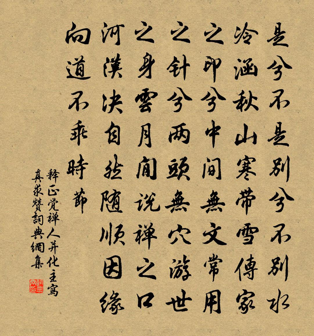 詩詞名句歷史字典書法欣賞書法字典國語詞典說文解字康熙字典古漢語字典標 題 作 者 詩 句 禪人並化主寫真求贊作者:釋正覺 朝代:宋代禪人並化主寫真求贊原文是兮不是,別兮不別。水冷涵秋,山寒帶雪。傳家之印兮中間無文,常用之針兮兩頭無穴。游世之身雲月閒,說禪之口河漢決。自然隨順因緣,向道不乖時節。詩詞問答問:禪人並化主寫真求贊的作者是誰?答:釋正覺問:禪人並化主寫真求贊寫於哪個朝代?答:宋代釋正覺禪人並化主寫真求贊書法欣賞禪人並化主寫真求贊書法作品詩詞推薦武后明堂樂章。徵音武則天〔唐代〕赫赫離精御炎陸,滔滔熾景開隆暑。冀延神鑒俯蘭尊,式表虔襟陳桂俎。劉壯輿長官是是堂蘇軾〔宋代〕閒燕言仁義,是非安可無。非非義之屬,是是仁之徒。非非近乎訕,是是近乎諛。當為感麟翁,善惡分錙銖。抑為蕭長公來訪示以諸公詩卷謂與予游從之久不能劉學箕〔宋代〕人生立志各有癖,浹髓淪肌療無術。君不學少年奏賦明光宮,又不能桑 * 粟去作田舍翁。苦心竭慮淡泊音,手攜送絳州盧使君楊巨源〔唐代〕應將清淨結心期,又共陽和到郡時。絳老問年須算字,庾公逢月要題詩。朱欄迢遞因高勝,粉堞清明欲下遲。他日湯孺人輓詞周必大〔宋代〕嘆息閨房秀,霜摧鬢未華。女功丞相念,婦道里人嗟。石窌脂田廢,濤江粉旐斜。西風看花淚,寂寞小窗紗。長安羈旅孟郊〔唐代〕聽樂別離中,聲聲入幽腸。曉淚滴楚瑟,夜魄繞吳鄉。幾回羈旅情,夢覺殘燭光。蝶戀花王安中〔宋代〕曲徑深叢枝裊裊。暈粉揉綿,破蕊烘清曉。十二番開寒最好。此花不惜春歸早。青女飛來紅翠少。特地芳菲,絕艷晚起閒行白居易〔唐代〕皤然一老子,擁裘仍隱几。坐穩夜忘眠,臥安朝不起。起來無可作,閉目時叩齒。靜對銅爐香,暖漱銀瓶水。午齋辨才塔董嗣杲〔宋代〕瀾翻八十一年空,爭訝前身是井龍。心靜已成無上智,學知今復有誰宗。雲生遺塔封慈相,雨濺沖泉雜定鍾。幾字商婦詞十首劉克莊〔宋代〕今夕佳風月,身同影守房。藁砧定何處,皮裹鐵心腸。西墅韓維〔宋代〕城居不為愜,言適西陂岡。雀噪野堂靜,雞鳴春日長。書棚落幽蠹,佛幔掩餘香。釋子廬岩至,清談殊未央。步蟾宮鍾過〔宋代〕東風又送酴醿信。早吹得、愁成潘鬢。花開猶似十年前,人不似、十年前俊。水邊珠翠香成陣。也消得、燕窺鶯認空城雀陳陶〔唐代〕古城濛濛花覆水,昔日住人今住鬼。野雀荒台遺子孫,千年飲啄枯桑根。不隨海燕柏梁去,應無玉環銜報恩。近村減字木蘭花(琴)蘇軾〔宋代〕神閒意定。萬籟收聲天地靜。玉指冰弦。未動宮商意已傳。悲風流水。寫處寥寥千古意。歸去無眠。一夜餘音在耳秋日過子陵釣台釋文珦〔宋代〕不將華袞換羊裘,冷對青山到白頭。說與往來名利客,經過台下莫維舟。題瓮齋白玉蟾〔宋代〕萬軸牙籤聚碧芸,數間茅屋鎖閒雲。鶯吟芍藥一歌女,蟻繞菖蒲萬水軍。香穗橫窗盤瘦影,茗花浮枕斗清芬。琴心賦得浦口望斜月,送皇甫判官錢起〔唐代〕起見西樓月,依依向浦斜。動搖生淺浪,明滅照寒沙。水渚猶疑雪,梅林不辨花。送君無可贈,持此代瑤華。春帖子詞皇后閣十首宋祁〔宋代〕曉天春氣淨融融,飛入天關第九重。靈沼水生初報雁,蓬萊雲暖即從龍。酬揚州白塔寺永上人顧況〔唐代〕塔上是何緣,香燈續細煙。松枝當麈尾,柳絮替蠶綿。浮草經行遍,空花義趣圓。我來雖為法,暫借一床眠。綠槐陰唐士恥〔宋代〕槐陰似尼父,軼軌追前蹤。絕塵非學步,所產夐無雙。今此于越東,鍾孕亦鴻龐。朅來於越西,掌教開群迷。群迷名句推薦千淘萬漉雖辛苦,吹盡狂沙始到金。劉禹錫《浪淘沙九首》 天階夜色涼如水,臥看牽牛織女星。杜牧《秋夕》 老圃好栽培,菊花五月開。顧太清《菩薩蠻·端午日詠盆中菊》 下謀上以術,術有窮者以力。來俊臣《羅織經·謀劃卷第九》 予若洞庭葉,隨波送逐臣。李白《送郄昂謫巴中》 刑過不辟大臣,賞善不遺匹夫。韓非及後人《韓非子·有度》 青出於藍而勝於藍程登吉《幼學瓊林·卷二·師生》 有生之樂,無死之心劉向《戰國策·齊六·田單將攻狄》 素娥無賴,西去曾不為人留。蘇轍《水調歌頭·徐州中秋》 明歲秋風知再會,暫時分手莫相思。曹雪芹《殘菊》