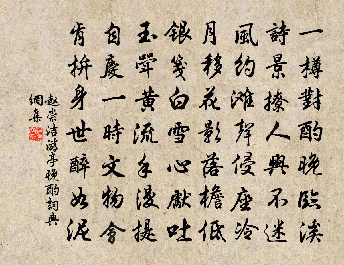 詩詞名句歷史字典書法欣賞書法字典國語詞典說文解字康熙字典古漢語字典標 題 作 者 詩 句 游亭晚酌作者:趙崇潔 朝代:宋代游亭晚酌原文一樽對酌晚臨溪,詩景撩人興不迷。風約灘聲侵座冷,月移花影落檐低。銀箋白雪心先吐,玉斝黃流手漫提。自慶一時文物會,肯拚身世醉如泥。詩詞問答問:游亭晚酌的作者是誰?答:趙崇潔問:游亭晚酌寫於哪個朝代?答:宋代趙崇潔游亭晚酌書法欣賞游亭晚酌書法作品詩詞推薦行宮詞王建〔唐代〕上陽宮到蓬萊殿,行宮岩岩遙相見。向前天子行幸多,馬蹄車轍山川遍。當時州縣每年修,皆留內人看玉案。禁兵下水府崔敦禮〔宋代〕鐘山崒兮江之湄,藥為祀辛夷祠。神乘白馬兮執素羽,朝與日出兮莫雲歸。噫嗟兮明神,烈烈兮用光。生科疾盜兮和錢華州題少華清光絕句白居易〔唐代〕高情雅韻三峰守,主領清光管白雲。自笑亦曾為刺史,蘇州肥膩不如君。西江月佚名〔宋代〕花下春光正好,柳邊春色才多。雨聲日夜長滄波。暗地芳心滴破。拍拍浪飛白雪,冥冥山點青螺。汀蘭岸芷有情麽念奴嬌楊炎正〔宋代〕漢天雲靜,望一星飛過,湘南湘北。當是郴山猿鶴夢,喚起日邊訊息。羽扇綸巾,浩然乘興,此意無人識。扁舟千懷妙老吳則禮〔宋代〕屋頭風雨交,喚此耋老夢。粥魚腹遽鳴,來作枕中供。底處有可人,齋缽是日用。時時要同盤,穿雪菜甲動。糖多令 中秋朱唏顏〔元代〕涼影下青鸞。晴空瀉素盤。漾玉壺、千頃多寬。老桂散香風露淨,霜免瑩,骨毛寒。老子倚闌乾。不辭終夜看。有玉堂北欄叢竹宋祁〔宋代〕玉署凝嚴處,朱欄封殖恩。其誰賞高節,祗自保孤根。密幹青槓矗,危梢翠纛翻。故林茲地隔,新實幾時繁。細籟題金禹瑞畫松圖王冕〔元代〕畢宏韋偃遠莫追,畫松得名今是誰?黃岩太守夸絕倒,休寧縣令爭新奇。蒼髯鐵甲風雷動,浮雲散盡青天空。只因句許翁〔宋代〕亭名燕喜經品題,至今增重湟川地。黃台瓜辭李賢〔唐代〕種瓜黃台下,瓜熟子離離。一摘使瓜好,再摘使瓜稀,三摘尚自可,摘絕抱蔓歸。秀實監承復寄二篇幾商顏不至亦微見及因次韻王洋〔宋代〕東岡準擬太丘來,竹洗塵根石拂苔。好客風廊俱有分,只愁高唱不容陪。句應子和〔宋代〕風過落花紅。戲題常州草蟲枕屏楊萬里〔宋代〕黃蜂作歌紫蝶舞,蜻蜓蚱蜢如風雨。先生晝眠紙帳溫,無那此輩喧夢魂。眼中了了華胥國,蜂催蝶喚到不得。覺來書黃岩丁明仲墓誌碑陰陳傅良〔宋代〕葉君隻字雙南金,予子拳石藏幽深。百名以上辭不淫,我豈識子猶漸襟。黃山之阿墓林林,斷碑日爍秋雨霖。彼豈東歸留題太常徐卿草堂(在蜀)岑參〔唐代〕不謝古名將,吾知徐太常。年才三十餘,勇冠西南方。頃曾策匹馬,獨出持兩槍。虜騎無數來,見君不敢當。漢將題所居黃子稜〔宋代〕青衫木笏尚初官,未老金魚是等閒。世上幾多名將相,門前誰有此溪山。市樓晚日紅高下,客艇春波綠往還。人過上知己馮時行〔宋代〕十年宦海塵埃客,文墨於人有底功。天遠寧知心匪石,官卑不許氣如虹。唐雖未老行將老,衍不應窮究竟窮。何日題李公麟山莊圖其七瓔珞岩蘇轍〔宋代〕泉流逢石缺,脈散成寶網。水作瓔珞看,山是如來想。寄顧次岳五首許月卿〔宋代〕半夜開窗憑闌坐,無心雲起鏡湖心。鋪茵菸草漫天幄,璞玉樓台渾色金。訪古寂寥秋漠漠,懷人感慨碧岑岑。未知名句推薦到家應是,童稚牽衣,笑我華顛。吳激《訴衷情·夜寒茅店不成眠》 林外鳴鳩春雨歇,屋頭初日杏花繁。歐陽修《田家》 小時了了,大未必佳。劉義慶《世說新語·言語》 相知無遠近,萬里尚為鄰。張九齡《送韋城李少府》 謙尊而光,卑而不可逾,君子之終也。佚名《易傳·彖傳上·謙》 聽風聽雨過清明。愁草瘞花銘。吳文英《風入松·聽風聽雨過清明》 休別有魚處,莫戀淺灘頭。佚名《增廣賢文·上集》 名無固實,約之以命實,約定俗成,謂之實名。荀子《荀子·正名》 人生自古誰無死?留取丹心照汗青。文天祥《過零丁洋》 庭花蒙蒙水泠泠,小兒啼索樹上鶯。貫休《春晚書山家屋壁二首》