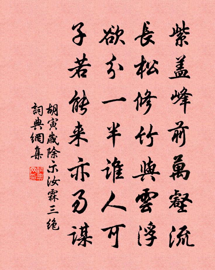 詩詞名句歷史字典書法欣賞書法字典國語詞典說文解字康熙字典古漢語字典標 題 作 者 詩 句 歲除示汝霖三絕作者:胡寅 朝代:宋代歲除示汝霖三絕原文紫蓋峰前萬壑流,長松修竹與雲浮。欲分一半誰人可,子若能來亦易謀。詩詞問答問:歲除示汝霖三絕的作者是誰?答:胡寅問:歲除示汝霖三絕寫於哪個朝代?答:宋代胡寅歲除示汝霖三絕書法欣賞歲除示汝霖三絕書法作品詩詞推薦送下博陳員外徐鉉〔唐代〕曠望叢台路,飄颻楚塞人。琴堂無故舊,何計免沾巾。薔薇花陸暢〔唐代〕錦窠花朵燈叢醉,翠葉眉稠裛露垂。莫引美人來架下,恐驚紅片落燕支。秋感蘇泂〔宋代〕朱槿不堪留,牽牛上竹幽。蛩聲清奪漏,鷹翮勁思秋。掩卷悲先哲,看山憶舊遊。閨情兼旅夢,百慮五更頭。雜言二首李流謙〔宋代〕春來無處無芳草,但覺故園春更好。海棠前日夢見之,今日看來渾未老。櫻桃紅杏相因依,梅陰吐芽青滿枝。世間次韻伯田見酬四首方回〔宋代〕半年洄泝越江濱,每愧羊裘老富春。歸隱尚能聯比長,出遊復肯祭行神。枯腸近飽三爻夢,宿齒宜肩四豆人。能顧晚過銀山李新〔宋代〕荒溪屈曲中郎篆,白鷺參差玉筍斑。竿日已移三丈外,水雲猶垛兩山間。石橋梅萼余香冷,茅店人家晚夢閒。幸自宮詞一百首岳珂〔宋代〕駕前校獵起封狐,御箭親彎金僕姑。萬騎嵩呼開電笑,吾皇神武古今無。武林書事九首方回〔宋代〕歲在戊午正月五,代宰臣供萬壽詩。鳳凰山下芙蓉閣,龍礎無蹤世不知。十二時/憶少年范祖禹〔宋代〕轉招搖。厚陵回望,雙闕起岧嶢。曉日麗譙。金爵上乾霄。風雨闋,夜宮閉,不重朝。奉鸞鑣漸遙。玉京知何處,菩薩蠻(冬)鑒堂〔宋代〕浦南回槳歸庭戶。戶庭歸槳回南浦。簾卷欲晴天。天晴欲捲簾。月光交映雪。雪映交光月。殘漏怯宵寒。寒宵怯漏光風霽月觀鸕鶿聚灘下搜獵慈慘已而坐歲寒見錢時〔宋代〕出沒雲根上下浮,蘸蒲清溜十分幽。前灘烏鬼能撩亂,爭似盤魚得自由。奉和聖制答張說扈從南出雀鼠谷梁升卿〔唐代〕何意重關道,千年過聖皇。幽林承睿澤,閒客見清光。日御仙途遠,山靈壽域長。寒雲入晉薄,春樹隔汾香。國佐追和晦庵先生十梅韻艾性夫〔宋代〕微吟水部詩,欲續廣平賦。須是鐵心人,方識花妙處。山居十首陳造〔宋代〕涉世慣多遻,送欣愜此心。雞孫當歲稔,竹母值秋陰。言配香粳軟,行須綠影深。繼今摩腹去,風日更蕭森。感舊白居易〔唐代〕晦叔墳荒草已陳,夢得墓濕土猶新。微之捐館將一紀,杓直歸丘二十春。城中雖有故第宅,庭蕪園廢生荊榛。篋中蝶戀花張炎〔宋代〕秦地瓜分候已故。不學淵明,種秫辭歸去。薄有田園還種取。養成碧玉甘如許。卜隱青門真得趣。蕙帳空閒,鶴怨句宋祁〔宋代〕可但魚知丙,非徒字識丁。臨江仙(勸酒)史浩〔宋代〕自古聖賢皆寂寞,只教飲者留名。萬花叢里酒如澠。池台仍舊貫,歌管有新聲。欲識醉鄉真樂地,全勝方丈蓬瀛。秋懷雍陶〔唐代〕古槐煙薄晚鴉愁,獨向黃昏立御溝。南國望中生遠思,一行新雁去汀洲。偈頌一百零二首釋紹曇〔宋代〕祖翁田地絕邊垠,契券分明孰敢侵。削盡春風閒草木,松濤翻月竹篩金。名句推薦無那塵緣容易絕,燕子依然,軟踏簾鉤說。納蘭性德《蝶戀花·辛苦最憐天上月》 疏籬曲徑田家小。雲樹開清曉。周邦彥《虞美人·疏籬曲徑田家小》 人處疾則貴醫。韓非及後人《韓非子·解老》 蜂兒不解知人苦,燕兒不解說人愁。程垓《最高樓·舊時心事》 樂極生悲,否極泰來。施耐庵《水滸傳·第二十六回》 冰雪襟懷,琉璃世界,夜氣清如許。黃升《酹江月·夜涼》 鳳尾森森,龍吟細細。曹雪芹《紅樓夢·第二十六回》 夫君子之行,靜以修身,儉以養德。諸葛亮《誡子書》 晝短苦夜長,何不秉燭游!佚名《生年不滿百》 仙人琪樹白無色,王母桃花小不香。白居易《牡丹芳》