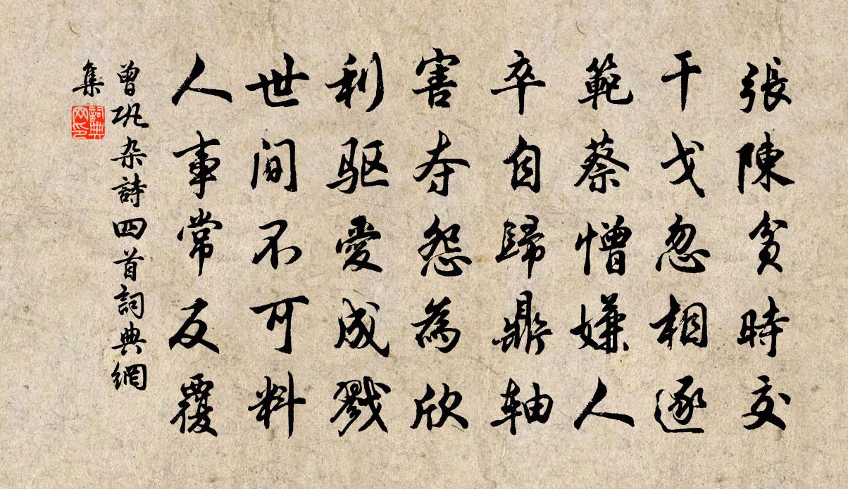 詩詞名句歷史字典書法欣賞書法字典國語詞典說文解字康熙字典古漢語字典標 題 作 者 詩 句 雜詩四首作者:曾鞏 朝代:宋代雜詩四首原文張陳貧時交,干戈忽相逐。范蔡憎嫌人,卒自歸鼎軸。害奪怨為欣,利驅愛成戮。世間不可料,人事常反覆。詩詞問答問:雜詩四首的作者是誰?答:曾鞏問:雜詩四首寫於哪個朝代?答:宋代曾鞏雜詩四首書法欣賞雜詩四首書法作品詩詞推薦上書乞祠陸游〔宋代〕上書又乞奉祠歸,夢到湖邊自叩扉。此去敢辭依馬磨,向來真慣擁牛衣。致身途遠年齡暮,報國心存氣力微。誓墓與零陵周倅子鎔劉克莊〔宋代〕滿目山河異,南冠十六期。胡羝無乳日,遼鶴有歸時。詗虜幾齏粉,還朝不磷緇。漢家重名節,郎秩未為卑。贈會稽道士晏殊〔宋代〕藐姑容化三陰館,句漏砂封六乙泥。五練夜窮青玉枕,七明晨采碧雲梯。冠霞高把浮丘袂,握體深藏鬼谷奚。知有送楊閒侍御拜命赴上都劉商〔唐代〕賀客移星使,絲綸出紫微。手中霜作簡,身上繡為衣。驄馬朝天疾,台烏向日飛。親朋皆避路,不是送人稀。湖西雜感詩釋智圓〔宋代〕福善禍淫言可信,吉凶由己語堪陳。乖仁背義都無恥,只記臨行揀日辰。贈僧宗佑黃彥臣〔宋代〕瀟瀟丰姿迥不同,少年來住此禪叢。誰知今日佑和尚,便是當年鍾令公。夾道岡梅堯臣〔宋代〕舟脫鵝{外疒內貴}淺,兵牽鴈腳齊。兼沙水黃濁,穿壠岸高低。瘦土黃姜石,枯株長樹雞。薄言歸向晚,路入赤靈照女贊釋可湘〔宋代〕拋世業,蹈玄機。阿爺無藉賴,女子更頑皮。情知未若貧而樂,特故沿街賣笊籬。摸魚兒李昴英〔宋代〕繞西園、粉籠千雉,鏡池屏石天造。主人意匠工收拾,華屋落成聞早。輪奐巧。望縹緲、五雲深處移蓬島。油幢羽酬畫上人石湖春望葛天民〔宋代〕蕩蕩春風草木香,茫茫澤國水雲長。鶯來占柳為歌院,蝶去尋花作醉鄉。閒與物情聊品帶,老於文字懶巡行。望中寓言杜牧〔唐代〕暖風遲日柳初含,顧影看身又自慚。何事明朝獨惆悵,杏花時節在江南。缺月梅堯臣〔宋代〕缺月來照屋角時,西家狗吠東家疑。夜深精露鬼初動,窸窣古莽無風吹。周五聲調曲 徵調曲 六庾信〔南北朝〕正陽和氣萬類繁。君王道合天地尊。黎人耕植於義圃。君子翶翔於禮園。落其實者思其樹。飲其流者懷其源。咎繇昭陽殿柴望〔宋代〕禍水流來漢火亡,白頭宮女恨昭陽。至今人見飛來燕,猶為君王暗斷腸。淮西何總卿陳郁〔宋代〕頻年增灶起邊兵,給餉誰先足萬營。凡有求焉皆越從,不言功者尚為卿。朝家豈是無公誶,叔府如何不動情。我為客舍悲秋,有懷兩省舊遊,呈幕中諸公岑參〔唐代〕三度為郎便白頭,一從出守五經秋。莫言聖主長不用,其那蒼生應未休。人間歲月如流水,客舍秋風今又起。不知寄內董蘿〔宋代〕別向春閨十載深,家園無夢可追尋。酸風冷月淒官閣,瘴雨蠻煙度鬱林。養老需卿扶健杖,怕寒憐我守孤衾。封侯乾德以後祀感生帝十首佚名〔宋代〕奉承明祀,惟羊惟牛。印盛於豆,人陳庶羞。鐘鼓喤喤,神具醉止。其入嘉籩,永綏福祉。漁父詞二首鄧深〔宋代〕話計平生一釣船,將魚換酒不論錢。夜來醉倒蓬籠底,卻在蘆花宿雁邊。所居遇雪衛宗武〔宋代〕去年雪於臘,見晛跡已滅。今年天作花,再白遂凝結。鱗鱗甍相接,爛爛銀互疊。平尺雖未盈,皓若布層氎。洪纖名句推薦愛敬盡於事親,而德教加於百姓,刑於四海孔子及其弟子《孝經·天子》 樹繞村莊,水滿陂塘。秦觀《行香子·樹繞村莊》 在天願作比翼鳥,在地願為連理枝。白居易《長恨歌》 嗚呼! 何時眼前突兀見此屋杜甫《茅屋為秋風所破歌》 舉物而暗,無務博聞。墨子《墨子·02章 修身》 不種閒花,池亭畔、幾竿修竹。陸容《滿江紅·詠竹》 北斗酌美酒,勸龍各一觴。李白《短歌行》 一枝紅艷露凝香,雲雨巫山枉斷腸。李白《清平調·其二》 不聞不若聞之,聞之不若見之,見之不若知之,知之不若行之。荀子《荀子·儒效》 人間有味是清歡。蘇軾《浣溪沙·細雨斜風作曉寒》