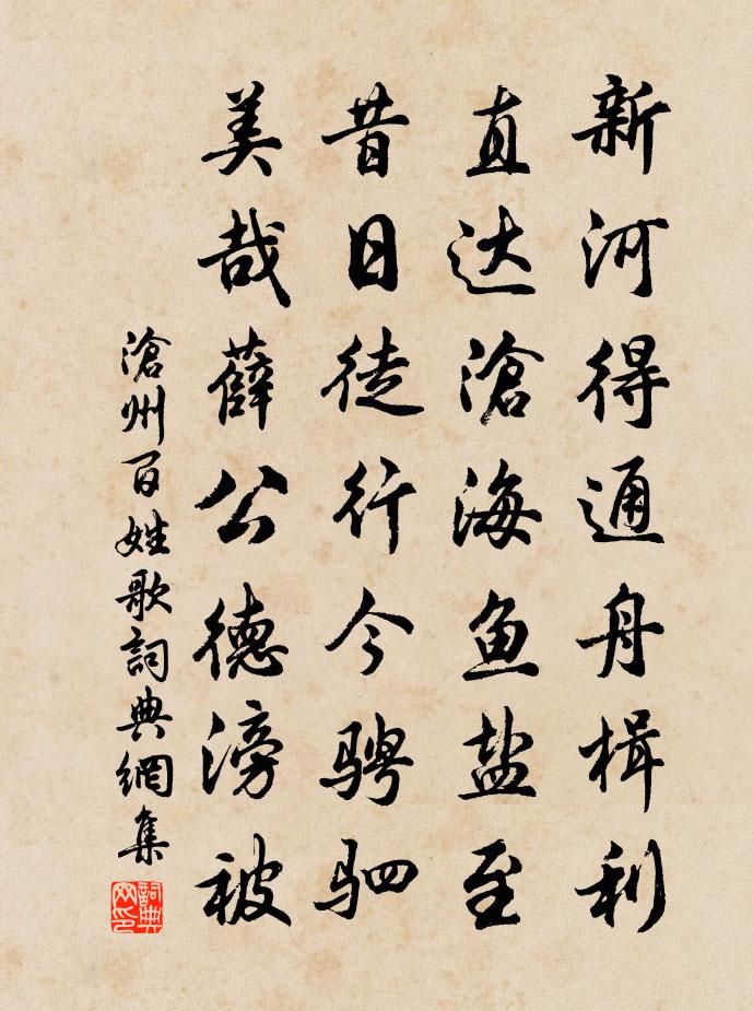 詩詞名句歷史字典書法欣賞書法字典國語詞典說文解字康熙字典古漢語字典標 題 作 者 詩 句 滄州百姓歌作者:佚名 朝代:唐代滄州百姓歌原文新河得通舟楫利,直達滄海魚鹽至。昔日徒行今騁駟,美哉薛公德滂被。詩詞問答問:滄州百姓歌的作者是誰?答:佚名問:滄州百姓歌寫於哪個朝代?答:唐代問:佚名的名句有哪些?答:佚名名句大全佚名滄州百姓歌書法欣賞滄州百姓歌書法作品詩詞推薦題玄潭觀雪浪閣楊萬里〔宋代〕贛江西來千里許,流到閣前虎鬚怒。旌陽橫劍居上頭,卻喝長江教倒流。跳作漩花雪山立,濺得琳房滿山濕。即今魯肅過蒙屯下陳壽〔魏晉〕 魯肅代周瑜,當之陸口,過蒙屯下。肅意尚輕蒙,或說肅曰:“呂將軍功名日顯,不可以故意待之,君宜顧之水調歌頭葛長庚〔宋代〕未遇明師者,日夜苦憂驚。及乎遇了,得些口訣又忘情。可惜蹉跎過了,不念精衰氣竭,碌碌度平生。何不回頭看游鉛山石井李呂〔宋代〕碧玉罅中仙洞府,玻瓈無底涵煙雨。好將潤澤天下施,沾溉寧論數千畝。晚歸山居劉滄〔唐代〕寥落霜空木葉稀,初行郊野思依依。秋深頻憶故鄉事,日暮獨尋荒徑歸。山影暗隨雲水動,鐘聲潛入遠煙微。娟娟清平樂·禁庭春晝李白〔唐代〕禁庭春晝,鶯羽披新繡。百草巧求花下斗,只賭珠璣滿斗。日晚卻理殘妝,御前閒舞霓裳。誰道腰肢窈窕,折旋笑寄題蒲傳正學士清風閣蘇頌〔宋代〕閣倚青山書滿堂,門齊通德里高陽。傳家載世惟清白,教子何人似義方。班嗣一丘雖道卷,劉商七業已名彰。他年弘農公以碩德偉材屈於誣枉左官…謹獻詩五十韻以畢微志柳宗元〔唐代〕知命儒為貴,時中聖所臧。處心齊寵辱,遇物任行藏。關識新安地,封傳臨晉鄉。挺生推豹蔚,遐步仰龍驤。乾有送三兄出宰常山蘇泂〔宋代〕官次淹時久,才華應世須。及瓜逢六月,行李過三衢。迓吏江邊少,齎裝驛外都。潮經漁浦夜,檣泊富陽晡。柳障滕達道輓詞二首蘇軾〔宋代〕先帝知公早,虛懷第一人。至今詩禮將,惟數武宣臣。材大雖難用,時來亦少信。高平風烈在,威敏典刑新。(公早朝馮延巳〔唐代〕銅壺花滴漏初晝花,高閣雞鳴半空。催啟五門金鎖,猶垂三殿花櫳。階前御柳搖綠,仗下宮花散紅。鴛花數行曉日頌十玄談塵異釋印肅〔宋代〕我道驪珠到處晶,包含萬有獨明靈。同光索價遭人問,兩手張開帽帶陳。偈頌二百零五首釋正覺〔宋代〕難難難是遣情難,情盡圓明一顆寒。 * 眼,不相謾。面前不破案山礙,直下無津識浪乾。海棠美人圖唐寅〔明代〕褪盡東風滿面妝,可憐蝶粉與蜂狂。自今意思和誰說,一片春心付海棠。念奴嬌楊炎正〔宋代〕杏花楊柳,對東風染盡、一年春色。彈壓煙光三萬頃,誰識清都仙伯。夜泛銀潢,手移星緯,飛墮從天闕。御風乘送松麓李應龍彝甫攜阿潁鵬升參學姚勉〔宋代〕老龍本自天門出,躍入璧池聊換骨。鵬雛夭矯更不凡,平視南溟渺東渤。玉京道上五年前,曾見鱗翮雙飛天。只今洋州三十景禊亭鮮于侁〔宋代〕流水彎還來,羽觴酬酢競。應有蘭亭篇,邦人起歌詠。和葉甥少蘊內翰重開西湖見寄二首晃沖之〔宋代〕一麾偃蹇江湖去,五馬侵尋觀闕來。就日金坡通漢苑,望雲玉澗斷蘇台。自迎楫立看時渡,手種花行到處開。笑語次韻胡兄方岳〔宋代〕釣蓑煙雨斷磯頭,蠻關丹心付子牟。腹有一丁長作崇,背無三甲不封侯。慣貧已識山林趣,投老歸從造物游。自笑送湯倅二首虞儔〔宋代〕別乘詞鋒不費磨,江山得助想經過。離情柳色長亭暮,愁緒梅腮細雨多。渭北論文須細與,洛南問業念如何。有時名句推薦向河梁、回頭萬里,故人長絕。辛棄疾《賀新郎·別茂嘉十二弟》 風一更,雪一更,聒碎鄉心夢不成,故園無此聲。納蘭性德《長相思·山一程》 夜寒微透薄羅裳,無限思量。秦觀《畫堂春·春情》 九華山路雲遮寺,清弋江村柳拂橋。杜牧《宣州送裴坦判官往舒州時牧欲赴官歸京》 但見淚痕濕,不知心恨誰。李白《怨情》 燈火萬家城四畔,星河一道水中央。白居易《江樓夕望招客》 今夕不登樓,一年空過秋。高觀國《菩薩蠻·何須急管吹雲暝》 且欲近尋彭澤宰,陶然共醉菊花杯。崔曙《九日登望仙台呈劉明府容》 一年春又盡,倚杖對斜暉。左緯《春晚》 暮雲收盡溢清寒。銀漢無聲轉玉盤。蘇軾《陽關曲 / 中秋月》