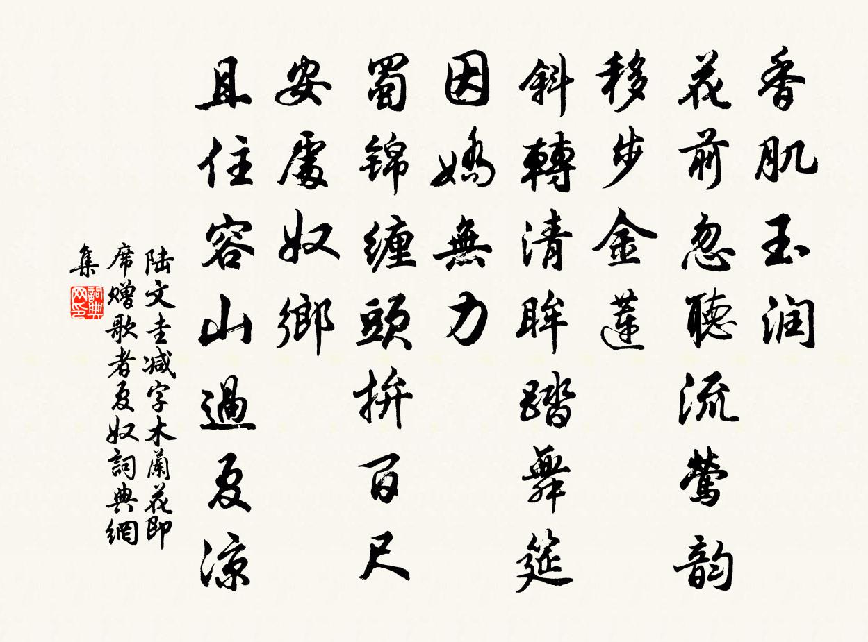 詩詞名句歷史字典書法欣賞書法字典國語詞典說文解字康熙字典古漢語字典標 題 作 者 詩 句 減字木蘭花 即席贈歌者夏奴作者:陸文圭 朝代:元代原文香肌玉潤。花前忽聽流鶯韻。移步金蓮。斜轉清眸踏舞筵。因嬌無力。蜀錦纏頭拚百尺。安處奴鄉。且住容山過夏涼。詩詞問答問:《減字木蘭花 即席贈歌者夏奴》的作者是誰?答:陸文圭問:該詩寫於哪個朝代?答:元代問:該詩是什麼體裁?答:詞書法欣賞減字木蘭花 即席贈歌者夏奴書法作品詩詞推薦東晉曾極〔宋代〕斷簡殘編跡可尋,諸賢興復不關心。未應全罪王夷甫,一任神州自陸沈。題蔣山李梅磵〔宋代〕登臨要說六朝遺,一個乾坤幾合離。豪傑已隨流水去,興亡只有此山知。古松隔道招遊客,丹對斜陽話舊時。寄語偈頌二百零五首釋正覺〔宋代〕來來去去山中人,識得青山便是身。青山是身身是我,更於何處著根塵。旦舂詞楊維楨〔元代〕兒為王,母為囚,旦舂暮舂無時休。天高地辱日月流,母苦不得從兒游。漢家謀臣張留侯,老人立致商山頭。君王過三郊驛卻寄楊評事時此子郭令公欲有表薦耿湋〔唐代〕冉冉青衫客,悠悠白髮人。亂山孤驛暮,長路百花新。終歲行他縣,全家望此身。更思君去就,早晚問平津。早起登覽有懷山居趙蕃〔宋代〕日出早煙消,舟行不待招。乍明村市塢,初露遠山椒。勝處宜規隱,浮生只浪飄。章泉在何許,繞塹碧蕭蕭。觀龍和謝師厚韓維〔宋代〕龍於經傳皆有雲,明幽其德能屈伸。嘗聞於耳昧厥真,乃今睹之信所聞。層陰填空白日昏,仰見巨尾垂輪囷。其長宮詞宋白〔宋代〕彤廷立仗雪初銷,仙樂空懸讌寮。齊指終南稱萬壽,遠平香案碧岧嶢。和虞永康梅花十絕句魏了翁〔宋代〕輕寒玉蓓試新妝,已識微酸一點黃。生意溶溶無間斷,何須聞笛為沾裳。秋夜紀懷陸游〔宋代〕缺月淡欲盡,老雞鳴苦遲。聊為待旦坐,不作感秋悲。魯叟一王法,豳人七月詩。平生經世志,老死欲誰期?心泉蒲壽宬〔宋代〕來尋萬古意,聊結此生緣。久視都無物,中間只見天。靈根何處覓,露液曉初鮮。白髮今如此,捫松憶少年。代季亨二首黃榦〔宋代〕枌榆接影一牛鳴,淑德相傳到後生。三世隻身長婉娩,兩兒雙淚遽縱橫。蘋蘩春澗情何切,機杼秋堂眼明。細讀古相和歌辭。鳳台曲李白〔唐代〕嘗聞秦帝女,傳得鳳凰聲。是日逢仙子,當時別有情。人吹彩簫去,天借綠雲迎。曲在身不返,空餘弄玉名。一室宋自遜〔宋代〕一室冷如冰,梅花相對清。殘年日易晚,夾雪雨難晴。身計趼千緒,世紛棋一枰。曲生差解事,談笑破愁城。篳篥吟楊維楨〔元代〕春風吹船下揚州,夜聽笛聲江月流。故宮搖落楊柳秋,客子於邑山陽愁。明朝此聲不可求,乃知朔客杜寬者,手持句孫侔〔宋代〕更起粉牆高百尺,莫令牆外俗人看。偈頌六十七首釋原妙〔宋代〕新年頭,行新令。露柱燈籠,急著眼聽。灶頭西南角有片方磚,惺惺伶俐,伶俐惺惺。念茲在茲,必恭必敬。因甚豫章上游江中有道觀蓋屍堅吾遊仙之地三首曾豐〔宋代〕水色月華俱受清,藏中各自有光明。夜來相遇影相射,幻我黃冠老眼睛。送家叔通守光山二首李洪〔宋代〕彼美光山郡,風流楚相城。寢丘聞漢志,潘國尚侯名。泥軾疏榮渥,楓宸眷老成。側聞頒一札,持橐奉承明。集英殿立侍觀進士唱名六首張鎡〔宋代〕科目從來本自寬,才疎只合作粗官。雕蟲半世將何用,可惜南湖負釣竿。名句推薦桃花嫣然出籬笑,似開未開最有情。汪藻《春日·一春略無十日晴》 漸行漸遠漸無書,水闊魚沉何處問。歐陽修《玉樓春·別後不知君遠近》 愁望春歸,春到更無緒文廷式《祝英台近·剪鮫綃》 淡淡橫朝煙,脈脈深秋思。劉道著《湘江秋曉》 天涯倚樓新恨,楊柳幾絲碧。晏幾道《六么令·雪殘風信》 東風吹水日銜山,春來長是閒。李煜《阮郎歸·呈鄭王十二弟》 相思只在,丁香枝上,豆蔻梢頭。王雱《眼兒媚·楊柳絲絲弄輕柔》 後其身而身先,外其身而身存。老子《老子·道經·第七章》 春風得意馬蹄疾,一日看盡長安花。孟郊《登科後》 扁舟一棹歸何處?家在江南黃葉村。蘇軾《書李世南所畫秋景》