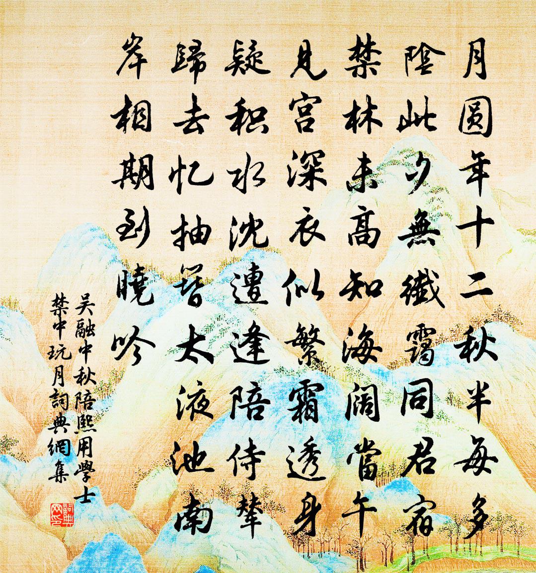 詩詞名句歷史字典書法欣賞書法字典國語詞典說文解字康熙字典古漢語字典標 題 作 者 詩 句 中秋陪熙用學士禁中玩月作者:吳融 朝代:唐代中秋陪熙用學士禁中玩月原文月圓年十二,秋半每多陰。此夕無纖靄,同君宿禁林。未高知海闊,當午見宮深。衣似繁霜透,身疑積水沈。遭逢陪侍輦,歸去憶抽簪。太液池南岸,相期到曉吟。詩詞問答問:中秋陪熙用學士禁中玩月的作者是誰?答:吳融問:中秋陪熙用學士禁中玩月寫於哪個朝代?答:唐代吳融中秋陪熙用學士禁中玩月書法欣賞中秋陪熙用學士禁中玩月書法作品注釋全唐詩:卷684-5詩詞推薦醉中劉宰〔宋代〕一樽綠酒與君同,且喜荷香送晚風。四座盡傾談柄白,滿筵不用舞裙紅。黃石還漁溪寄劉九四首陳藻〔宋代〕多少人家好弟兄,不堪閨婦似吹笙。十年再拜如丘嫂,更盡劉郎故舊情。水心即事六乎兼謝吳民表宣義葉適〔宋代〕拒霜旋插花疎疎,甘菊新移日曬枯。花草只今如此在,幾時寫作會昌圖。寄湖掾楊浩然強至〔宋代〕新持手版苕溪掾,應恨浮名別故鄉。澤國幾瞻飛雁序,春風自入墜鱣堂。坐曹未改平生好,開卷能如往日忙。龍首次韻環翠亭鄭俠〔宋代〕天圍湖海淨團圞,水色山光四座寒。暗結濃陰森萬木,靜鋪遙碧擁千巒。共斟綠醑看浮蟻,遙見孤舟下遠湍。是處七夕鄭文振席上姬有楚雲者為作三弄方岳〔宋代〕帝子經年別,秋風遠客情。斷雲含宿雨,古木落寒聲。河漢低逾潤,江潮夜未平。巫雲莫吹笛,吾意正淒清。減字木蘭花·春怨朱淑真〔宋代〕獨行獨坐。獨倡獨酬還獨臥。佇立傷神。無奈輕寒著摸人。此情誰見。淚洗殘妝無一半。愁病相仍。剔盡寒燈夢不驀山溪張表臣〔宋代〕樓橫北固,盡日厭厭雨。欸乃數聲歌,但渺漠、江山煙樹。寂寥風物,三五過元宵,尋柳眼,覓花英,春色知何處歐陽文忠公輓辭二首蘇頌〔宋代〕早向春闈遇品題,繼從留幕被恩知。何期瀔水緘書日,正是椒陵夢奠時。感舊緒言猶在耳,愴懷雙淚謾交頤。誰將和楊元忠主簿觀魚李廌〔宋代〕輕瀾沔滿帶維舟,新雨群魚藻際浮。既亦非知樑上樂,敢嗟彼有釜中憂。漢江水濁斑衣獺,楚岸煙深雪色鷗。未作水調歌頭 和姚雪齊韻王惲〔元代〕書史有真味,誰遣博微官。丈夫出處道在,義命正須安。浩浩都門冠蓋,眼冷雞蟲得失,矯首入遐觀。時對雪齋老惜芳時王哲〔元代〕諸公學道應徒甚。細細把、玄機苒荏。頭邊認取清涼枕、當風月、瑩然刀圭滋味頻頻飲。漸漸放、千花似錦。馨香次尹俊卿見訪有詩次韻王灼〔宋代〕聯驂來二妙,契好屬兒孫。夜半星河轉,談深幾席溫。能詩飯顆瘦,使酒濮陽髡。萬事醉吟里,那須倚市門。瑞鶴仙(壽虞守·三月初十)歐陽光祖〔宋代〕得毛韓經學。振祖風,挺挺凌煙勳業。文章世為甲。果妙齡秀髮,薦膺衡鶚。名登雁塔。訪梅仙,種河陽桃李,從句釋曉瑩〔宋代〕頹然只任真。失性張耒〔宋代〕失性摧頹君子鶴,忘羞跳擲沐猴冠。須知六合梟鸞雜,供與閒人靜處看。暗香(送杜景齋歸永嘉)張炎〔宋代〕猗蘭聲歇。抱孤琴思遠,幾番彈徹。洗耳無人,寂寂行歌古時月。一笑東風又急。黯消凝、恨聽啼鴂。想少陵、還赴御宴任希夷〔宋代〕新元六日 * 宴,黼扆前頭御榻橫。紫袖旁闌宣樂節,金貂當殿賜杯行。四夷來致三呼祝,萬舞馭同九奏聲。謬忝妾薄命左瀛〔宋代〕妾貌微微改,君恩漸漸疏。本期為匹鳥,深恐作前魚。卻月無心畫,香雲信手梳。佳人多薄命,不必重欷噓。閒居漫賦真山民〔宋代〕紛紛裘馬走紅塵,賴得閒邊可著身。商嶺定無屠狗客,雲台豈有釣魚人。溪山蕭散青芒履,風月夷猶烏角巾。萬事名句推薦風遞幽香出,禽窺素艷來。齊己《早梅》 夫天地者,萬物之逆旅也;光陰者,百代之過客也。李白《春夜宴桃李園序 / 春夜宴從弟桃花園序》 陋室空堂,當年笏滿床;衰草枯楊,曾為歌舞場。曹雪芹《好了歌注》 菩提本無樹,明鏡亦非台。惠能《菩提偈》 思爾為雛日,高飛背母時。白居易《燕詩示劉叟》 忍淚佯低面,含羞半斂眉。韋莊《女冠子·四月十七》 天涯地角有窮時,只有相思無盡處。晏殊《玉樓春·春恨》 一日不思量,也攢眉千度。柳永《晝夜樂·洞房記得初相遇》 唯天下至誠,方能經綸天下之大經,立天下之大本子思《中庸·第三十二章》 夜來幽夢忽還鄉,小軒窗,正梳妝。相顧無言,惟有淚千行。蘇軾《江城子·乙卯正月二十日夜記夢》