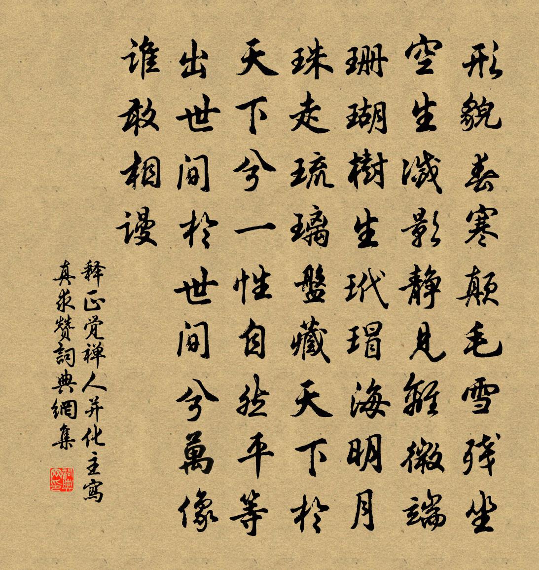 詩詞名句歷史字典書法欣賞書法字典國語詞典說文解字康熙字典古漢語字典標 題 作 者 詩 句 禪人並化主寫真求贊作者:釋正覺 朝代:宋代禪人並化主寫真求贊原文形貌春寒,顛毛雪殘。坐空生滅影,靜見離微端。珊瑚樹生玳瑁海,明月珠走琉璃盤。藏天下於天下兮一性自然平等,出世間於世間兮萬像誰敢相謾。詩詞問答問:禪人並化主寫真求贊的作者是誰?答:釋正覺問:禪人並化主寫真求贊寫於哪個朝代?答:宋代釋正覺禪人並化主寫真求贊書法欣賞禪人並化主寫真求贊書法作品詩詞推薦四月八日嘗新荔子楊萬里〔宋代〕一點臙脂染蔕旁,忽然紅遍綠衣裳。紫瓊骨骼丁香瘦,白雪肌膚午暑涼。掌上冰丸那忍觸,樽前風味獨難忘。老饕寄西山智道人釋智圓〔宋代〕淨業修持久,攀緣念已摧。冰潭殘月在,古岸夜禪回。像燭微留焰,爐香冷變灰。時逢舊參侶,閒坐話黃梅。畫車二首蘇軾〔宋代〕九衢歌舞頌王明,誰惻寒泉獨自清。賴有千車能散福,化為膏雨滿重城。鷓鴣天許有壬〔元代〕縷篆煙消月滿簾。青綾香減夜寒尖。鵲橋誰駕銀河渡,*漏應將海水添。天漠漠,恨厭厭。不成怨夢睡空甜。一春畫真來嵩梅堯臣〔宋代〕廣陵太守歐陽公,令爾畫我憔悴容。便傳仿佛在縑素,只欠勁直藏心胸。與我貨布不肯受,此之醫卜曾非庸。公今百花台曾鞏〔宋代〕煙波與客同樽酒,風月全家上采舟。莫問台前花遠近,試看何以武陵游。醉蓬萊(代上陳帥生日)洪适〔宋代〕正中秋初過,重陽相近,金莖多露。玉燕開祥,喜氣浮庭戶。覽鳳千峰,驂鸞八桂,未展青雲步。碧玉篸邊,紅蓮端午帖子太上皇后閣周必大〔宋代〕問安勅使馬如飛,絡繹時新奉母慈。蜀產吳包何足道,蟠桃熟處是瑤池。題趙表之李伯時畫捉馬圖詩二首張嵲〔宋代〕中原無事不粟馬,散牧春皋薦草中。何必西來三萬里,龍媒二駿是追風。祗役道中二首宋祁〔宋代〕絮亂東風急,花飛雜樹稠。離家王粲恨,贈婦彥先愁。樵浦連檣度,旗亭數蓋留。痴人了官事,歸釣誤楂頭。悼吳居厚喻良能〔宋代〕學問從來著月評,慈恩何事欠題名。賢哉難老堂雖就,惜也陳情表未成。疇昔幾回同把酒,於今一涕獨沾纓。張公秋雨聯句韓愈〔唐代〕萬木聲號呼,百川氣交會。 ——孟郊庭翻樹離合,牖變景明藹。 ——韓愈潈瀉殊未終,飛浮亦云泰。 ——孟鰻井范成大〔宋代〕決甃神通未易論,雨聲留客夜翻盆。不辭客路春泥滑,且足秧田舊水痕。送韓子云撿正將漕江東二首楊萬里〔宋代〕宰士仍名士,詩人更德人。還家桐樹古,攬轡繡衣新。不以髯邊雪,而忘句里春。登庸衣缽在,得戀大江濱。汝平諸公見和復用韻二首陳棣〔宋代〕新詩敏捷雨翻盆,樽酒何時與細論。擬把鉛刀侔巨闕,卻慚布鼓過雷門。天心月脅形容遍,春蚓秋蛇體勢存。但得次韻高子勉十首黃庭堅〔宋代〕君不居郎省,還應上諫坡。才高殊未識,歲晚喜無它。櫪馬羸難出,鄰雞凍不歌。寒爐余幾火,灰里撥陰何。送呂彥升參謀陸游〔宋代〕楚塞蕭條久宿師,參謀承詔上丹墀。苦言到口真當發,聖度如天莫自疑。萬里寄聲長不達,一尊相屬豈前期。遙憐佛印元公自京師還作詩贈之釋可遵〔宋代〕上國歸來路幾千,渾身猶帶御爐煙。鳳凰山下敲篷詠,驚起山翁白書眠。玉汝置酒招二十一丈同之鄙句奉呈趙蕃〔宋代〕薄宦一雞肋,飽霜雙蟹螯。只言成爾負,那卜會吾曹。我已愧蓬鬢,君俱追錦袍。團團石頭月,其下走江濤。春夜家宴王鎡〔宋代〕燭底裁詞按玉簫,翠宮合唱取腔嬌。梨花影護春風暖,不用香薰酒自消。名句推薦中年親友難別,絲竹緩離愁。蘇軾《水調歌頭·安石在東海》 錢塘江上潮信來,今日方知我是我。施耐庵《水滸傳·第一百一十九回》 池塘生春草,園柳變鳴禽。謝靈運《登池上樓》 有田不耕倉廩虛,有書不讀子孫愚。佚名《增廣賢文·上集》 臥聞兒女夸翁健,詩句年光一樣新劉克莊《戊午元日二首》 古台搖落後,秋日望鄉心。劉長卿《秋日登吳公台上寺遠眺》 青山隱隱水迢迢,秋盡江南草未凋。杜牧《寄揚州韓綽判官》 紅樹青山日欲斜,長郊草色綠無涯。歐陽修《豐樂亭遊春·其三》 精誠所加,金石為開。范曄《後漢書·列傳·光武十王列傳》 夭紅過眼隨榮謝,菊秀蘭香自占春。王汝舟《詠歸堂隱鱗洞》