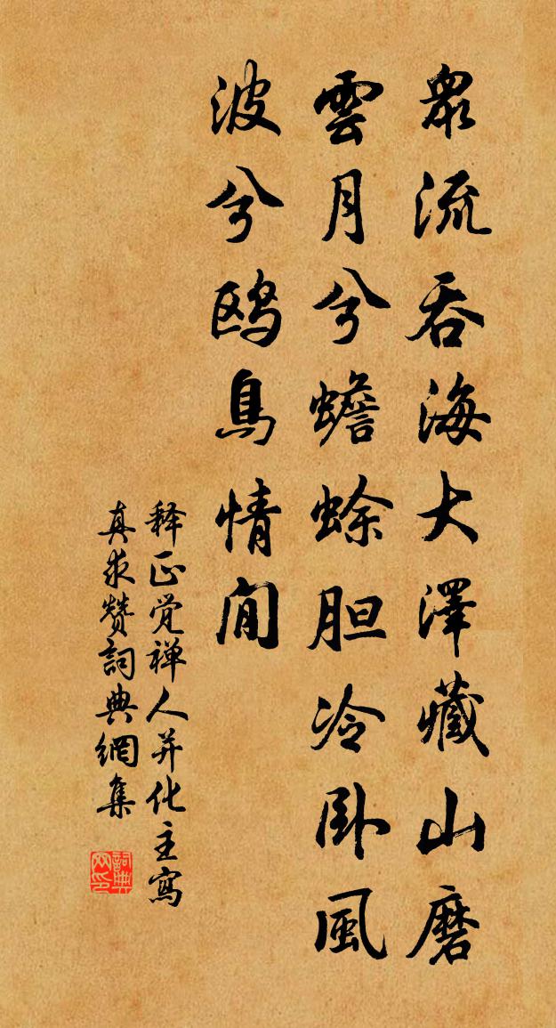 詩詞名句歷史字典書法欣賞書法字典國語詞典說文解字康熙字典古漢語字典標 題 作 者 詩 句 禪人並化主寫真求贊作者:釋正覺 朝代:宋代禪人並化主寫真求贊原文眾流吞海,大澤藏山。磨雲月兮蟾蜍膽冷,臥風波兮鷗鳥情閒。詩詞問答問:禪人並化主寫真求贊的作者是誰?答:釋正覺問:禪人並化主寫真求贊寫於哪個朝代?答:宋代釋正覺禪人並化主寫真求贊書法欣賞禪人並化主寫真求贊書法作品詩詞推薦次亞愚韻王諶〔宋代〕絲絲楊柳拂輕煙,那惜床頭買酒錢。此段風流如不賞,一般佳致又明年。題延真羅道士玉澗文天祥〔宋代〕雙雙夾方流,知有至妙蘊。山石發清暉,草木得餘澗。泉源皆寶氣,樵牧駭潛蜃。仙翁獨危坐,華池養水性。神澤句吳伯凱〔宋代〕平生五千卷,為方不為圓。響屧廊楊備〔宋代〕步步香翻羅襪塵,粉紅花艷滿宮春。傾城一笑無遺蹟,不見長廊響屧人。擬古六首上鮮于大夫子駿其五涉江采芙蓉晁補之〔宋代〕涉江采芙蓉,江上零露滋。方舟不能度,日暮白苹悲。清波有鳴鴻,蕩漾安可期。幸因南風逝,寄言欽所思。夜登千峰榭陸游〔宋代〕夷甫諸人骨作塵,至今黃屋尚東巡。度兵大峴非無策,收泣新亭要有人。薄釀不澆胸壘塊,壯圖空負膽輪囷。危樓澤畔吟曹勛〔宋代〕駕文螭兮翔九天,天路遠兮中道還。邈故國兮懷所安,心恥恥兮循江乾。紉秋蘭以為裳兮,采杞菊以為餐。望佳人酬莊器之賢良見贈陸游〔宋代〕先朝六科親策士,事業功名何壯偉。元佑復科財數年,所得四三俄復止。中興思賢形夢想,屢詔自是朝廷美。紈褲玉樓春(戊寅重陽,病中不飲,惟煎小雲團一杯,薦以菊花)毛滂〔宋代〕西風吹冷沈香篆。門掩小晴紅葉院。臥看 * 送重陽,露重煙寒花未遍。衰翁病怯琉璃簟。日日愁侵霜鬢短。一杯上運管張平國華岳〔宋代〕雨洗芙容沃眼青,雪潭澄月照人明。銅民指點向民說,未比當年令尹清。平戎辭王涯〔唐代〕太白秋高助發兵,長風夜卷虜塵清。男兒解卻腰間劍,喜見從王道化平。賦順適堂葉茵〔宋代〕暗觸闊陵機,茅居峙竹扉。安時貧亦樂,聞道詠而歸。鳧鶴從長短,鳶魚自躍飛。吾猶臧谷耳,夷跖是耶非。牡丹四首薛能〔唐代〕異色稟陶甄,常疑主者偏。眾芳殊不類,一笑獨奢妍。顆折羞含懶,叢虛隱陷圓。亞心堆勝被,美色艷於蓮。品格偈頌一百三十六首釋惟一〔宋代〕去秋雙峨摧,今夏芝岩墜。松江松慘然,花嶼花流涕。惟有長空孤月圓,東西分照兩無偏。次韻雨絲雲鶴二首黃庭堅〔宋代〕煙雲杳靄合中稀,霧雨空濛密更微。園客繭絲抽萬緒,蛛蝥網面罩群飛。風光錯綜天經緯,草木文章帝杼機。願染經古行宮劉滄〔唐代〕玉輦西歸已至今,古原風景自沈沈。御溝流水長芳草,宮樹落花空夕陰。蝴蝶翅翻殘露滴,子規聲盡野煙深。路人次韻和鄧慎思謝劉明復重畫道林秋景二首孔武仲〔宋代〕以詩博畫雖不費,要秋得冬如未完。恍疑霰雪滿天地,慘若暮氣迷峰巒。夜堂高張醉魂醒,暑館偶窺吟魄寒。筆端洛中送冀處士東遊杜牧〔唐代〕處士有儒術,走可挾車輈。壇宇寬帖帖,符彩高酋酋。不愛事耕稼,不樂乾王侯。四十餘年中,超超為浪遊。元和風吹木葉吟邵雍〔宋代〕風吹木葉不吹根,慎勿將根苦自陳。天子舊都閒好住,聖人餘事冗休論。長年國里神仙侶,安樂窩中富貴人。萬水雪後宋伯仁〔宋代〕暖地難為雪,春天易得晴。落梅狂客意,啼鳥故園聲。秋樂從他事,湖山寄此生。願將身與世,渾似柳梢輕。名句推薦雉雊麥苗秀,蠶眠桑葉稀。王維《渭川田家》 處事要代人作想,讀書須切己用功。王永彬《圍爐夜話·第五則》 獨善其身盡日安,何須千古名不朽!羅貫中《三國演義·第三十七回》 眾中聞謦欬,未語知鄉里。蘇軾《送金山鄉僧歸蜀開堂》 相逢不用忙歸去,明日黃花蝶也愁。蘇軾《九日次韻王鞏》 何處是歸程?長亭連短亭。李白《菩薩蠻·平林漠漠煙如織》 莫罵酉時妻,一夜受孤淒。佚名《增廣賢文·上集》 白髮漁樵江渚上,慣看秋月春風。楊慎《臨江仙·滾滾長江東逝水》 春恨秋悲皆自惹,花容月貌為誰妍。曹雪芹《紅樓夢·第五回》 煙水初銷見萬家,東風吹柳萬條斜。竇鞏《襄陽寒食寄宇文籍》