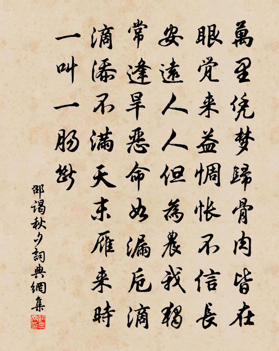 詩詞名句歷史字典書法欣賞書法字典國語詞典說文解字康熙字典古漢語字典標 題 作 者 詩 句 秋夕作者:邵謁 朝代:唐代秋夕原文萬里憑夢歸,骨肉皆在眼。覺來益惆悵,不信長安遠。人人但為農,我獨常逢旱。惡命如漏卮,滴滴添不滿。天末雁來時,一叫一腸斷。詩詞問答問:秋夕的作者是誰?答:邵謁問:秋夕寫於哪個朝代?答:唐代問:秋夕是什麼體裁?答:五古邵謁秋夕書法欣賞秋夕書法作品注釋全唐詩:卷605-6詩詞推薦踏莎行 示觀堂洪希文〔元代〕郡國興賢,*宮課試。書生事業從今始。銓衡當道有司明,吹噓送上青雲里。賦要凌雲,文如翻水。八音五色驚童涼公從叔春祭廣利王廟李群玉〔唐代〕龍驤伐鼓下長川,直濟雲濤古廟前。海客斂威驚火旆,天吳收浪避樓船。陰靈向作南溟王,祀典高齊五嶽肩。從此予解邑過杭遇介之學士謁告南歸強至〔宋代〕同時兩郡冠鄉書,屈指俄經一紀餘。顧我冗塗移蹇足,羨君榮路駕奔車。方從解紱辭岩邑,已見飛章厭石渠。自古遊仙釋文珦〔宋代〕吾嫌人世隘,忻同古仙伍。寂爾契沖虛,與這相爾汝。晨多游玉清,夕每憩園圃。身已外乾坤,飄飄自遐舉。郊廟歌辭。享先農樂章。鹹和佚名〔唐代〕三推禮就,萬庾祈凝。夤賓志遠,藨袞惟興。降歆肅薦,垂祐祗膺。送神有樂,神其上升。生查子·陌上郎賀鑄〔宋代〕西津海鶻舟,徑度滄江雨。雙艫本無情,鴉軋如人語。揮金陌上郎,化石山頭婦。何物系君心,三歲扶床女。挽安溪黃丞劉克莊〔宋代〕未得毛錐力,空將鐵硯磨。暗投主司老,私淑里人多。三韭何妨飽,雙松不待喔。鄉鄰惜耆舊,為輟相舂歌。澗西閒汎張鎡〔宋代〕曲曲通航小,蘭橈手自移。映叢憐白鷺,特地過灣遲。清平樂(趙圍避暑)佚名〔宋代〕柳陰庭院。簾約風前燕。著雨荷花紅半斂。消得盈盈綠扇。竹光野色生寒。玉纖雪藕冰盤。長記酒醒人靜,暗香吹太廟樂章皇帝還伴乾安之曲周麟之〔宋代〕於穆清廟,明禋是躬。卿士駿奔,助我肅雝。灌鬯已事,精誠交通。卻立以思,僾然其恭。窮冬逆旅曾豐〔宋代〕日月隙中容易過,歸期我與歲相蹉。雪霜使氣張湯酷,風日容情下惠和。木葉先凋歸宿早,梅花後發得春多。輿台偈頌四十二首釋祖先〔宋代〕舊歲夜來去,去從何處去。新年今日來,來從何處來。既無來,又無去,鐵壁銀山成指注。山行吳錫疇〔宋代〕策蹇又山行,看山不識名。平林秋後薄,疊嶂日邊明。雲近侵衣濕,泉幽照影清。歸樵饒樂意,笛弄兩三聲。蕉逕小立舒岳祥〔宋代〕晝夜中分涼燠平,裁新熨故體輕清。無端撓亂成多事,旬種芭蕉作雨聲。朝中措(安人生日·三之一)張綱〔宋代〕年時生日宴高堂。歡笑擁爐香。今日山前停棹,也須隨分飛觴。東陽太守,攜家遠去,方溯桐江。把酒祝君長健,四明山詩鞠侯陸龜蒙〔唐代〕何事鞠侯名,先封在四明。但為連臂飲,不作斷腸聲。野蔓垂纓細,寒泉佩玉清。滿林遊宦子,誰為作君卿。和潔堂見壽十章馬廷鸞〔宋代〕風雨傾燕巢,波濤漲鯨海。茅檐得此生,其誰為爾宰。都亭驛詩洪皓〔宋代〕都驛荒涼尚邃深,息肩藉庇有餘陰。故宮今已生禾黍,翻作行人倍痛心。德遠叔坐上賦餚核八首銀杏楊萬里〔宋代〕深灰淺火略相遭,小苦微甘韻最高。未必雞頭如鴨腳,不妨銀杏伴金桃。前有別楊柳枝絕句,夢得繼和雲春盡絮飛留不白居易〔唐代〕柳老春深日又斜,任他飛向別人家。誰能更學孩童戲,尋逐春風捉柳花。名句推薦可憐繡戶侯門女,獨臥青燈古佛旁。曹雪芹《紅樓夢·第五回》 夜闌臥聽風吹雨,鐵馬冰河入夢來。陸游《十一月四日風雨大作》 無聊成獨臥,彈指韶光過。納蘭性德《菩薩蠻·新寒中酒敲窗雨》 樹德務滋,除惡務本佚名《尚書·周書·泰誓》 江春不肯留歸客,草色青青送馬蹄。劉長卿《送李判官之潤州行營》 歌舞尊前,繁華鏡里,暗換青青發。薩都剌《念奴嬌·登石頭城次東坡韻》 酒逢知己千杯少,話不投機半句多歐陽修《春日西湖寄謝法曹韻》 黃雲連白草,萬里有無間。王鎡《塞上曲》 漢口夕陽斜渡鳥,洞庭秋水遠連天。劉長卿《自夏口至鸚鵡洲夕望岳陽寄源中丞》 天若有情天亦老,搖搖幽恨難禁。孫洙《河滿子·秋怨》