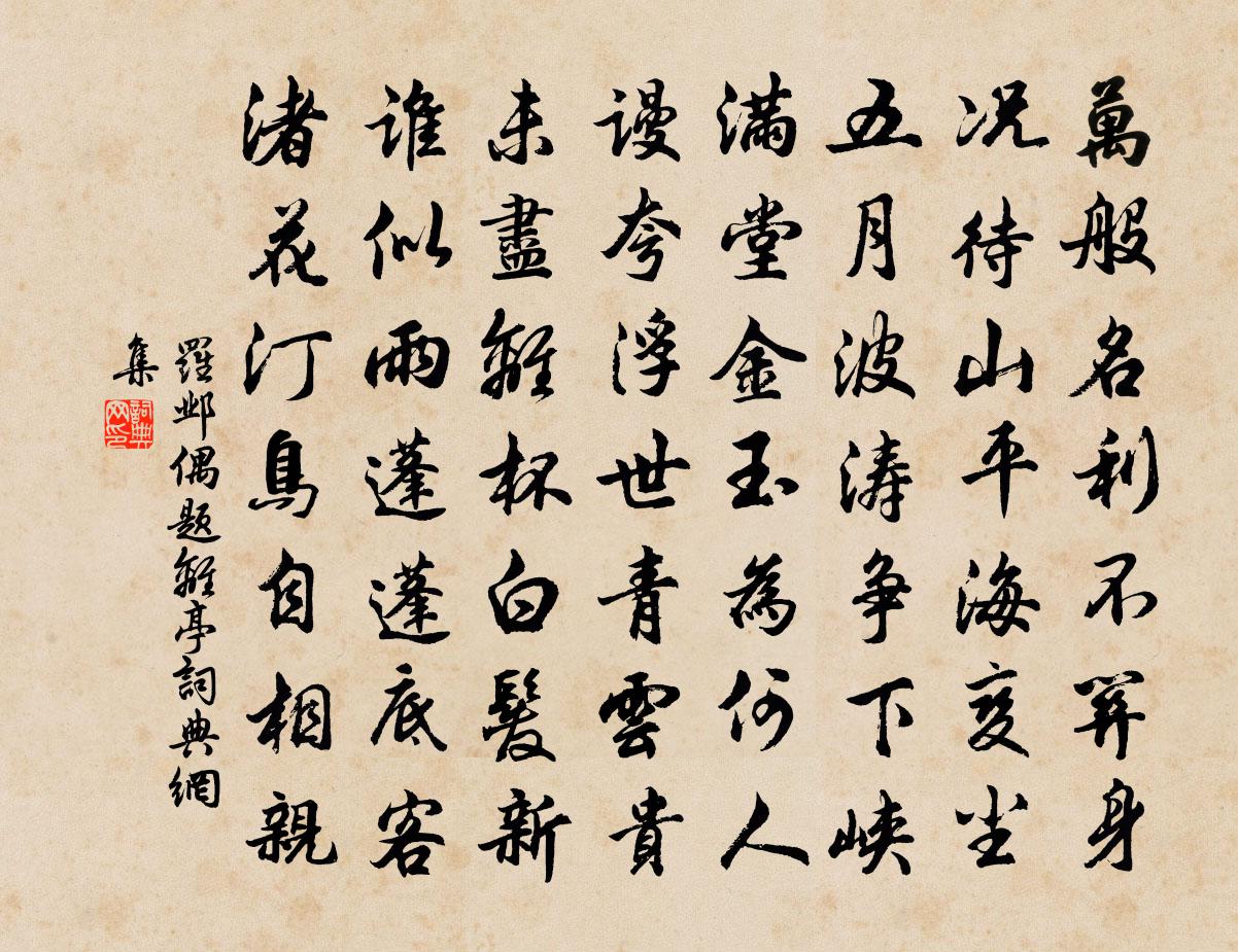 詩詞名句歷史字典書法欣賞書法字典國語詞典說文解字康熙字典古漢語字典標 題 作 者 詩 句 偶題離亭作者:羅鄴 朝代:唐代偶題離亭原文萬般名利不關身,況待山平海變塵。五月波濤爭下峽,滿堂金玉為何人。謾夸浮世青雲貴,未盡離杯白髮新。誰似雨蓬蓬底客,渚花汀鳥自相親。詩詞問答問:偶題離亭的作者是誰?答:羅鄴問:偶題離亭寫於哪個朝代?答:唐代問:偶題離亭是什麼體裁?答:七律羅鄴偶題離亭書法欣賞偶題離亭書法作品注釋全唐詩:卷654-127詩詞推薦西樓月 勉道友馬鈺〔元代〕閒行閒坐閒眠。養丹田。常把東西南北,合和煎。處玄妙。波中燎。用抽添。五彩霞光覆載,一胎仙。出省有日書事歐陽修〔宋代〕凌晨小雨壓塵輕,閒憶登高望禁城。樹色連雲春泱漭,風光著草日晴明。看榆吐莢驚將落,見鵲移巢忽已成。誰向眾樂亭二首錢公輔〔宋代〕誰把江湖付此翁,江湖更在廣城中。葺成世界三千景,占得鵬天九萬風。宴豆四時諠畫鼓,遊人兩岸跨長虹。他年夢中謝和老惠茶蘇轍〔宋代〕西鄰禪師憐我老,北苑新茶惠初到。晨興已覺三嗅多,午枕初便一杯少。七碗煎嘗病未能,兩腋風生空自笑。定中雙雁兒楊無咎〔宋代〕窮陰急景暗推遷。減綠鬢,捐朱顏。利名牽役幾時閒。又還驚,一歲圓。勸君今夕不須眠。且滿滿,泛觥船。大家題王茂悅郴州白水奇清園高斯得〔宋代〕靈區有異產,化國無潛珍。坡公論人物,我則賦奇清。壯哉此白水,誰其瀉青冥。薶藏富媼嗇,抉剔天公嗔。霹靂重經昭陵杜甫〔唐代〕草昧英雄起,謳歌歷數歸。風塵三尺劍,社稷一戎衣。翼亮貞文德,丕承戢武威。聖圖天廣大,宗祀日光輝。陵寢送薛子長葉適〔宋代〕藏冰待炎威,織裘御冬霰。彼此互有適,用舍空屢變。蘭菊倚戶出,松柏參天見。美質不必同,偉乾非世便。薛生蝶戀花·春江暖漲桃花顧德輝〔宋代〕陳浩然招游觀音山,宴張氏樓。徐姬楚蘭佐酒,以琵琶度曲。郯雲台為之心醉。口占戲之。春江暖漲桃花水。畫舫六言二首陳與義〔宋代〕種竹可侔千戶,擁書不假百城。何必思之爛熟,熱官無用分明。放榜詩(太和八年放榜,進士多貧士)佚名〔宋代〕乞兒還有大通年,三十三人碗杖全。薛庶準前騎瘦馬,范酇依舊蓋番氈。蒼梧謠張孝祥〔宋代〕歸。數得宣麻拜相時。秋前後,公袞更萊衣。送人歸山釋文珦〔宋代〕君歸西山去,為愛山中雲。雲亦喜君歸,日夕常氤氳。雲蹤渺難期,別恨徒殷勤。他時望山色,眼中如見君。清音亭鄭國輔〔宋代〕山泉潄玉琴,塵世誰知音。植杖憩於此,頓消名利心。和宗易賦素馨茉莉白蓮韻陳傅良〔宋代〕軒窗一日粲三英,盡室無塵眼倍明。閩粵固嘗矜絕美,風騷猶未及知名。羞將姿媚隨花譜,愛伴孤高上月評。獨恨長門怨劉言史〔唐代〕獨坐爐邊結夜愁,暫時思去亦難留。手持金箸垂紅淚,亂撥寒灰不舉頭。隱真洞趙汝造〔宋代〕鼎湖劍佩有遺蹤,唐室真人羽化同。九轉蕊成丹灶冷,五雲車去玉堂空。仙家日月蓬壺裡,塵世煙化夢寐中。徒有蝶戀花 錢塘燈夕 永樂大典卷二萬三百五十四貫雲石〔元代〕燈意留人云自列。六市輕簾,*露錢塘月。十二修鬟流翠結。東風搖落仙肌雪。淺淺銀壺催曉色。蘭影香中,總是楊柳枝詞九首·其四劉禹錫〔唐代〕金谷園中鶯亂飛,銅駝陌上好風吹。城東桃李須臾盡,爭似垂楊無限時。寄題終南道宣律師塔釋智圓〔宋代〕冷碧終南插太虛,紵麻蘭若舊閒居。波離滅後無人繼,蕭索西風葉滿渠。名句推薦潮平兩岸闊,風正一帆懸。王灣《次北固山下》 人異而心異,擇其弱者以攻之,其神必潰。來俊臣《羅織經·問罪卷第十》 謝亭離別處,風景每生愁。李白《謝公亭·蓋謝朓范雲之所游》 雪嶺金河獨向東,吳山楚澤意無窮清江《送婆羅門》 天變不足畏,祖宗不足法,人言不足恤。脫脫《宋史·列傳·卷八十六》 君子不以冥冥墮行。張廷玉《明史·列傳·卷三十七》 街南綠樹春饒絮。雪滿遊春路。晏幾道《御街行·街南綠樹春饒絮》 鬧里掙錢,靜處安身。佚名《增廣賢文·上集》 秋冬雪月,千里一色;蘇軾《放鶴亭記》 人間夢隔西風,算天上、年華一瞬。吳文英《惜秋華·七夕》