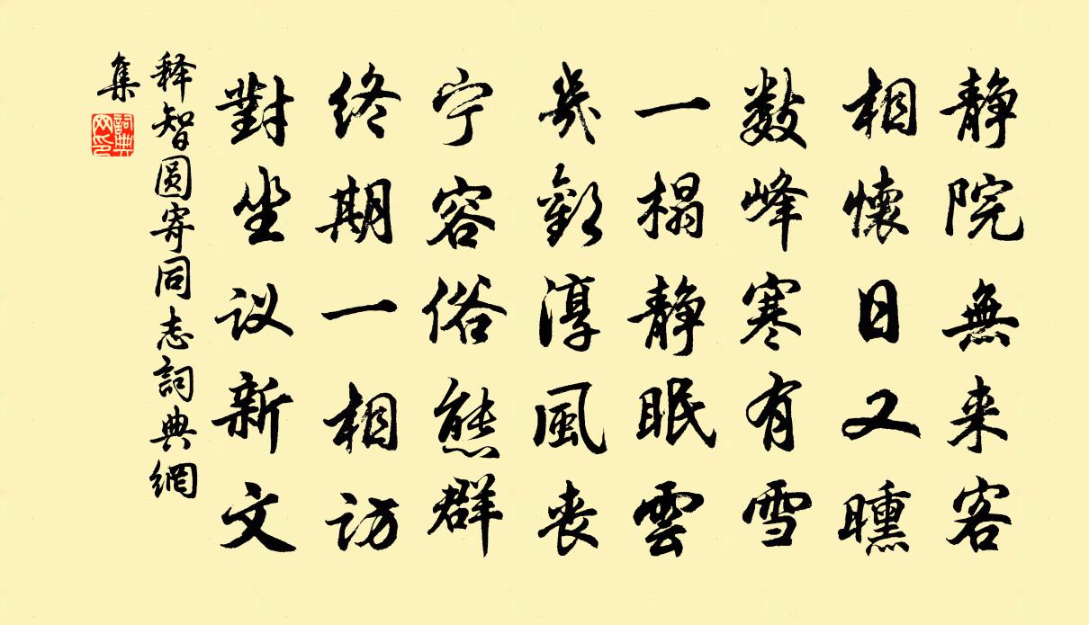 詩詞名句歷史字典書法欣賞書法字典國語詞典說文解字康熙字典古漢語字典標 題 作 者 詩 句 寄同志作者:釋智圓 朝代:宋代寄同志原文靜院無來客,相懷日又曛。數峰寒有雪,一榻靜眠雲。幾歡淳風喪,寧容俗態群。終期一相訪,對坐議新文。詩詞問答問:寄同志的作者是誰?答:釋智圓問:寄同志寫於哪個朝代?答:宋代釋智圓寄同志書法欣賞寄同志書法作品詩詞推薦子永弟寄都下大雪律詩李洪〔宋代〕快雪頻占瑞,饕風並助豪。白銀天上闕,組練浙江濤。拓地龍沙遠,瞻山群玉高。齊宮延孟叟,楚些誦離騷。絕塞端午出遊程師孟〔宋代〕三山漂渺藹蓬萊,一望青天十里平。千騎臨流搴翠帷,萬人擁道出重城。參差螮蝀橫波瀾,飛躍鯨鯢斗楫輕。且醉人月圓·宴北人張侍御吳激〔金代〕南朝千古傷心事,猶唱後庭花。舊時王榭,堂前燕子,飛向誰家?恍然一夢,仙肌勝雪,宮髻堆鴉。江州司馬,青最多宜賀鑄〔宋代〕半解香銷撲粉肌。避風長下絳紗帷。碧琉璃水浸瓊枝。不學壽陽窺曉鏡,何煩京兆畫新眉。可人風調最多宜。閒居十首陳造〔宋代〕寒食清明一箭過,晚晴庭院綠陰多。兔葵燕麥易輕脫,紅藥碧桃須孰何。東城外作呈圓機晁說之〔宋代〕默默專城歲月馳,忽來郊外得心期。龍蛇起伏知何處,天地圓方在此時。更喜風光似江介,可憐飽餉便忘疲。即從弋陽縣江上書觸目陸游〔宋代〕縣前奇哉一江水,日暮風吹碧鱗起。客恨征塵忽如洗,不用金篦刮眸子。丹楓岸邊雪色蘆,下有老翁方捕魚。欲求寄荊幕孫郎中齊己〔唐代〕珠履風流憶富春,三千鵷鷺讓精神。詩工鑿破清求妙,道論研通白見真。四座共推操檄健,一家誰信買書貧。別來題滄浪峽榜鄭仁表〔唐代〕分峽東西路正長,行人名利火然湯。路傍著板滄浪峽,真是將閒攪撩忙。菩薩蠻(回文冬閨怨)蘇軾〔宋代〕雪花飛暖融香頰。頰香隔暖飛花雪。欺雪任單衣。衣單任雪欺。別時梅子結。結子梅時別。歸不恨開遲。遲開恨不正冊判詞曹雪芹〔清代〕子系中山狼,得志便猖狂。金閨花柳質,一載赴黃粱。家兄有和再用韻艾可翁〔宋代〕亂離生世晚,衰白在人前。雲水飛飢鶴,山林付亂蟬。日今行黑道,人有隔黃泉。晷漸秋來短,愁長亦敵年。不睡張鎡〔宋代〕溽暑快新霽,濕風生夕涼。屋解掛月盤,瀲灩冰玉光。飛蟲細可數,夜氣收莽蒼。境勝玩不足,橫筇據胡床。孤生謝趙昌父投贈詩卷喻良能〔宋代〕趙子有新作,鼎珍初出庖。端能工競病,寧復費推敲。白戰應難敵,清臞亦任嘲。風流前輩盡,試合續弦膠。和東坡送仲天貺王元直六言韻五首黃庭堅〔宋代〕天子文明浚哲,今年不次用人。九原埋此佳士,百草無情自春。桑陰曲楊維楨〔元代〕妾自夫君成,桑陰路不通。將軍哮似虎,少婦竊秦宮。柴門釋文珦〔宋代〕柴門雖設不曾關,時有忘機客往還。風送釣舟來北渚,雨催樵子下西山。生前富貴何勞美,身後聲名亦是閒。萬慮龍塘久別乘月再到奉呈同社一首王阮〔宋代〕龍塘疇昔擅雲煙,破月重來倍爽然。浮玉北堂三萬頃,扁舟西子二千年。青山識面爭迎櫂,白鷺知心不避船。華發東岩精舍李覯〔宋代〕像設彼何時,高僧白衲衣。水寒吞日氣,樹老慣霜威。幡影捎天近,鐘聲落谷微。可憐成道易,無事即無機。藤州道上李孟博〔宋代〕道上何嘗識故侯,解鞍聊發小遲留。莫向漳江更南望,四十八驛是藤州。名句推薦並刀如水,吳鹽勝雪,縴手破新橙。周邦彥《少年游·並刀如水》 春未老,風細柳斜斜。蘇軾《望江南·超然台作》 肉腐出蟲,魚枯生蠹。荀子《荀子·勸學》 留戀海棠顏色、過清明。張輯《南歌子·柳戶朝雲濕》 記得別伊時,桃花柳萬絲。納蘭性德《菩薩蠻·新寒中酒敲窗雨》 賞罰不可輕行,用人彌須慎擇。吳兢《貞觀政要·卷三·論擇官》 葉開隨足影,花多助重條。陰鏗《雪裡梅花詩》 山無陵,江水為竭。佚名《上邪》 行人悵望蘇台柳,曾與吳王掃落花。姜夔《姑蘇懷古》 雪似梅花,梅花似雪。似和不似都奇絕。呂本中《踏莎行·雪似梅花》