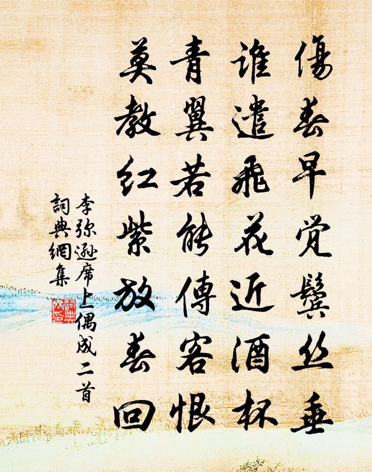 詩詞名句歷史字典書法欣賞書法字典國語詞典說文解字康熙字典古漢語字典標 題 作 者 詩 句 席上偶成二首作者:李彌遜 朝代:宋代席上偶成二首原文傷春早覺鬢絲垂,誰遣飛花近酒杯。青翼若能傳客恨,莫教紅紫放春回。詩詞問答問:席上偶成二首的作者是誰?答:李彌遜問:席上偶成二首寫於哪個朝代?答:宋代李彌遜席上偶成二首書法欣賞席上偶成二首書法作品詩詞推薦焚衣街馬之純〔宋代〕玉指親裁五彩衣,尚方工作極纖奇。看來亡國都緣此,爇向通衢了不遺。鷸羽化為青燒去,雉頭還有紫煙隨。更須次韻王亞之沿湖冒雨歸張嵲〔宋代〕禽鳴滑滑濺泥塗,賴有雲巢眼不孤。天外黑風迷鷲嶺,檻前流水憶鵝湖。躋攀危磴九折坂,捧玩新詩百斛珠。收拾九月七夜喜新涼張九成〔宋代〕晚來天宇陰,便有如許涼。衣襟不作苦,燈火耿寒光。青編如故人,入眼興未央。憶昔炎歊日,蒸郁如揚湯。百事千秋歲(張文伯生日)王之道〔宋代〕曉霜初肅。秋色團芳菊。榴轉紫,柑猶綠。昨朝吹帽會,未快登臨目。須信道,兵廚準擬三千斛。采采香雲掬。泛次李德充別劉長因韻吳則禮〔宋代〕懸榻有妙致,脫冠論古情。羈愁一杯盡,好句萬人驚。談塵初未厭,檣烏俄小征。遙憐柁樓底,別夜月孤明。春日呈韓文章甫〔宋代〕陽烏陰兔爭馳騁,人世光陰剎那頃。玉盤生菜亂青絲,三歲公家喫春餅。前年班春池陽城,民物熙熙簫鼓聲。去年【雙調】沉醉東風_湖上晚眺林張可久〔元代〕湖上晚眺林君復先生故居,蘇子瞻學士西湖。六月天,孤山路,載笙歌畫船無數。萬頃玻璃浸玉壺,夕陽外荷花帶清風長吟邵雍〔宋代〕宇宙中和氣,清泠無比方。與時蠲疾病,為歲造豐穰。起自青苹末,來從翠樹傍。得逢明月夜,便入故人鄉。密葉晚日湖上寄所思李華〔唐代〕與君為近別,不啻遠相思。落日平湖上,看山對此時。山居雜詩九十首曹勛〔宋代〕秋雨濕庭戶,陋舍集閒客。重以樽酒空,可為飢腸厄。呼童取杯酌,村酒我先識。一杯復一杯,滿坐生春色。采芹亭方蒙仲〔宋代〕覓得廣文沽酒錢,便須歸隱四山環。豈無半幅鵝溪絹,貌取亭前一帶山。又和後九首劉克莊〔宋代〕憂患長我意智,苦樂隨渠業緣。貴人銀燭按樂,書生紙裹見錢。送關彥遠赴河北曾鞏〔宋代〕子明高誼眾人知,苗裔清材世所推。詩作士林夸刻燭,賦成天路喜同時。豈當白首淹風力,自合青雲縱羽儀。北部再用才子富文華校讎天祿閣韻贈周教授陳造〔宋代〕步屧城腳園,蒼官拱綠士。向來錦打圍,轉首就紛妄。流光不貸客,感喟中夜起。肝腸舊輪囷,言賦子虛子。宮詞二首孔武仲〔宋代〕十頃西池碧近天,春深調馬教龍船。至尊勤政歡嬉少,企望鑾輿又七年。鷺鷥裴說〔唐代〕秋江清淺時,魚過亦頻窺。卻為分明極,翻成所得遲。浴偎紅日色,棲壓碧蘆枝。會共同侶,翱翔應可期。田園雨後贈鄰人錢起〔唐代〕安排常任性,偃臥晚開戶。樵客荷蓑歸,向來春山雨。殘雲虹未落,返景霞初吐。時鳥鳴村墟,新泉繞林圃。堯年發楊港渡入交石夾四首楊萬里〔宋代〕朝雨匆匆霽,春山歷歷嘉。老青交幼綠,暗錦出明花。漁艇十數隻,雞聲三五家。人生須富貴,此輩亦生涯。題茶陵縣門伊用昌〔唐代〕茶陵一道好長街,兩畔栽柳不栽槐。夜後不聞更漏鼓,只聽錘芒織草鞋。翠羽吟蔣捷〔宋代〕紺露濃。映素空。樓觀峭玲瓏。粉凍霽英,冷光搖盪古青松。半規黃昏淡月,梅氣山影溟濛。有麗人、步依修竹,名句推薦勸我早還家,綠窗人似花。韋莊《菩薩蠻·紅樓別夜堪惆悵》 此際閒愁郎不共,月移窗罅春寒重。王士禎《蝶戀花·和漱玉詞》 說詩者,不以文害辭,不以辭害志。以意逆志,是為得之。孟子《孟子·萬章章句上·第四節》 相望試登高,心隨雁飛滅。孟浩然《秋登蘭山寄張五》 山有木兮木有枝,心悅君兮君不知。佚名《越人歌》 君子敬其在己者,而不慕其在天者,是以日進也。荀子《荀子·天論》 夜闌更秉燭,相對如夢寐杜甫《羌村》 相知無遠近,萬里尚為鄰。張九齡《送韋城李少府》 夫妻反目,不能正室也。佚名《易傳·象傳上·小畜》 故國神遊,多情應笑我,早生華髮。蘇軾《念奴嬌·赤壁懷古》