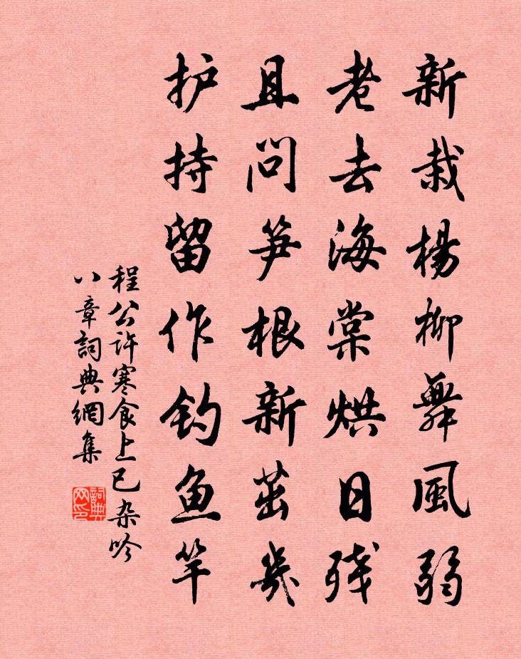 詩詞名句歷史字典書法欣賞書法字典國語詞典說文解字康熙字典古漢語字典標 題 作 者 詩 句 寒食上已雜吟八章作者:程公許 朝代:宋代寒食上已雜吟八章原文新栽楊柳舞風弱,老去海棠烘日殘。且問筍根新茁幾,護持留作釣魚竿。詩詞問答問:寒食上已雜吟八章的作者是誰?答:程公許問:寒食上已雜吟八章寫於哪個朝代?答:宋代程公許寒食上已雜吟八章書法欣賞寒食上已雜吟八章書法作品詩詞推薦送志彌師往淮南皇甫冉〔唐代〕已能持律藏,復去禮禪亭。長老偏摩頂,時流尚誦經。獨行寒野曠,旅宿遠山青。眷屬空相望,鴻飛已杳冥。西齋手植菊花過節始開偶書奉呈聖俞歐陽修〔宋代〕秋風吹浮雲,寒雨灑清曉。鮮鮮牆下菊,顏色一何好。好色豈能常,得時仍不早。文章損精神,何用覷天巧。四時題榮首座巴東三峽圖王灼〔宋代〕白帝城高鼓角罷,巫娥廟冷雲雨空。只知楚塞明雙眼,不覺神遊尺素中。清平樂 題碧梧蒼石圖 珊瑚網名書題跋卷八葉衡〔元代〕翠屏香斷。夢繞瀟湘岸。舊曲不禁愁汗漫。分付秦箏斜雁。吳箋賦恨難成。丹青惱殺蘇卿。一片碧梧蒼石,誰教寫東窗獨坐書懷陸游〔宋代〕秋豪外物不關心,竹塢梅村惜未深。蓬戶夜涼燈煜爚,盆山雨潤木蕭森。潔齋入靜三薰沐,宴坐降魔七縱擒。但恨與士繇游金山翌日分袂二絕陳東〔宋代〕早別金山恰曉鍾,離帆分破一江風。瓜洲渡口波聲遠,後夜相思明月中。渡江雲(西湖十詠·三潭印月)陳允平〔宋代〕三神山路杳,六鰲駕浪,幻境□西湖。水連天四遠,翠台如鼎,簇簇小浮圖。煙沈霧迥,怪蜃樓、飛入清虛。秋夜紹興以後時享二十五首真宗〔宋代〕於昭神祖,運撫明昌。筆新百度,克配三王。遐荒底績,聖武維揚。永言執競,上帝是皇。入道詩十九首王慶升〔宋代〕閭閻小子不明心,執著旁門學采陰。坐臥三峰終作鬼,疇知仙遒有浮沉。次韻別黃山中楊公遠〔宋代〕相逢只在萬山阿,每愧才疎藉琢磨。昨日忽來明日去,會時常少別時多。茶聊當酒匆匆話,詩為言懷細細喔。折得和陳藥房納涼林尚仁〔宋代〕貪涼分石坐,野服岸巾紗。竹暗鳴風葉,溪暄聚水花。深村人語靜,高樹鳥飛斜。不飲論文酒,敲碁煮夜茶。固陵道中三首文天祥〔宋代〕固陵城下兩龍爭,不見齊王來會兵。勒取河山新分地,項王之後到韓彭。采荔子十絕劉克莊〔宋代〕解使冰腸暖,能令玉色腴。誰能補丹訣, * 絳羅襦。西園十詠竹洞吳中復〔宋代〕陰森過百步,屈曲鎖莓苔。翠色寒無改,清風時自來。葉籠蒼玉乾,路入碧雲堆。吏散無公事,支筇到幾回。憶王孫譚處端〔元代〕心中無事氣神和。不覺欣欣言語多。劍用道鋼磨更磨。害風哥。割了謝張安道惠馬蘇轍〔宋代〕從事年來鬢似蓬,破車倦仆眾人中。作詩僅比窮張籍,得馬還從老晉公。夜起趨朝非所事,曉騎行樂定誰同。慣乘游北苑寺似主僧漢仲章陳著〔宋代〕隨人入寶坊,一坐到斜陽。僧老話多古,春來山自香。放吟聊走筆,乘興不論觴。今日是何日,悠然何有鄉。團扇歌沈約〔南北朝〕團扇復團扇。持許自障面。憔悴無復理。羞與郎相見。蒼頡台李鹹用〔唐代〕先賢憂民詐,觀跡成綱紀。自有書契來,爭及結繩理。送陳必強赴宜春理官掾三絕廖行之〔宋代〕萬頃煙光入客舟,不堪風雨擾離愁。殷勤小竚江頭話,試問垂楊可系不。名句推薦當年紫禁菸花,相逢恨不知音早。王惲《水龍吟·送焦和之赴西夏行省》 聞名不如見面,見面勝似聞名。施耐庵《水滸傳·第三回》 花近高樓傷客心,萬方多難此登臨。杜甫《登樓》 食其食者不毀其器,食其實者不折其枝劉安及其門客《淮南子·說林訓》 明朝寒食了,又是一年春。顧太清《臨江仙·清明前一日種海棠》 雨中百草秋爛死,階下決明顏色鮮。杜甫《秋雨嘆三首》 此時相望不相聞,願逐月華流照君。張若虛《春江花月夜》 敗垣芳草,空廊落葉,深砌蒼苔。徐再思《人月圓·甘露懷古》 鐵馬雲雕久絕塵,柳營高壓漢營春。溫庭筠《過五丈原 / 經五丈原》 柳如眉,雲似發,鮫綃霧縠籠香雪。魏承班《漁歌子·柳如眉》