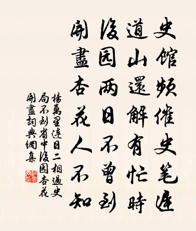 詩詞名句歷史字典書法欣賞書法字典國語詞典說文解字康熙字典古漢語字典標 題 作 者 詩 句 連日二相過史局,不到省中,後園杏花開盡作者:楊萬里 朝代:宋代原文史館頻催史筆遲,道山還解有忙時。後園兩日不曾到,開盡杏花人不知。詩詞問答問:《連日二相過史局,不到省中,後園杏花開盡》的作者是誰?答:楊萬里問:該詩寫於哪個朝代?答:宋代問:楊萬里的名句有哪些?答:楊萬里名句大全書法欣賞連日二相過史局,不到省中,後園杏花開盡書法作品詩詞推薦次韻錢德循鹿苑灘艤舟有作黃庭堅〔宋代〕鹿苑灘頭秋月明,使君輟棹愛江清。塵埃一段思歸路,已聽荊州漁鼓鳴。贈岩電道人王炎〔宋代〕胸次有藻鑒,聲行朝野間。我來勾踐國,君住少微山。青眼肯相顧,白頭今得閒。窮通無可問,歸去掩雲關。【中呂】紅繡鞋 春景吳西逸〔元代〕楊柳岸鞦韆高架,梨花院仕女雙丫,玉纖輕按小琵琶。花明春富貴,響玉交加,東風人信馬。 山居 蕨薇嫩子溫以詩將菊本見遺數日適病伏枕今少間戲作毛滂〔宋代〕更作天隨求枸杞,試從子美覓黃精。但知一飽輕方丈,不為秋毫要眼明。晚興陸游〔宋代〕壯遊車轍遍天涯,晚落農桑不自知。許國雖堅身遽老,讀書未倦眼先衰。雲深嶺路樵歸晚,雨細江亭渡發遲。一事次韻崔同年馬上口占二首李新〔宋代〕底事安仁易白頭,一鞭行色伴清鷗。抽身簿領窮清興,唯有江天倒射眸。次王玠投贈韻三首劉克莊〔宋代〕在野宜賡擊壤歌,隱憂不禁畝忠何。殷生宰相安知否,逸少群賢感慨多。老覺鬢絲難掩覆,窮惟心鐵未消磨。早知第二回回頭詩曹雪芹〔清代〕一局輸贏料不真,香銷茶盡尚逡巡。欲知目下興衰兆,須問旁觀冷眼人。偶書黃庚〔宋代〕豪氣消磨盡,攜書客海濱。文章難遇主,天地不鄰貧。家累依劉表,妻兒笑買臣。彼蒼還可問,吾道幾時春。巫山一段雲姬翼〔元代〕弄玉歌清律,飛瓊舞散花。乾坤一色散銀霞。何處是仙家。表里纖塵不立。呈似太虛訊息。晃然高下盡玲瓏。神鬼和仲長統詩二首郭印〔宋代〕造化一機,乾坤一殼。死生蟲臂,勝負蝸角。達人於道,混混殊俗。瞽非喪明,刖非卞足。賊生戶牖,禍徵帷幄。將赴陳留寄心老陳與義〔宋代〕今日忽不樂,圖書從糾紛。不見汝州師,但見西來雲。長安豈無樹,憶師堂前柳。世路九折多,遊子百事醜。三年頌古七首離四句絕百非釋慧勤〔宋代〕美如西子離金閣,嬌似楊妃倚玉樓。猶把琵琶半遮面,不令人見轉風流。江城懷隱董嗣杲〔宋代〕病身尚蟄灌嬰城,歸夢長懸醒復成。衰鬢褵褷攙鶴瘦,安書隔闊見鴻驚。山遙晴有侵檐色,樹禿秋地撼野聲。只欲減字木蘭花王寂〔元代〕髻羅雙綰。灩灩修眸秋水翦。笑靨顰眉。無限閒愁總未知。虛檐月轉。一曲未終腸已斷。百斛明珠。買得尊前一醉酌別張子元二首李昴英〔宋代〕去冬初去國,逆旅等順境。禍機眾危之,沙蜮伺人影。拂衣肯同歸,荒驛燈夜永。幸脫妖蟆口,黑月重磨鏡。勤君水龍吟(雪)楊無咎〔宋代〕小軒瀟灑清宵午,風正緊、門深閉。藜床危坐,竹窗頻聽,春蟲撲紙。燈燼垂紅,篆煙消碧,衣輕如水。料飛花未上丁陸游〔宋代〕燎火書明中庭,書老槐泣殘書雨。白頭奉祀事,恐懼劇仰俯。三終樂在懸,再拜書升俎。誰言千載後,恍若到鄒魯金剛隨機無盡頌依法出生分第八釋印肅〔宋代〕寶施三千界,住相終成壞。離相達無餘,此是空知解。脫京口定計難文天祥〔宋代〕南北人人苦泣岐,壯心萬折誓東歸。若非斫案判生死,夜半何人敢突圍。名句推薦烹羊宰牛且為樂,會須一飲三百杯。李白《將進酒》 須作一生拚,盡君今日歡。牛嶠《菩薩蠻·玉爐冰簟鴛鴦錦》 晨起動征鐸,客行悲故鄉。溫庭筠《商山早行》 聞之而不見,雖博必謬;見之而不知,雖識必妄;知之而不行,雖敦必困。荀子《荀子·儒效》 人間之水污濁,在野外者清潔,俱為一水,源從天涯,或濁或清,所在之勢使之然也。王充《論衡·卷二·率性篇》 積雪覆平皋,飢鷹捉寒兔。孟浩然《南歸阻雪》 莫道讒言如浪深,莫言遷客似沙沉。劉禹錫《浪淘沙九首》 因病得閒殊不惡,安心是藥更無方。蘇軾《病中游祖塔院》 使君憐小阮,應念倚門愁。李嘉祐《送王牧往吉州謁王使君叔》 見性志誠,念念回首處,即是靈山。吳承恩《西遊記·第二十四回》