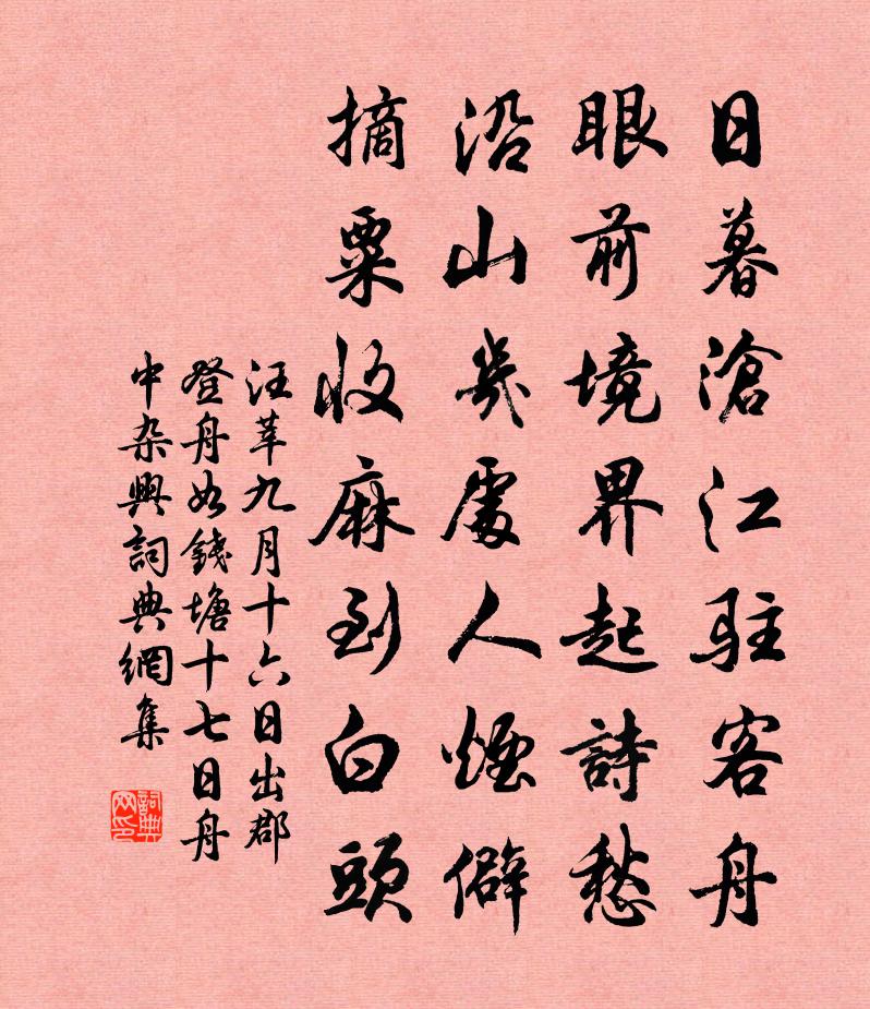 詩詞名句歷史字典書法欣賞書法字典國語詞典說文解字康熙字典古漢語字典標 題 作 者 詩 句 九月十六日出郡登舟如錢塘十七日舟中雜興作者:汪莘 朝代:宋代原文日暮滄江駐客舟,眼前境界起詩愁。沿山幾處人煙僻,摘粟收麻到白頭。詩詞問答問:《九月十六日出郡登舟如錢塘十七日舟中雜興》的作者是誰?答:汪莘問:該詩寫於哪個朝代?答:宋代書法欣賞九月十六日出郡登舟如錢塘十七日舟中雜興書法作品詩詞推薦龍巖寺孫懋〔宋代〕蒼林翠碧龍巖寺,縣令三年兩度來。從此岩前花與草,只今時與夢徘徊。延平粹廳十詠天開圖畫陳宓〔宋代〕通衢亘其南,危樓冠其北。如何境日新,煙云為筆墨。乞藥有感呈梅聖俞歐陽修〔宋代〕宣州紫沙合,圓若截郫筒。偶得今十載,走宦南北東。持之聖俞家,乞藥戒羸僮。聖俞見之喜,遽以手磨礱。謂此九月菊花詠應制(一作清江詩)廣宣〔唐代〕可訝東籬菊,能知節候芳。細枝青玉潤,繁蕊碎金香。爽氣浮朝露,濃姿帶夜霜。泛杯傳壽酒,應共樂時康。哭虔州楊侍郎(虞卿)李商隱〔唐代〕漢網疏仍漏,齊民困未蘇。如何大丞相,翻作弛刑徒。中憲方外易,尹京終就拘。本矜能弭謗,先議取非辜。巧有王提刑輓詞樓鑰〔宋代〕伯仲三珠樹,優為一世才。人琴先起恨,金玉遂俱摧。南阮方深痛,阿連尤可哀。桃花源上路,老眼更堪開。夔門邂逅同年汪丈議示詩和吟三首程公許〔宋代〕萬里吳天問去程,停橈峽口約偕行。蒼顏相對曾相識,千佛經中記姓名。參議林郎中蓄乘軒君向來止有其一今日見之乃喻良能〔宋代〕物情非耦不能久,並蒂芙蓉亦自變。珍重鶴君新得配,故應清唳徹秋江。雨中招張司業宿白居易〔唐代〕過夏衣香潤,迎秋簟色鮮。斜支花石枕,臥詠蕊珠篇。泥濘非游日,陰沉好睡天。能來同宿否,聽雨對床眠。宿橫溪橋華岳〔宋代〕夜宿橫溪煙靄間,眉頭歸路萬山攢。連天麥浪波千頃,撲地楊花雪一團。余鏹不供春後醖,夾衾猶怯夜來寒。征夫頌證道歌證道歌釋印肅〔宋代〕今日分明須剖析,天臨日照融光碧。擔板玄沙不許名,從古至今無影跡。嘗正仲所遺撥醅梅堯臣〔宋代〕屈原自著漁父篇,餔糟不及漁父賢。世無功名多浪死,劉伶阮籍於今傳。邇來獨酌邀明月,唯有青山李謫仙。謫仙侍太夫人拜掃先塋季直弟有詩因次其韻喻良能〔宋代〕東郊雲氣曉疏疏,十里相攜霽色初。林幄盡頭聞杜宇,荇絲深處見王餘。提壺相勸仍沽酒,扶杖來觀或荷鋤。不向追憶征西幕中舊事陸游〔宋代〕憶昨王師戍隴回,遺民日夜望行台。不論夾道壺漿滿,洛筍河魴次第來。召赴資政殿聽讀詩義感事吳充〔宋代〕雪銷鳷鵲御溝融,燕見殊恩綴上公。晝日乍驚三接寵,正風獲聽二南終。解頤共仰天顏喜,牆面裁容聖域通。午漏蒙恩監南嶽廟劉克莊〔宋代〕久問嫖姚乞退閒,今朝準敕放生還。人欺解罷青油幕,帝遣監臨紫蓋山。營卒展辭回玉帳,林僧講賀到柴關。丈夫萬年春 勸道友馬鈺〔元代〕去去來來,來來去去何時了。堪失笑。利名纏倒。衣換知多少。奉勸人人,早把元陽保。休虛耗。結成珍寶。得赴蒙泉熊禾〔宋代〕天池有佳水,雲氣護深山。我愛泓澄好,人嫌澤潤慳。暗空嗚滴滴,高壁瀉潺潺。漸近塵泥涴,何時復此還。祭酒芮公既歿四年門人呂某始以十詩哭之呂祖謙〔宋代〕先生墓木綠成圍,弟子摧頹晝掩扉。大雪繁霜心已死,有時清夢尚摳衣。句范習父〔宋代〕地收楚蜀西南水,天與江湖旦暮風。可笑祖龍游不得,欲於何處訪蓬萊。名句推薦梨花最晚又凋零,何事歸期無定準。歐陽修《玉樓春·去時梅萼初凝粉》 曾伴浮雲歸晚翠,猶陪落日泛秋聲。高蟾《金陵晚望》 君子以成德為行,日可見之行也。佚名《易傳·文言傳·乾文言》 記得去年今夕,釃酒溪亭,淡月雲來去。文徵明《念奴嬌·中秋對月》 信宿漁人還泛泛,清秋燕子故飛飛。杜甫《秋興八首》 漫向寒爐醉玉瓶,喚君同賞小窗明。陸游《浣溪沙·和無咎韻》 始於文而卒於武,天地之道也。佚名《黃帝四經·經法·論約》 力田已告成,計日宜收藏。黃燮清《秋日田家雜詠》 若菩薩有我相人相眾生相壽者相。即非菩薩。鳩摩羅什譯《金剛經·大乘正宗》 杖劍對尊酒,恥為遊子顏。陸龜蒙《別離》