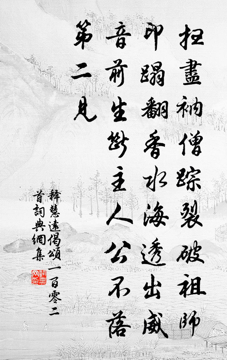詩詞名句歷史字典書法欣賞書法字典國語詞典說文解字康熙字典古漢語字典標 題 作 者 詩 句 偈頌一百零二首作者:釋慧遠 朝代:宋代偈頌一百零二首原文掃盡衲僧蹤,裂破祖師印。蹋翻香水海,透出威音前。生斷主人公,不落第二見。詩詞問答問:偈頌一百零二首的作者是誰?答:釋慧遠問:偈頌一百零二首寫於哪個朝代?答:宋代釋慧遠偈頌一百零二首書法欣賞偈頌一百零二首書法作品詩詞推薦鷓鴣天李景良〔宋代〕清曉祥雲繞碧天。老人星忽下南躔。庭蘭共酌長生酒,持上華堂彩侍前。開綺席,舞朱顏。輕紅蓮葉薦金盤。沉香次韻楚客方岳〔宋代〕戍角吹將短鬢華,此情付與酒生涯。兩淮無事山如畫,九日明朝菊未花。有客敲門緣問事,無田負郭卻思家。雁來別趙子(趙子名德,潮州人)韓愈〔唐代〕我遷於揭陽,君先揭陽居。揭陽去京華,其里萬有餘。不謂小郭中,有子可與娛。心平而行高,兩通詩與書。婆娑因夢得酬牛相公初到洛中小飲見贈白居易〔唐代〕淮南揮手拋紅旆,洛下回頭向白雲。政事堂中老丞相,制科場裡舊將軍。宮城煙月饒全占,關塞風光請半分。詩酒西湖陳師道〔宋代〕小徑才容足,寒花只自香。官池下鳧雁,荒冢上牛羊。有子吾甘老,無家去未量。三年喔五字,草木借輝光。秋日訪程元明喜雨而作王之道〔宋代〕去年夏六月,我來自臨安。滂沱一夜雨,原隰俱瀰漫。挽仰忽再秋,秋旱畝澮乾。嘉穀槁垂盡,萬口空長嘆。我從石鼓蘇轍〔宋代〕岐山之陽石為鼓,叩之不鳴懸無虡。以為無用百無直,以為有用萬物祖。置身無用有用間,自託周宣誰敢侮。宣王徐靈暉輓詞趙師秀〔宋代〕在生貧不害,早喪可嗟吁。天下黃金有,人間好句無。魂應湘水去,名與浪仙俱。平日惟耽茗,墳前種幾株。估客有自蔡州來者感悵彌日陸游〔宋代〕洮河馬死劍鋒摧,綠髮成絲每自哀。幾歲中原訊息斷,喜聞人自蔡州來。雜詩李復〔宋代〕陰陽體合氣,氛氳極無際。卦氣交孕毓,旁滋六爻備。聖人系爻辭,鉤賾推母子。觀應以知來,隨方推象類。靈龜次韻聰父見遺二首張元乾〔宋代〕十年遷客北歸時,旁海相逢嘆渺瀰。枝上煙光忙蛺蝶,尊中風味奪酴醿。老來詩思真枯井,別後心情似亂絲。喜故送蔡冠卿知饒州蘇軾〔宋代〕吾觀蔡子與人游,掀豗笑語無不可。平時倜儻不驚俗,臨事迂闊乃過我。橫前坑阱眾所畏,布路金珠誰不裹。爾來過蘭溪楊時〔宋代〕紛紛朝市競秋毫,江上霜風正怒號。不問揚瀾與彭浪,翩然東下日千艘。六言詩十首 其九嵇康〔兩漢〕老萊妻賢明。不願夫子相荊。相將避祿隱耕。樂道閒居采{艹/汧}。終厲高節不傾。贈鄉人周從龍談命劉過〔宋代〕廬陵儒萬人,頗亦出青紫。老子三不歸,未省鄉里士。暮年罕交遊,僅識子周子。風流屬當行,豈止談天爾。夜從鮮于伯機家釣台石戴表元〔宋代〕人間岩石亂紛紛,嚴子台名最喜聞。何術縮渠千里脈,有人分得兩峰雲。天邊路遠星還動,江上潮回日又曛。解道醉落魄/一斛珠周紫芝〔宋代〕雲深海闊。天風吹上黃金闕。酒醒不記歸時節。三十年來,往事無人說。浮生正似風中雪。丹砂豈是神仙訣。世間累年告老恩旨未俞詔領祠宮遂還鄉閈燕間無事蘇頌〔宋代〕我昔就學初,齠童齒未齔。嚴親念痴狂,小藝誘愚鈍。始時授章句,次第教篇韻。蒙泉企層瀾,覆簣期九仞。十齡宛陵館冬青樹(一作漢陰亭樹)趙嘏〔唐代〕碧樹如煙覆晚波,清秋欲盡客重過。故園亦有如煙樹,鴻雁不來風雨多。一葉舟侯善淵〔元代〕不覺形軀衰老。受盡許多縈惱。誰肯死前休。苦貪求。識破修行早早。認取自家珍寶。珍寶價無酬。永存留。名句推薦近來何處有吾愁,何處還知吾樂。辛棄疾《念奴嬌·賦雨岩》 今我來思,雨雪載途。佚名《出車》 少年射虎名豪,等閒赤羽千夫膳元好問《水龍吟·從商帥國器獵於南陽同仲澤鼎玉賦此》 漁父天寒網罟凍,莫徭射雁鳴桑弓。杜甫《歲晏行》 霜草蒼蒼蟲切切,村南村北行人絕。白居易《村夜》 一曲高歌一樽酒,一人獨釣一江秋。王士禎《題秋江獨釣圖》 水晶簾不下,雲母屏開,冷浸佳人淡脂粉。晁補之《洞仙歌·泗州中秋作》 舉棋不定,不勝其耦。左丘明《左傳·襄公·襄公二十五年》 涉江采芙蓉,蘭澤多芳草。佚名《涉江采芙蓉》 發號施令,若汗出於體,一出而不復也。吳兢《貞觀政要·卷八·論赦令》
