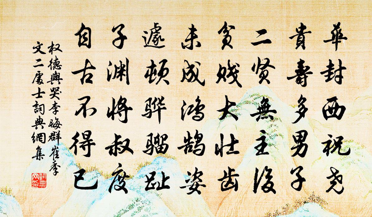 詩詞名句歷史字典書法欣賞書法字典國語詞典說文解字康熙字典古漢語字典標 題 作 者 詩 句 哭李晦群崔季文二處士作者:權德輿 朝代:唐代哭李晦群崔季文二處士原文華封西祝堯,貴壽多男子。二賢無主後,貧賤大壯齒。未成鴻鵠姿,遽頓驊騮趾。子淵將叔度,自古不得已。詩詞問答問:哭李晦群崔季文二處士的作者是誰?答:權德輿問:哭李晦群崔季文二處士寫於哪個朝代?答:唐代權德輿哭李晦群崔季文二處士書法欣賞哭李晦群崔季文二處士書法作品注釋全唐詩:卷326-19詩詞推薦曲肱詩二十首白玉蟾〔宋代〕昔在青華第一宮,只緣醉後怒騎龍。傾翻半滴金瓶水,不覺人間雨發洪。送客游江南韓翃〔唐代〕南使孤帆遠,東風任意吹。楚雲殊不斷,江鳥暫相隨。月淨鴛鴦水,春生豆蔻枝。賞稱佳麗地,君去莫應知。送陳持中赴四明節推二首陳傅良〔宋代〕更無人未識東州,晚得吾宗第一流。編磬在縣金奏合,清冰出壑玉壺秋。喜才一見還分袂,懷欲多言但倚樓。亦有紹興祀九宮貴神十首佚名〔宋代〕惟天丕冒,彪列九神。財成元化,險驚下民。有酒斯旨,登牙苾芬。昭哉降鑒,茀祿來臻。九日懷襄陽盧明甫〔宋代〕峴山不可見,風景令人愁。宜城多美酒,歸與葛強游。送鄧州潘使君赴任武元衡〔唐代〕川陸一都會,旌旗千里舒。虎符中禁授,熊軾上流居。橘柚金難並,池塘練不如。春風行部日,應駐士元車。送友人上峽赴東川辭命白居易〔唐代〕見說瞿塘峽,斜銜灩預根。難於尋鳥路,險過上龍門。羊角風頭急,桃花水色渾。山回若鰲轉,舟入似鯨吞。岸合樵人十詠樵叟陸龜蒙〔唐代〕自小即胼胝,至今凋鬢髮。所圖山褐厚,所愛山爐熱。不知冠蓋好,但信煙霞活。富貴如疾顛,吾從老岩穴。挽余丞相四首彭龜年〔宋代〕憶昨隨南史,常窺侍帝坦。負牆須密命,垂涕進忠言。懇懇精誠到,巍巍廟社尊。至今天下誦,功業在調元。東村陸游〔宋代〕野人喜我偶閒遊,取酒匆匆勸小留。舍後攜籃挑菜甲,門前喚擔買梨頭。劉氏雙闕方信孺〔宋代〕雙闕岧嶢即是碑,天荒初破此娥眉。行人來往手加額,解說當年旌表時。滿江紅 至元十七年十一月十四日,夜夢丞相王惲〔元代〕其旁。炎急報至雲,有敵犯府城西面,公佩,集將領將出,予握玉魚一雙,跽請從行。公曰不遲不遲,因朗育一樂送和仲寬壽陽尉方回〔宋代〕青衫淝水去,亦足慰高年。縣以州名壽,官於尉號仙。戰場潛鬼火,耕野起人煙。彩棒無勞設,蒲輪下九天。慶東宮生辰四首周必大〔宋代〕季秋日在房,房心乃明堂。煌煌心前星,於茲侍天王。休符協上象,九月誕元良。太史言有證,重暉照無疆。除夜會飲南湖懷王鞏蘇轍〔宋代〕歲晚城東故相家,夜聽簾外落瓊花。醉眠東閣銀釭暗,起視中庭內竹斜。魯酒近來無奈薄,秦箏別後苦聞夸。思君和闕乾雪中韻李曾伯〔宋代〕夜來白鳳下天潢,幻得人間玉樣光。萬里園林變春景,幾家籬客失秋香。黃紬歌枕水為骨,紙帳吟梅鐵作腸。爭似固城湖陽枋〔宋代〕溪平岸闊柳侵沙,潑潑游鱗弄月華。柔櫓數聲深夜悄,漁人相喚隔蘆葭。送僧釋重顯〔宋代〕帆掛澄江雨霽時,綠鋪春岸草離離。定乾坤句輕相送,逢著知音舉向伊。次韻王才元少師借園李彌遜〔宋代〕春風朱雀橋邊路,只許游蜂獨往來。□□園花兼巷柳,卻尋芳事到酴醿。秋日晨起陸游〔宋代〕翻樹鴉知旦,橫空雁戒寒。但欣蘇肺渴,未暇議衣單。粥鼎湯初沸,香篝火半殘。讀書心漸嬾,顧影一長嘆。名句推薦老去悲秋強自寬,興來今日盡君歡。杜甫《九日藍田崔氏莊》 我心匪石,不可轉也。佚名《柏舟》 誰向孤舟憐逐客?白雲相送大江西。李攀龍《送明卿之江西》 白鳥明邊帆影直。隔江聞夜笛。周密《聞鵲喜·吳山觀濤》 流星飛玉彈,寶劍落秋霜。張玉娘《從軍行》 梧桐葉上,點點露珠零。尹鶚《臨江仙·深秋寒夜銀河靜》 雪沫乳花浮午盞,蓼茸蒿筍試春盤。蘇軾《浣溪沙·細雨斜風作曉寒》 名不正,則言不順;言不順,則事不成孔子弟子《論語·子路篇》 雲橫秦嶺家何在?雪擁藍關馬不前。韓愈《左遷至藍關示侄孫湘》 君子耳不聽淫聲,目不視邪色,口不出惡言荀子《荀子·樂論》