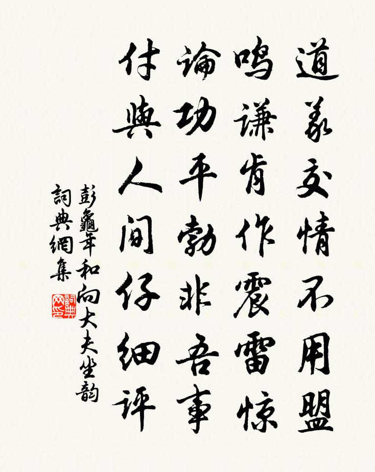 詩詞名句歷史字典書法欣賞書法字典國語詞典說文解字康熙字典古漢語字典標 題 作 者 詩 句 和向大夫坐韻作者:彭龜年 朝代:宋代和向大夫坐韻原文道義交情不用盟,鳴謙肯作震雷驚。論功平勃非吾事,付與人間仔細評。詩詞問答問:和向大夫坐韻的作者是誰?答:彭龜年問:和向大夫坐韻寫於哪個朝代?答:宋代彭龜年和向大夫坐韻書法欣賞和向大夫坐韻書法作品詩詞推薦解綰歸至永豐繼善伯熊寶臣敦禮昆仲皆化去曾豐〔宋代〕新自梅關返葛溪,天心不與我心違。市廛城郭依元在,親戚交遊過半非。紙上銜猶仍舊署,腰間帶已減初圍。候門雜曲歌辭火鳳辭李百藥〔唐代〕歌聲扇里出,妝影扇中輕。未能令掩笑,何處欲鄣聲。知音自不惑,得念是分明。莫見雙嚬斂,疑人含笑情。佳人重和韓偓〔唐代〕冷宴殷勤展小園,舞鞇柔軟彩虬盤。篸花盡日疑頭重,病酒經宵覺口乾。嘉樹倚樓青瑣暗,晚雲藏雨碧山寒。文章薊丘覽古贈盧居士藏用之六 鄒衍陳子昂〔唐代〕大運淪三代。天人罕有窺。鄒子何寥廓。漫說九瀛垂。興亡已千載。今也則無推。山寺老僧李洞〔唐代〕雲際眾僧里,獨攢眉似愁。護茶高夏臘,愛火老春秋。海浪南曾病,河冰北苦游。歸來諸弟子,白遍後生頭。過三郊驛卻寄楊評事時此子郭令公欲有表薦耿湋〔唐代〕冉冉青衫客,悠悠白髮人。亂山孤驛暮,長路百花新。終歲行他縣,全家望此身。更思君去就,早晚問平津。哨遍·高祖還鄉睢景臣〔元代〕社長排門告示,但有的差使無推故,這差使不尋俗。一壁廂納草也根,一邊又要差夫,索應付。又是言車駕,都說頌古三十九首釋道樞〔宋代〕等閒一問垂千古,從此叢林共播揚。堪笑睦州無相度,{左飠右畢}{左飠右羅}{左飠右追}子要先嘗。倉部弟生日五絕劉克莊〔宋代〕郎宿臨初度,村翁喜欲顛。要知儂甲子,老弟已稀年。紹興淳熙分命館職定撰十七首佚名〔宋代〕[太簇為徽]休德孔昭,靈承上帝。孝極尊觀,嚴配於位。嘉芳芬芳,禮無不備。神其格思,享茲誠至。趙正則司戶沿檄而歸玉蕊已過追賦車字韻詩奉周必大〔宋代〕春深遊客競繁華,寶馬香輪帶麴車。不為來看招隱樹,有誰肯顧野人家。飛飛粉蝶須相映,皎皎銀蟾色共夸。今得次王帥韻陳造〔宋代〕使君觴客及公榮,慰我他時渴德深。已為穆生重設醴,更聞正始嗣遺音。打圍紅袖留連舞,論檻黃花取次簪。恰似寄中嶽顓頊先生張喬〔唐代〕先生顓頊後,得道自何人。松柏卑於壽,兒孫老卻身。夜窗峰頂曙,寒澗洞中春。戀此逍遙境,雲間不可親。西湖小隱周文璞〔宋代〕先帝何曾寵幸臣,家園籍沒幾經春。一丘賜與嬋娟魄,教主西湖似洛神。重陽後絕句五首方回〔宋代〕梧桐疏葉間微黃,年例江南未肯涼。菊自此花三兩月,樽前日日是重陽。秀聚亭陳瓘〔宋代〕曉色春風裡,維舟一小亭。看山渾不倦,待得雪峰青。題巫山瞻華亭鄧諫從〔宋代〕崚贈玉削三千丈,翠潑嵐光冷相向。風含太古雲氣長,變化溟濛紛萬象。陰晴一日肯四時,天籟壑深虛自響。神山偈頌四十一首釋慧暉〔宋代〕花落秦川流水香,雨清荷玉妙珠藏。只么堂堂訊息子,見來一點不相當。靜夜鐘聲樓上冷,殘春岑色付紅陽。好是飲酒二十首同蘇翰林先生次韻追和陶淵明九晁補之〔宋代〕城東故鹽渠,自昔誰所開。似說全盛時,邈焉一長懷。穿渠引江水,此計未為乖。千帆競暮入,集浦如烏棲。萬疇王正道再遇竹冠輒和來韻見鄙愫二首曹勛〔宋代〕先生有號復有官,不畏隆暑兼冬寒。歸來山中侶松檜,無愧太上翔雲冠。我比同庵有餘樂,雲山百好無一惡。喜君名句推薦赤壁磯頭,一番過、一番懷古。戴復古《滿江紅·赤壁懷古》 葉落風不起,山空花自紅。陳師道《妾薄命·為曾南豐作》 聖人忘情,最下不及情;情之所鍾,正在我輩。劉義慶《世說新語·傷逝》 春風不解禁楊花,濛濛亂撲行人面。晏殊《踏莎行·小徑紅稀》 練於骨者,析辭必精;深乎風者,述情必顯。劉勰《文心雕龍·風骨》 三冬暫就儒生學,千耦還從父老耕。陸游《觀村童戲溪上》 青山橫北郭,白水繞東城李白《送友人》 秋寂寞,秋風夜雨傷離索孫道絢《憶秦娥·季溫老友歸樵陽人來閒書因以為寄》 東風不與周郎便,銅雀春深鎖二喬。杜牧《赤壁》 君在天一涯,妾身長別離。江淹《古離別》