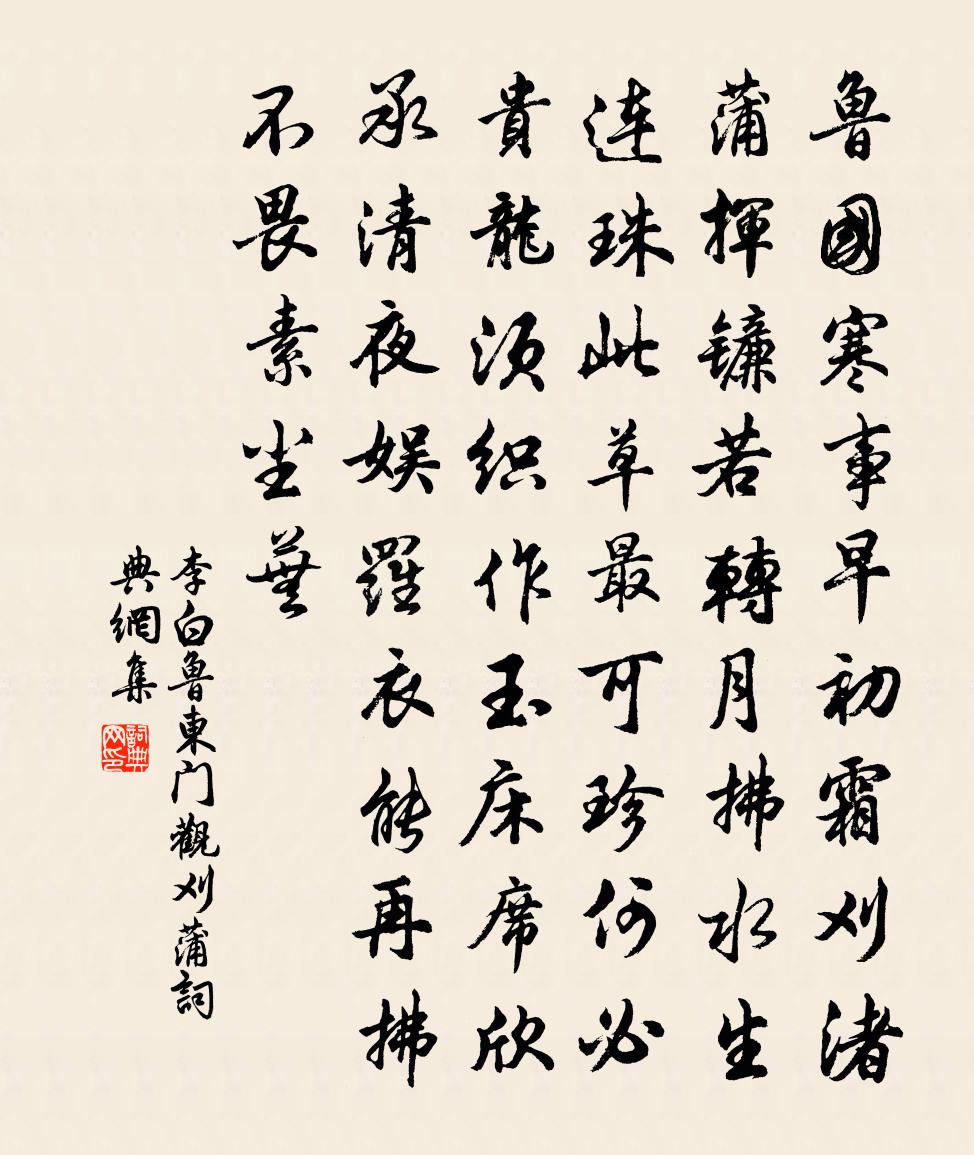 魯國寒事早,初霜刈渚蒲。揮鐮若轉月,拂水生連珠。