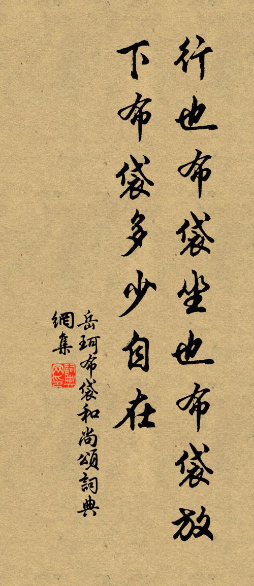 詩詞名句歷史字典書法欣賞書法字典國語詞典說文解字康熙字典古漢語字典標 題 作 者 詩 句 布袋和尚頌作者:岳珂 朝代:宋代布袋和尚頌原文行也布袋,坐也布袋。放下布袋,多少自在。詩詞問答問:布袋和尚頌的作者是誰?答:岳珂問:布袋和尚頌寫於哪個朝代?答:宋代岳珂布袋和尚頌書法欣賞布袋和尚頌書法作品詩詞推薦游東陽涵碧亭劉夢得所賦詩也明日過中興寺游王銍〔宋代〕我游東陽城,隱侯昔所制。山川無古今,城邑有存廢。夢寐涵碧亭,草間得遺記。飛流落天明,噴灑寒玉碎。停車飲於梅山弟家醉書八首陳著〔宋代〕有約相過亭午天,日斜猶在酒杯閒。遲遲要待月明去,意在弟兄非在山。同德寺閣集眺韋應物〔唐代〕芳節慾雲晏,游遨樂相從。高閣照丹霞,飀飀含遠風。寂寥氛氳廓,超忽神慮空。旭日霽皇州,岹嶢見兩宮。嵩少畫堂春令/畫堂春王詵〔宋代〕畫堂霜重曉寒消,南枝紅雪妝成。捲簾疑是弄妝人。粉面帶春醒。最愛北江臨岸,含嬌淺淡精神。微風不動水紋平觀柘枝舞二首劉禹錫〔唐代〕胡服何葳蕤,仙仙登綺墀。神飆獵紅蕖,龍燭映金枝。垂帶覆纖腰,安鈿當嫵眉。翹袖中繁鼓,傾眸溯華榱。燕秦同武平一員外游湖五首時武貶金壇令儲光羲〔唐代〕紅荷碧筱夜相鮮,皂蓋蘭橈浮翠筵。舟中對舞邯鄲曲,月下雙彈盧女弦。青林碧嶼暗相期,緩楫揮觥欲賦詩。借問再疊仇遠〔宋代〕醉眠春一榻,不記夢伊何。落月明紅葉,寒廳暗綠莎。敝袍為客久,高枕閱人多。未有匡時策,無心中甲科。清老畫雙溪壁以詩謝之王炎〔宋代〕老夫喔詩聳兩肩,落筆不停稱腹稿。緣詩寫出無聲句,畫史追之誰得到。為予壁上留真跡,水墨纖穠任揮掃。石根上雲樂 桐柏曲蕭衍〔南北朝〕桐柏真。升帝賓。戲伊谷。游洛濱。參差列鳳管。容與起梁塵。望不可至。徘徊謝時人。苦雨中又作四聲詩寄魯望平去聲皮日休〔唐代〕狂霖昏悲吟,瘦桂對病臥。檐虛能彯斜,舍蠹易漏破。宵愁將琴攻,晝悶用睡過。堆書仍傾觴,富貴未換個。庚午歲九日作齊己〔唐代〕門底秋苔嫩似藍,此中訊息興何堪。亂離偷過九月九,頭尾算來三十三。雲影半晴開夢澤,菊花微暖傍江潭。故人和元厚之平羌王珪〔唐代〕詔收新土鳳林東,四百年來一戰功。蔥嶺自橫秦塞上,金城還落漢圖中。輕裘坐款無遺策,折箭來庭有舊風。零雨題李凝幽居賈島〔唐代〕閒居少鄰並,草逕入荒園。鳥宿池邊樹,僧敲月下門。過橋分野色,移石動雲根。暫去還來此,幽期不負言。送句湛太博通守汝陰蘇頌〔宋代〕天漢南通潁水清,新恩監郡赴官榮。數舟旗鼓家人喜,兩岸壺漿父老迎。暫試吏能收治績,蚤聞時譽伏朝纓。十年送丁高士釋心月〔宋代〕霞服雲冠游上苑,芒鞋竹杖過幽扉。故山青草累累冢,羞見先生化鶴歸。暮春感懷呈勿齋提舉釋斯植〔宋代〕浮世事非真,吟多白髮新。身居京寺久,夢到石橋頻。日落煙生樹,花殘草自春。坐看今夜月,應與舊房鄰。范參政自建康得資政宮祠六詩寄呈趙蕃〔宋代〕山處如公亦甚都,不攜西子不思鱸。三高異日當為四,不見方嚴與范俱。觀化十五首黃庭堅〔宋代〕風煙漠漠半陰晴,人道春歸不見形。嫩草已侵水面綠,平蕪還破燒痕青。孫景赴懷寧尉宋祁〔宋代〕一行為吏日,千里背淮人。蘭助朝昏膳,絲垂宛轉綸。雲容侵驛曉,江熊引帆春。靜治龍舒邑,氂生盜向秦。小桃值風零落殆盡偶成鄙句奉呈諸君強至〔宋代〕小桃庭前祗一株,無數花開艷新繡。破蕊脈脈向人笑,鬧枝酣酣索春鬧。只見蜜蜂來往喧,不道雙燕共時候。醉吟名句推薦斜陽草樹,尋常巷陌,人道寄奴曾住。辛棄疾《永遇樂·京口北固亭懷古》 百里不販樵,千里不販糴。司馬遷《史記·七十列傳·貨殖列傳》 漸秋闌、雪清玉瘦,向人無限依依。李清照《多麗·詠白菊》 且看欲盡花經眼,莫厭傷多酒入唇。杜甫《曲江二首》 開到荼蘼花事了。曹雪芹《紅樓夢·第六十三回》 昔年多病厭芳尊,今日芳尊惟恐淺。錢惟演《木蘭花·城上風光鶯語亂》 多少天涯未歸客,盡借籬落看秋風。唐寅《菊花》 新寒中酒敲窗雨,殘香細裊秋情緒。納蘭性德《菩薩蠻·新寒中酒敲窗雨》 民之無良,相怨一方,受爵不讓,至於己斯亡。荀子《荀子·儒效》 馬先馴而後求良,人先信而後求能。劉安及其門客《淮南子·說林訓》