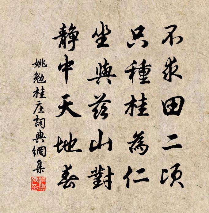 詩詞名句歷史字典書法欣賞書法字典國語詞典說文解字康熙字典古漢語字典標 題 作 者 詩 句 桂莊作者:姚勉 朝代:宋代桂莊原文不求田二頃,只種桂為仁。坐與茲山對,靜中天地春。詩詞問答問:桂莊的作者是誰?答:姚勉問:桂莊寫於哪個朝代?答:宋代姚勉桂莊書法欣賞桂莊書法作品詩詞推薦滿江紅 次李沁州見寄韻許有壬〔元代〕一夜繁霜,便染得、乾坤澄寂。秋滿眼、蕭蕭雲樹,淒淒風日。山色偏供羈旅恨,年光肯為英雄息。只寒花、不減贈白闍梨陳師道〔宋代〕瓶錫倦西東,歸來一榻空。宗乘能自判,文學更兼通。講徹夜堂月,定回枯樹風。無從參淨社,回首倦飛蓬。送陳君子之四明龔宗元〔宋代〕短亭祖帳接平川,柳拂回波擊畫船。漸向落暉分繡袖,忍聽離曲怨鵾弦。雲連稽嶺應懷古,路近花源好訪仙。那更復如嚴陵就省先墓方回〔宋代〕暮景能幾何,行役復行役。薄命不由人,豈不願休息。江鄂訪知舊,不遇悔浪出。子舍寓嚴瀨,逋負日夜迫。老夫詔修兩朝國史開局日賜筵史院和首相吳公席上元絳〔宋代〕殿帷昕對罷,省戶兩陰餘。詔賜堯尊酒,人探禹穴書。夔龍方客右,班馬蓋徒歟。徑醉俄歸弁,雲西見日車。嵩山十志十首洞元室盧鴻一〔唐代〕嵐氣肅兮岩翠冥,空陰虛兮戶芳迎。披蕙帳兮促蘿筵,談空空兮核元元。蕙帳蘿筵兮洞元室,秘而幽兮真可吉。返月夜阻風,泊舟太湖石塘南頭四首楊萬里〔宋代〕過湖未得匹如閒,何幸湖心泊畫船。宇宙中間都是月,波濤外面更無天。誰知造物將奇觀,不與傖人付謫仙。管領秦王卷衣文同〔宋代〕鹹陽秦王家,宮闕明曉霞。丹文映碧鏤,光采相鉤加。銅螭逐銀猊,壓屋矜蟠拿。洞戶鎖日月,其中光景賒。春風泊唐棲寺釋行海〔宋代〕颯颯寒聲折葦風,唐棲岸下泊孤篷。白頭不見頤山老,寂寞門前楓葉紅。最明寺殿真像贊釋普寧〔宋代〕掌持國土,天下安堵。信向佛法,運心堅固。德重丘山,名播寰宇。清白傳家,望隆今古。參透吾宗,眼眉卓豎。友人惠石兩峰巉然取杜子美玉山高並兩峰寒之陳與義〔宋代〕舊喜看書今不看,且留雙眼向孱顏。從來作夢大槐國,此去藏身小玉山。暮靄朝曦一生子,高天厚地兩峰閒。九華述志詩 其一嵇康〔兩漢〕潛龍育神軀。躍鱗戲蘭池。延頸慕大庭。寢足俟皇羲。慶雲未垂景。盤桓朝陽陂。悠悠非吾匹。疇肯應俗宜。殊類皇雅十首《西師》六章尹洙〔宋代〕蜀都既平,將臣失律。此眾悍驕,彼民危栗。當塗叫呶,合萬為一。匪懷則威,帝心是恤。送張調參軍侍從歸覲荊南因寄長林司空十四曙(得潛字)盧綸〔唐代〕玉勒侍行襜,郗超未有髯。守儒輕獵騎,承誨訪沈潛。雲勢將峰雜,江聲與嶼兼。還當見王粲,應念二毛添。將歸山招冰僧盧仝〔唐代〕買得一片田,濟源花洞前。千里石壁坼,一條流泌泉。青松盤樛枝,森森上插青冥天。枝上有□猿,宿處近鶴巢,病起覽鏡二首楊萬里〔宋代〕覽鏡忽自問,何方一病翁。生涯管城外,本貫醉鄉中。筆硯今都廢,尊罍久屢空。又將數莖雪,憔悴見西風。行路難賀鑄〔宋代〕驚飈獵榛莽,西山匿頹陽。四五陰魄晚,繁星亦光芒。驅車何所投,卻顧歸路長。挾轅兩羸牸,犯此豺虎場。安得頌古九首釋普信〔宋代〕漁翁瀟灑任東西,蘆管橫吹韻不齊。夜靜月明魚不食,扁舟臥入武陵溪。踏莎行蔡伸〔宋代〕水滿青錢,煙滋翠葆。殘英滿地無人掃。先來羈思亂如雲,無端更被春酲惱。疊疊遙山,綿綿遠道。憑闌滿目唯芳南華書事詩朱翌〔宋代〕火樹燒春明躑躅,紫羅囊筆綴辛夷。花枝照眼蒙清潤,帶雨游山亦自奇。名句推薦落日暴風雨,歸路繞汀灣蘇舜欽《水調歌頭·滄浪亭》 物莫非指,而指非指。公孫龍《公孫龍子·指物論》 落梅庭榭香,芳草池塘綠。晏幾道《生查子·落梅庭榭香》 還怕掩、深院梨花,又作故人清淚。吳文英《無悶·催雪》 男兒不展風雲志,空負天生八尺軀。馮夢龍《警世通言·卷四十》 驚起卻回頭,有恨無人省。蘇軾《卜運算元·黃州定慧院寓居作》 長江後浪推前浪,世上新人趕舊人。佚名《增廣賢文·上集》 城上高樓接大荒,海天愁思正茫茫。柳宗元《登柳州城樓寄漳汀封連四州》 羅袂從風輕舉,愁殺採蓮女!毛文錫《應天長·平江波暖鴛鴦語》 九萬里風鵬正舉。李清照《漁家傲·天接雲濤連曉霧》
