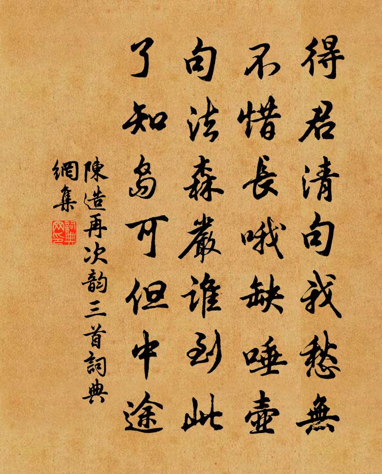 詩詞名句歷史字典書法欣賞書法字典國語詞典說文解字康熙字典古漢語字典標 題 作 者 詩 句 再次韻三首作者:陳造 朝代:宋代再次韻三首原文得君清句我愁無,不惜長喔缺唾壺。句法森嚴誰到此,了知島可但中途。詩詞問答問:再次韻三首的作者是誰?答:陳造問:再次韻三首寫於哪個朝代?答:宋代陳造再次韻三首書法欣賞再次韻三首書法作品詩詞推薦隋宮燕李益〔唐代〕燕語如傷舊國春,宮花一落已成塵。自從一閉風光後,幾度飛來不見人。齒痛冀其速落而不可得張嵲〔宋代〕慈子為牛真自取,逢分臥簀亦何哉。我今病落無多恨,況復終同短髮埋。奉符縣北二十里林家莊馬鋪壁間有草書數行半張耒〔宋代〕龍蛇半滅亭間字,泉壤長埋地下身。從此世間無玉樹,故人三嘆淚沾襟。拋球樂馮延巳〔唐代〕莫怨登高白玉杯,茱萸微綻菊花開。池塘水冷鴛鴦起,簾幕煙寒翡翠來。重待燒紅燭,留取笙歌莫放回。皇祐觀享明堂六首佚名〔宋代〕肅肅路寐,相維明堂。二信鑒止,三聖侑旁。靈期訴後,祠節齊莊。至誠閏貺,降福地疆。上李大參度正〔宋代〕雲間龍鶴隱峰巒,袖手何妨此考槃。秋老未須愁菊悴,春回寧復訝梅酸。風吹雁字成簪盍,雪壓鷗盟閱歲寒。萬卷蘆宋祁〔宋代〕裊娜脩莖青玉攢,鳧翁濯罷翠痕乾。湘君直寄江湖樂,要作風汀雨瀨看。早秋雨霽圖崔鶠〔宋代〕我離蜀山來,赤日走東州。奇峰作眼想,一過神已留。翩翩宋公子,新詩藹風流。丹青見新韻,瀟瀟出林丘。依微蝶戀花(商調柳·第四)周邦彥〔宋代〕小閣陰陰人寂後。翠幕褰風,燭影搖疏牖。夜半霜寒初索酒。金刀正在柔荑手。彩薄粉輕光欲透。小葉尖新,未放又吟富春沙際〔唐代〕莫問我姓名,向君言亦空。潮生沙骨冷,魂魄悲秋風。寄贈夢英大師陶谷〔宋代〕是個碑文念得全,聰明靈性自天然。離吳別楚三千里,入洛游梁二十年。負藝已聞喧世界,高眠長見臥雲煙。相逢浣溪沙魏了翁〔宋代〕試問伊誰若是班。二喬銅雀鎖孱顏。千年痕露尚餘潸。羞向眼前供嫵媚,獨於靜處愜幽嫻。人情多少逐河間。見率齋王簾使劉鑒〔宋代〕田園僅了都人役,事業全拋進士詩。白髮見公曾感慨,深衣重有道行進。讀吟嘯集彭秋宇〔宋代〕興廢明知數有天,臣心感激義當然。孔明尚欲西都蜀,王蠋寧甘北面燕。鳳鶴不靈淒落日,蛟龍已逝冷長川。丈夫上元夜效小庾體陳嘉言〔唐代〕今夜可憐春,河橋多麗人。寶馬金為絡,香車玉作輪。連手窺潘掾,分頭看洛神。重城自不掩,出向小平津。真如靖老請贊釋妙倫〔宋代〕夜叉心,菩薩面。動則雲翻大野鬼翻懼聞,靜則練繞長溪人皆喜見。有一道 * 呪,三千里外學念者也靈驗。金陵聽韓侍御吹笛李白〔唐代〕韓公吹玉笛,倜儻流英音。風吹繞鐘山,萬壑皆龍吟。王子停鳳管,師襄掩瑤琴。餘韻度江去,天涯安可尋。戲題趙畔道寓居壁間陳普〔宋代〕疏髯荊楚青油客,踏著天根息此堂。惹得深山狂簡子,年年來此道先生。送流人司空曙〔唐代〕聞說南中事,悲君重竄身。山村楓子鬼,江廟石郎神。童稚留荒宅,圖書託故人。青門好風景,為爾一沾巾。依韻和御製秋晚曲宴詩韓元吉〔宋代〕巍巍舜漢浹嘉生,宴俎豐年萬寶成。禁幄雲深開曉色,上林風迥起秋聲。威加鼉鼓雷霆轉,喜動龍旗日月明。應手名句推薦舟遙遙以輕颺,風飄飄而吹衣。陶淵明《歸去來兮辭·並序》 牛鳴而馬不應,非不聞牛聲也,異類故也。劉向《列女傳·辯通傳·齊孤逐女》 今日俸錢過十萬,與君營奠復營齋。元稹《遣悲懷三首·其一》 寧不知傾城與傾國。佳人難再得。李延年《李延年歌》 長風蕭蕭渡水來,歸雁連連映天沒。盧思道《從軍行》 講大經綸,只是實實落落;有真學問,決不怪怪奇奇。王永彬《圍爐夜話·第三一則》 相去日已遠,衣帶日已緩佚名《行行重行行》 江天一色無纖塵,皎皎空中孤月輪。張若虛《春江花月夜》 葉潤林塘密,衣乾枕席清。杜甫《水檻遣心二首》 亂點碎紅山杏發,平鋪新綠水蘋生。白居易《南湖早春》